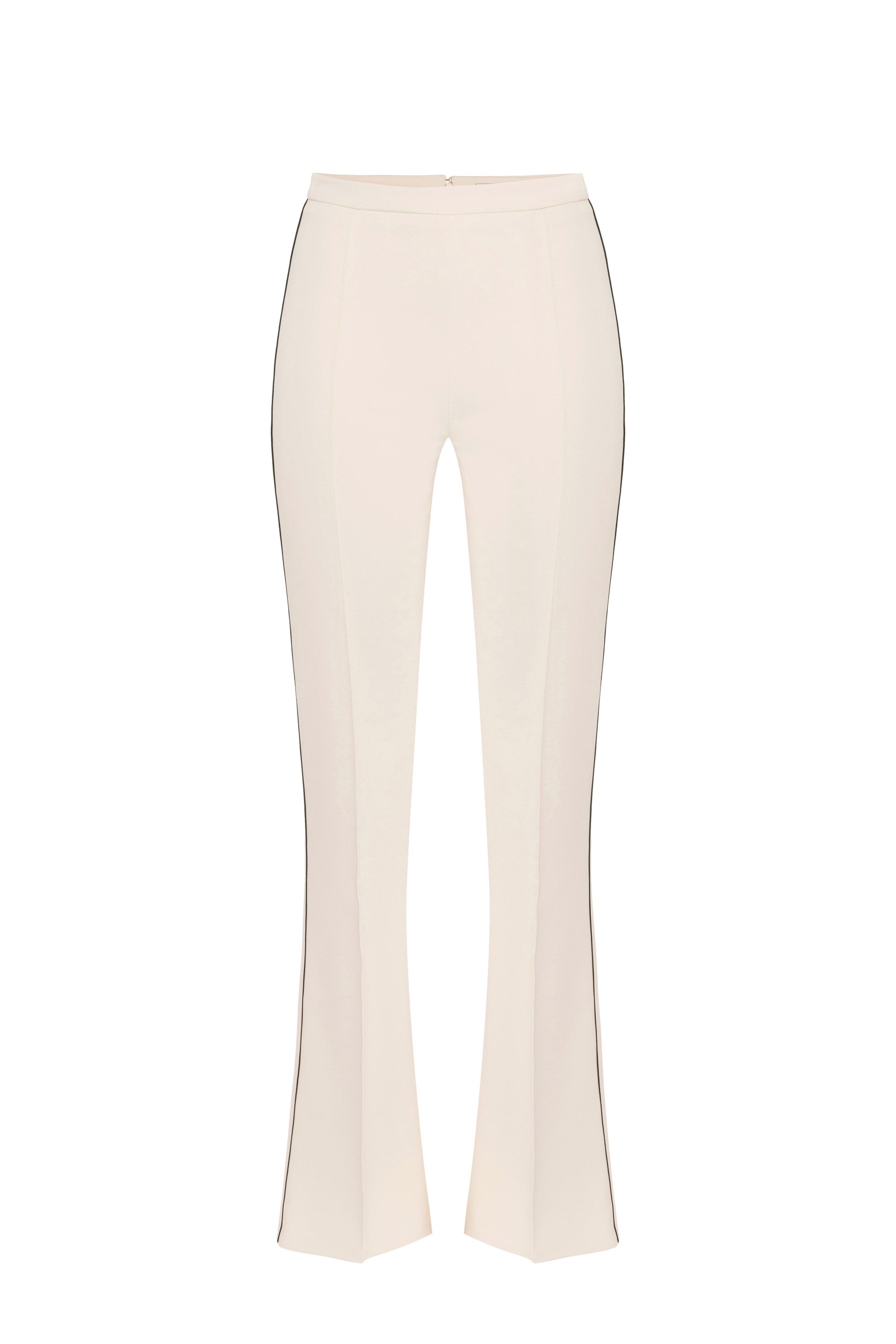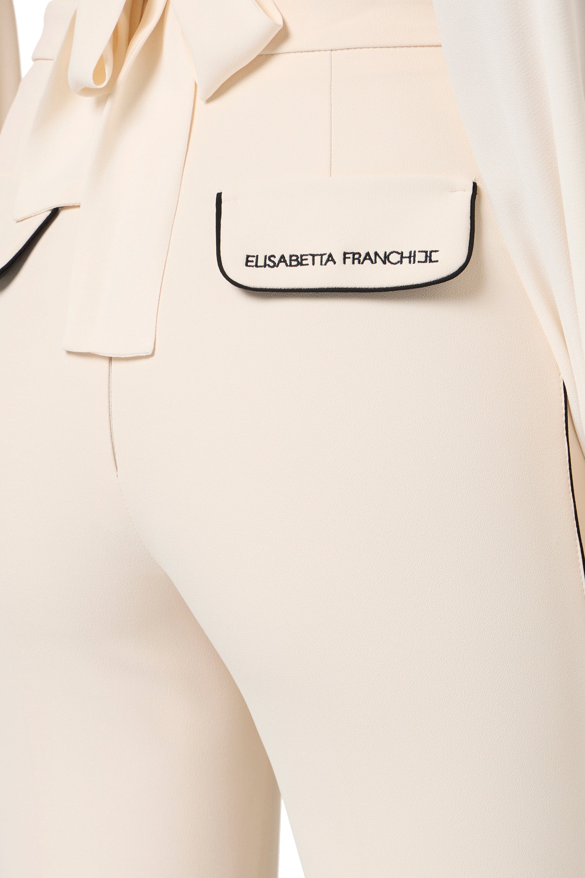 Lightweight stretch crêpe trousers with waistband and leg flared at the bottom. The contrasting piping details on the hips and in the back flaps provide a graphic touch to the garment. Thread-embroidered logo on one flap.