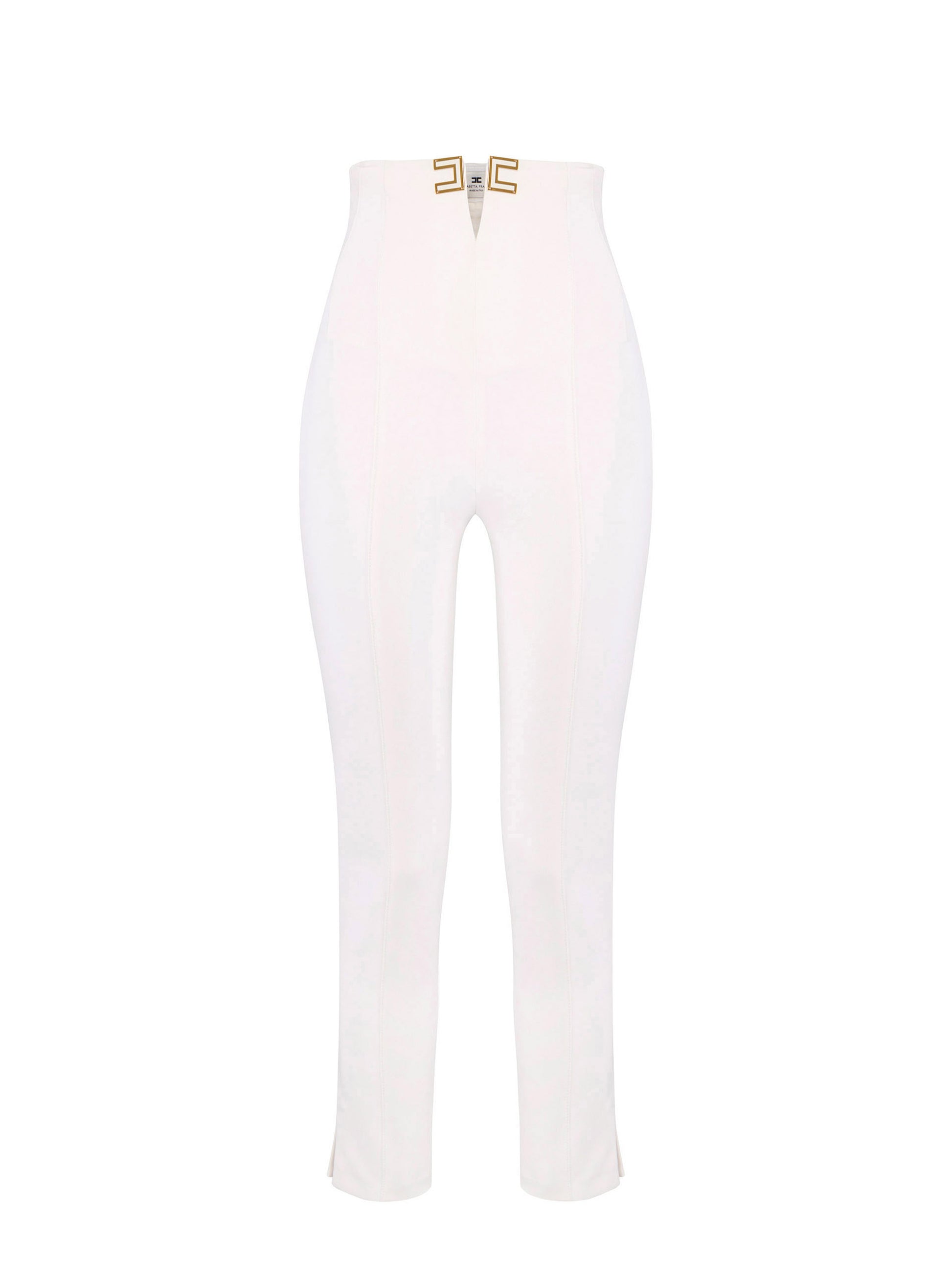 Trousers in double layer stretch crêpe. The waistline is characterised by the central V-shaped opening, decorated with golden metal logo details enamelled inside. Side slits at the leg bottom create a confident silhouette. Slim fit.