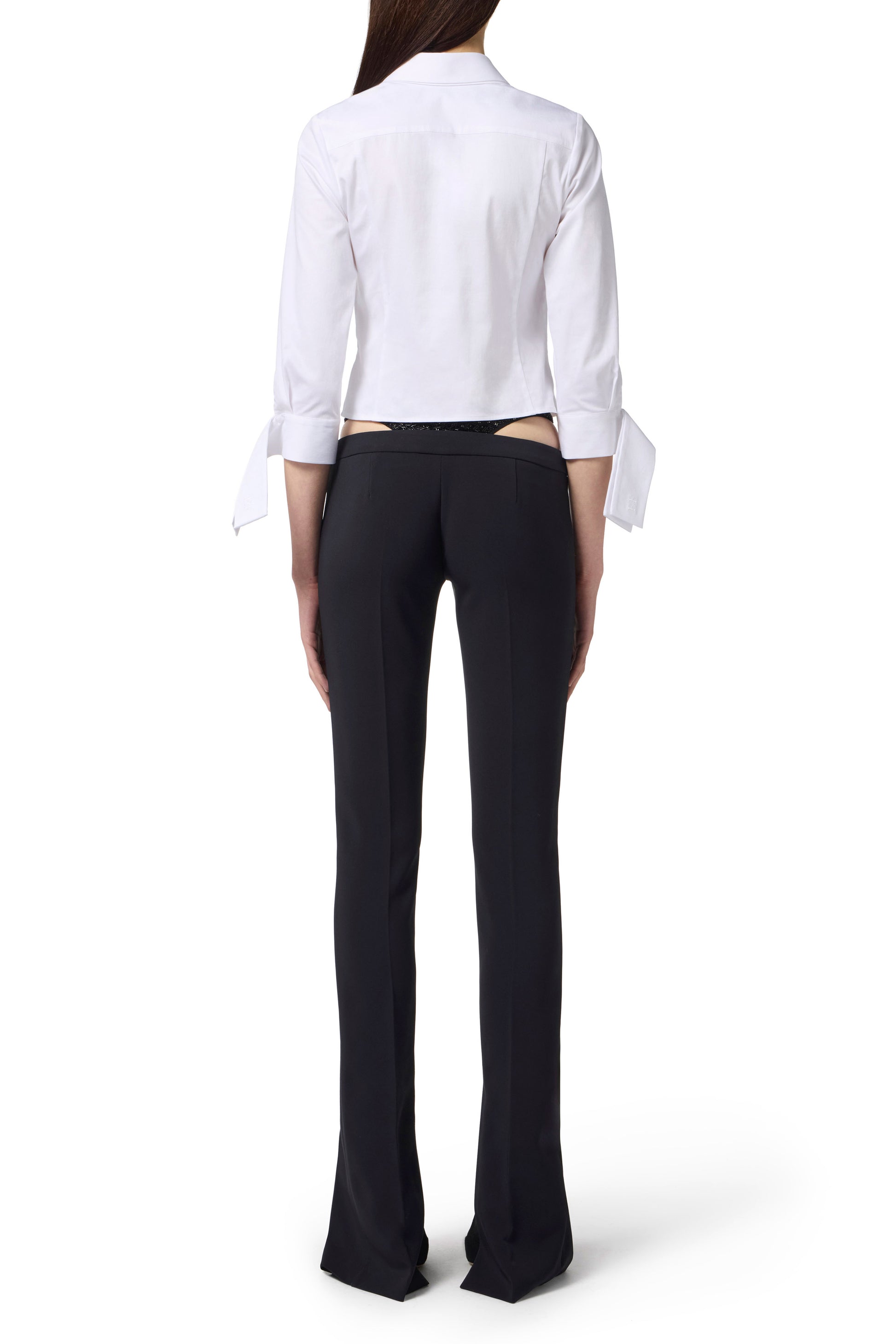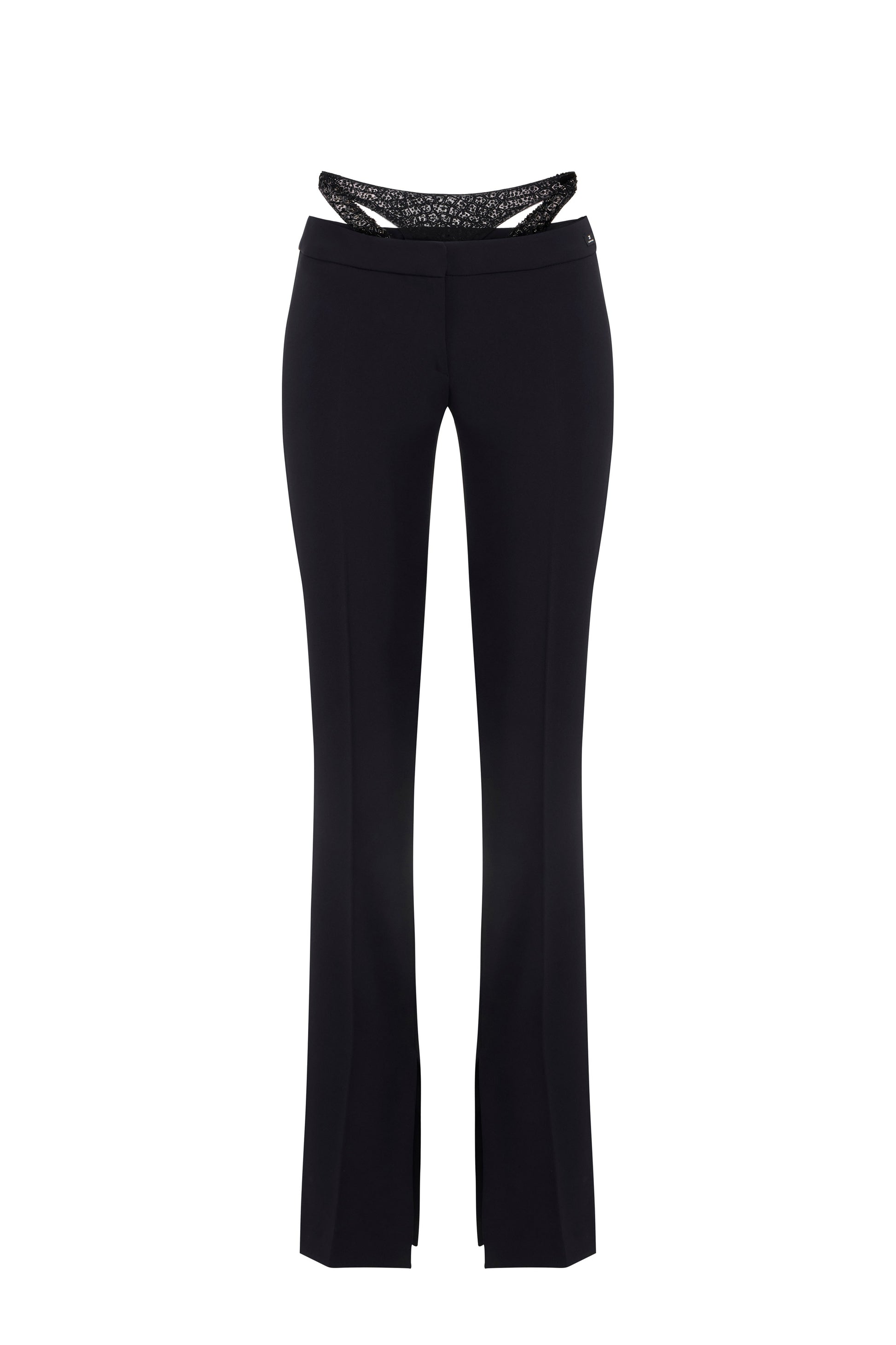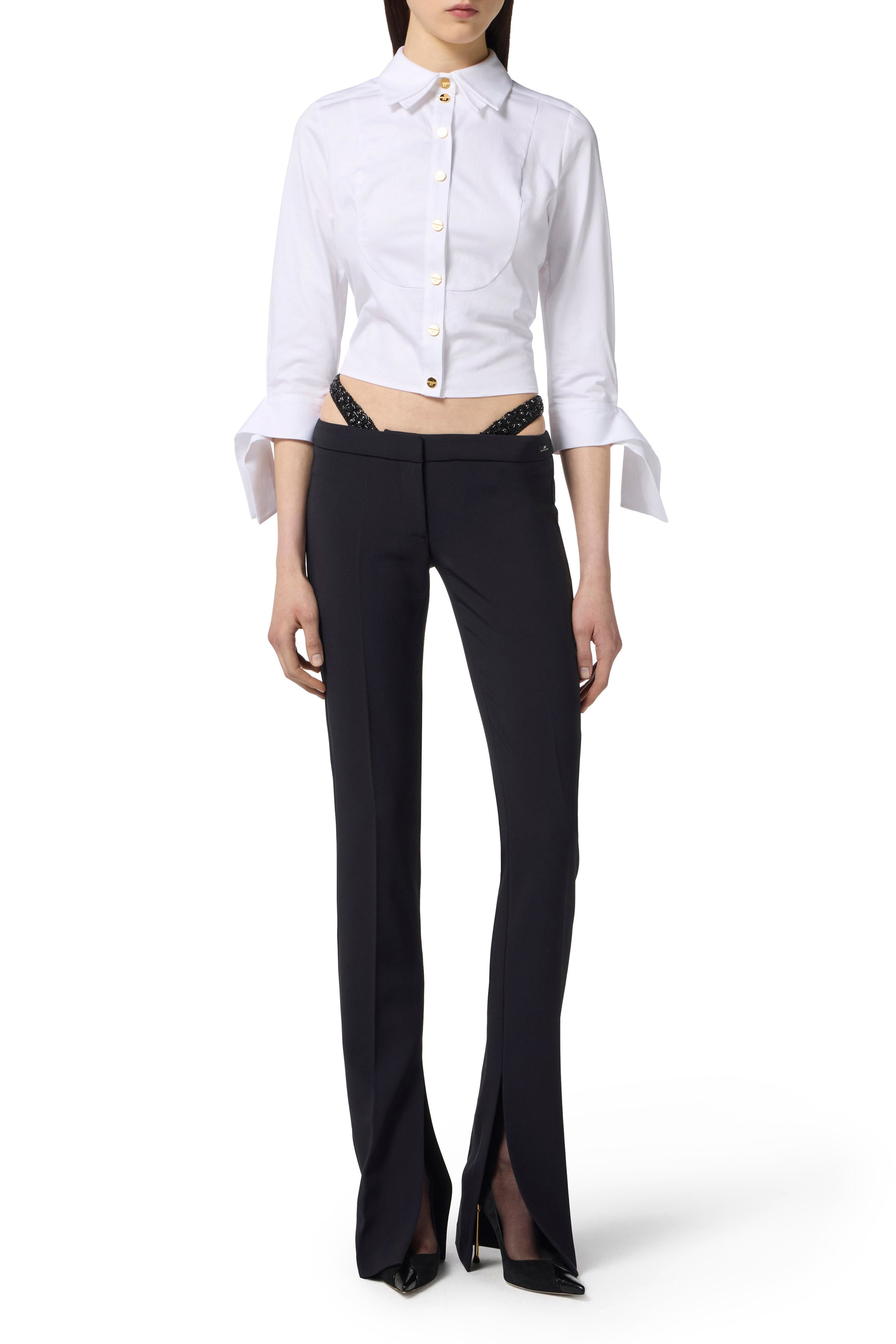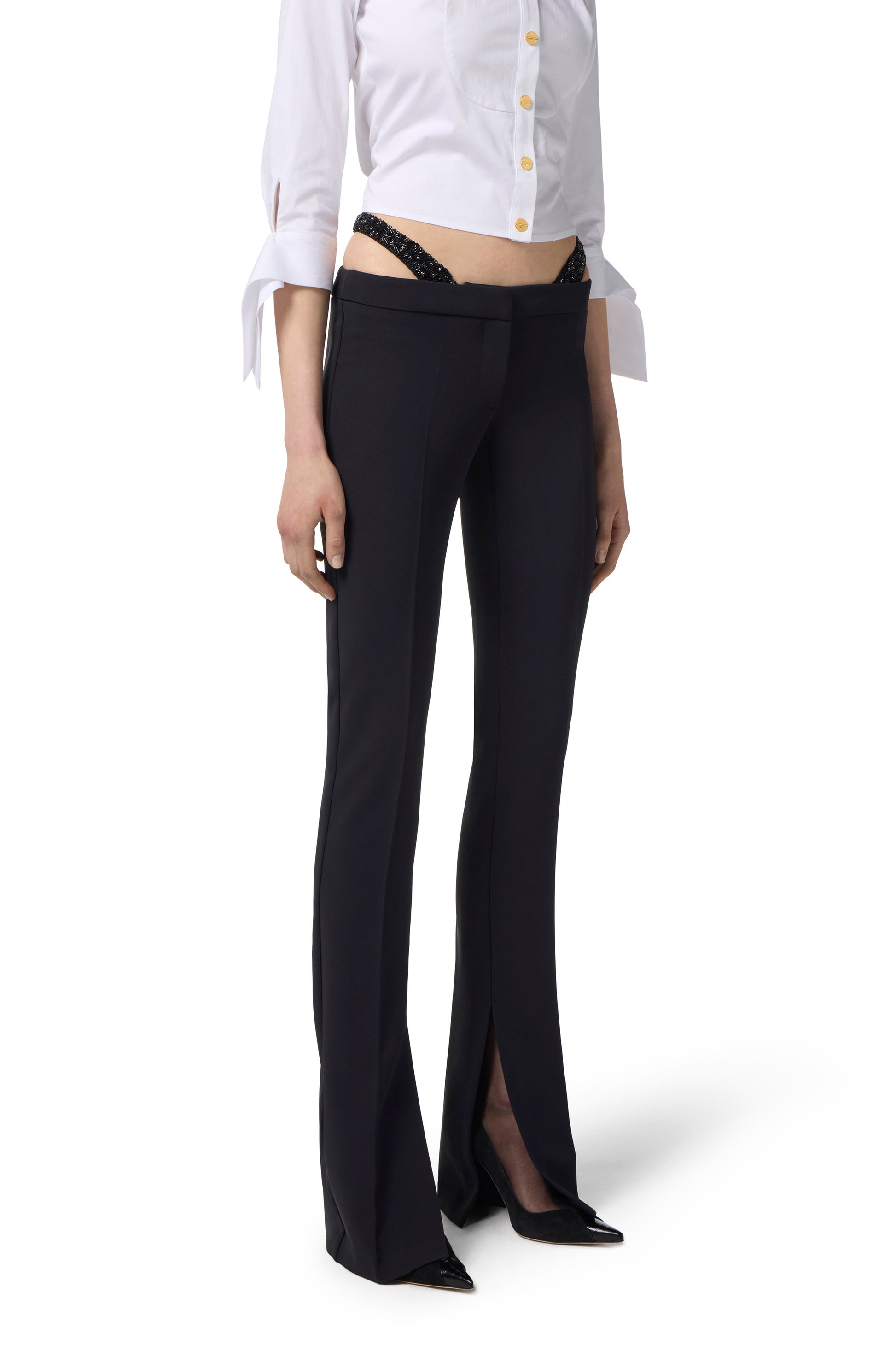 Trousers in lightweight crêpe fabric with slim fit. They feature a low waist with asymmetrical construction, embroidered with bright crystals. Internal slits at the leg bottom slim the silhouette. The label on one side completes the garment.