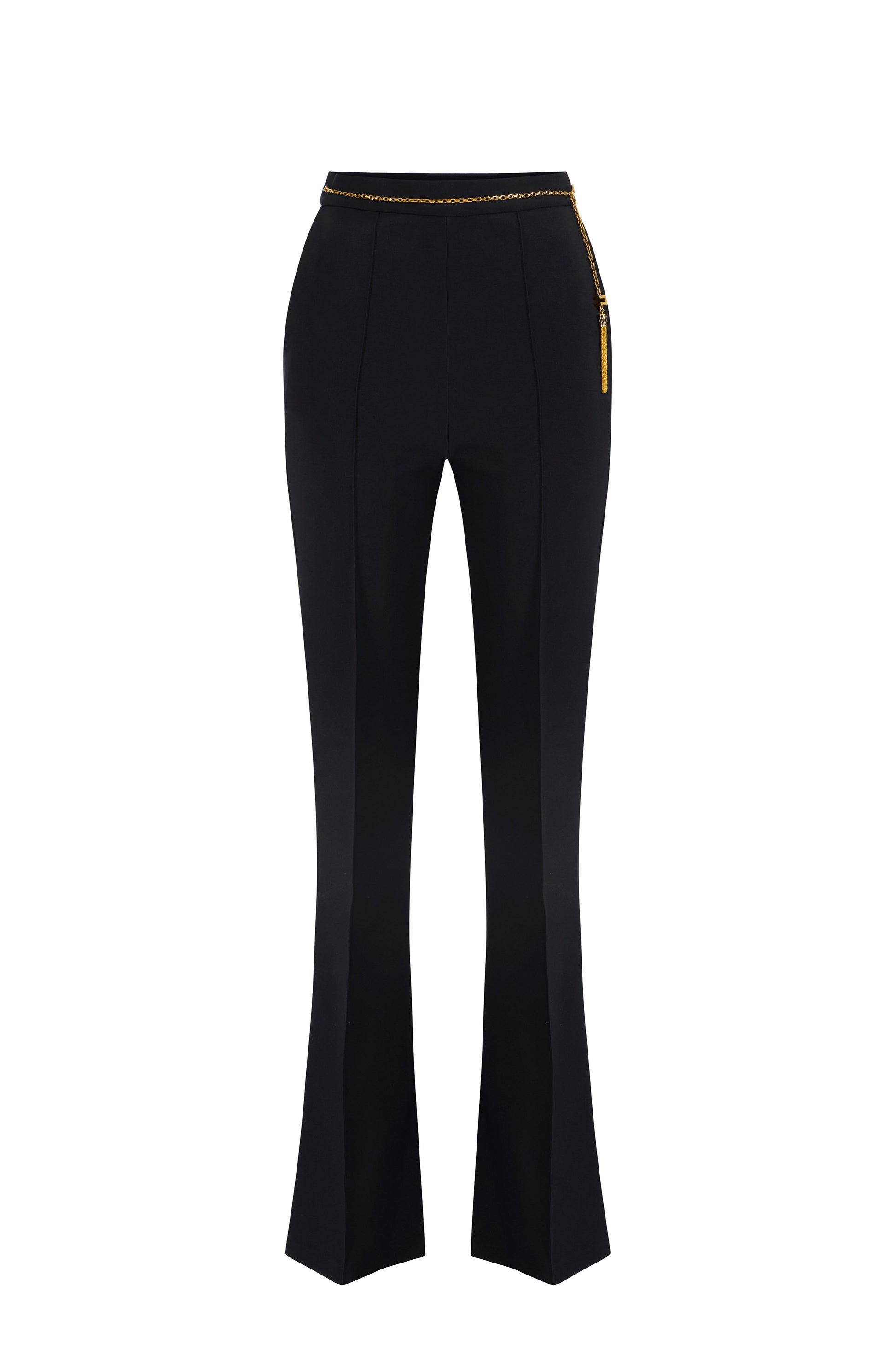 Trousers in lightweight crêpe fabric with slim fit and leg slightly flared at the ankle. A belt made of chain with logo and dangling tassel embellishes the waistline of this garment. On the back, applied flaps with enamelled buttons and snake-inspired pattern.