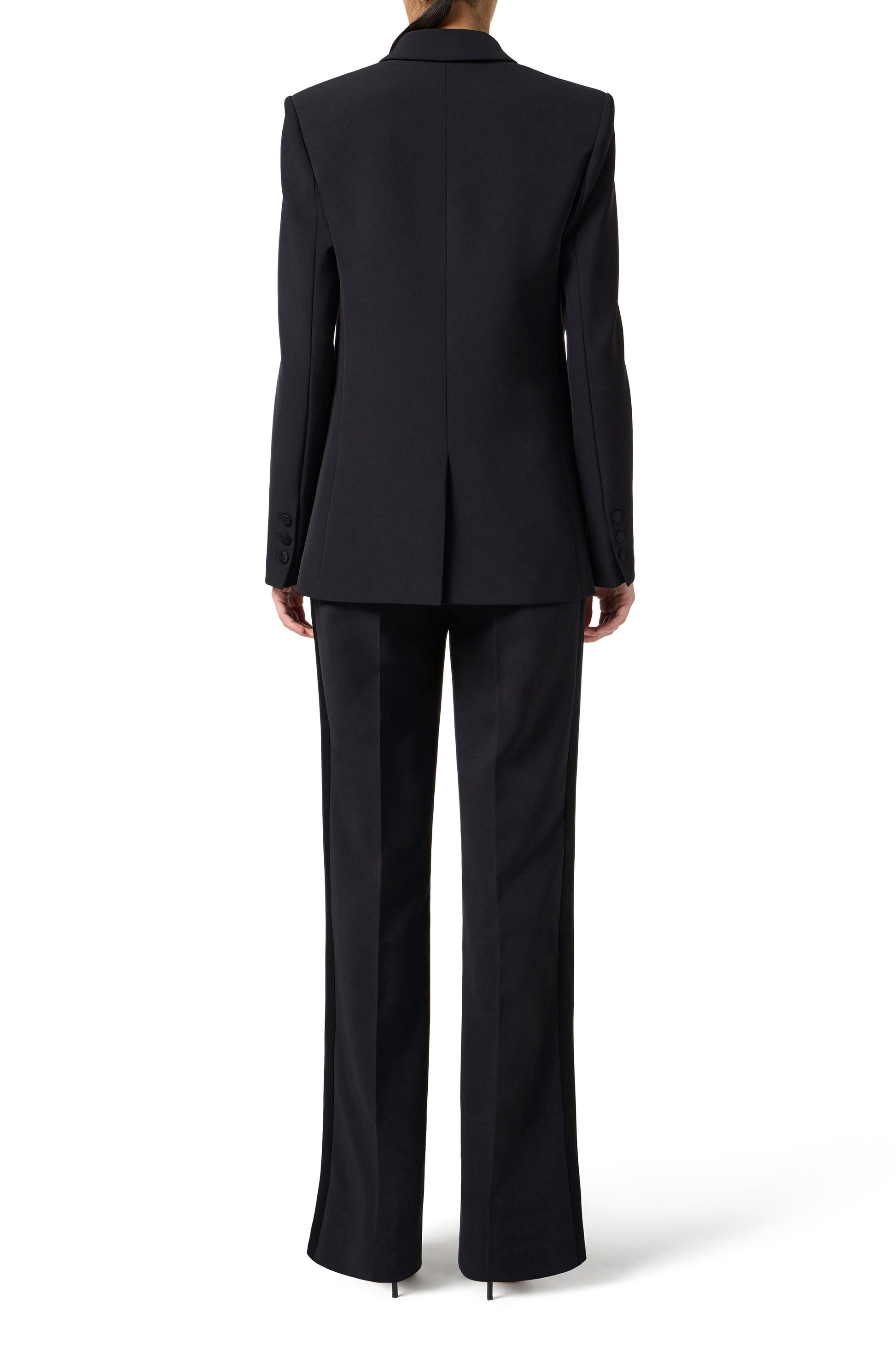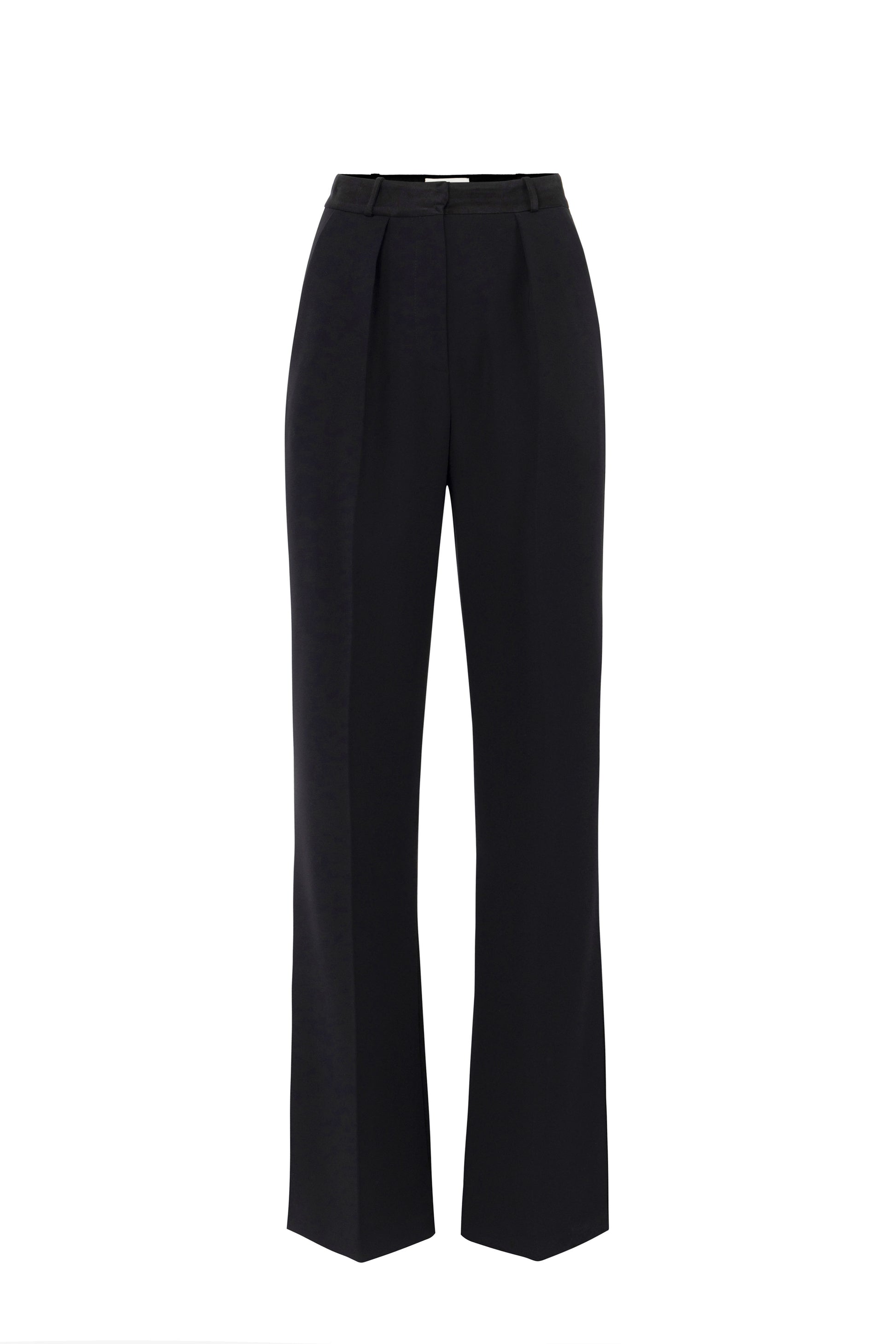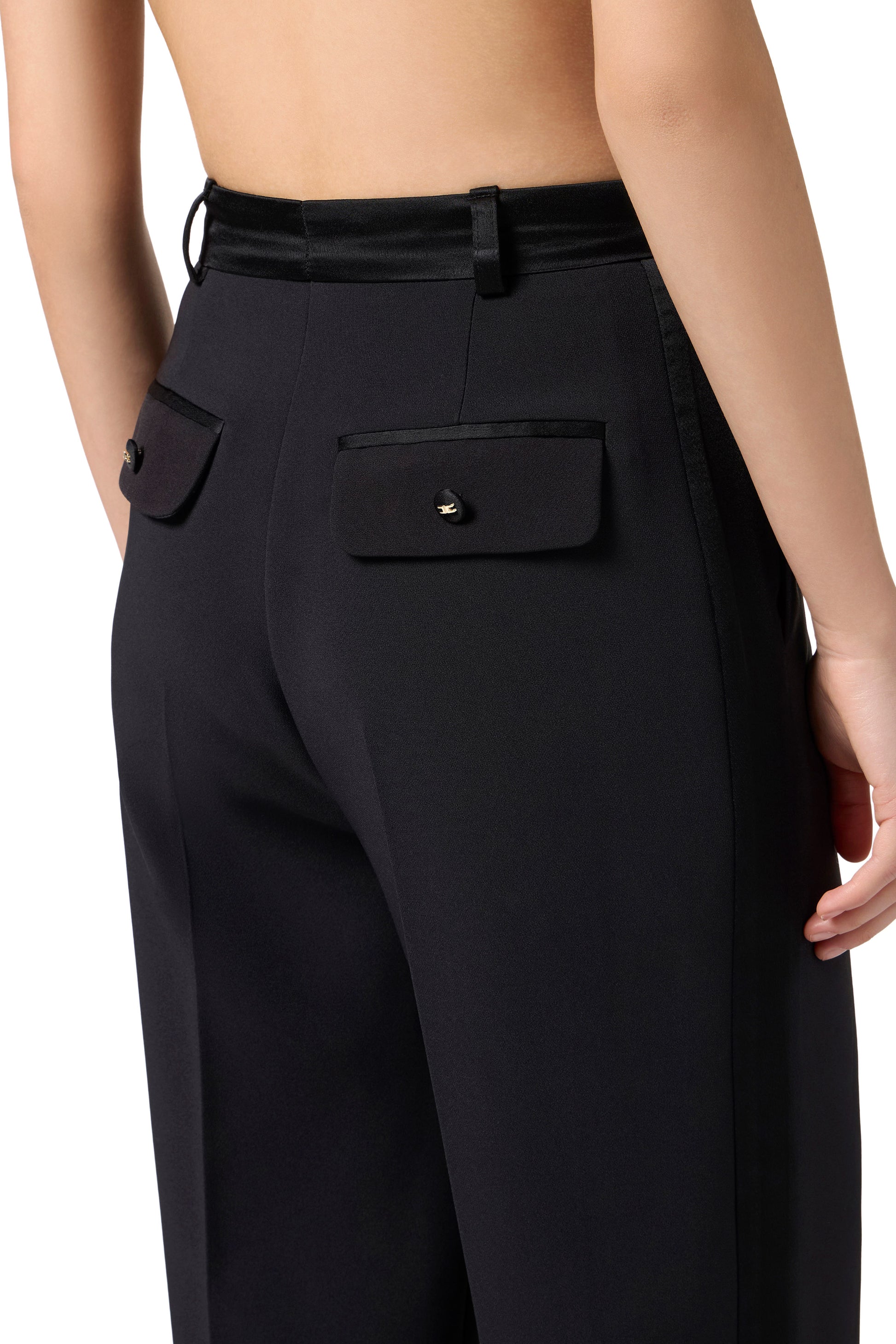 Trousers with darts in lightweight crêpe fabric with oversized fit. They are characterised by the satin tuxedo-inspired waistband and side bands, for a sophisticated contrast of textures. Front pockets and flap appliqués with buttons on the back.