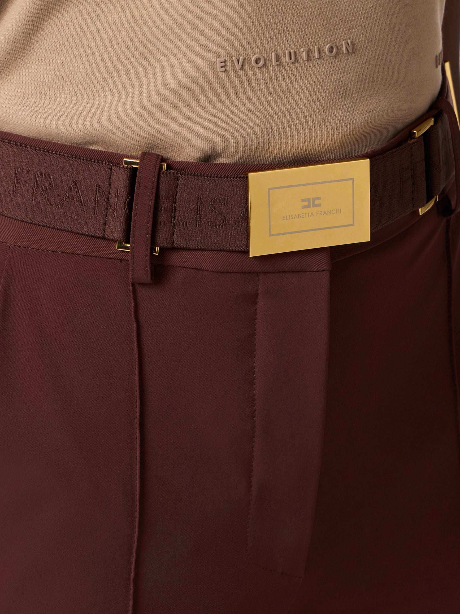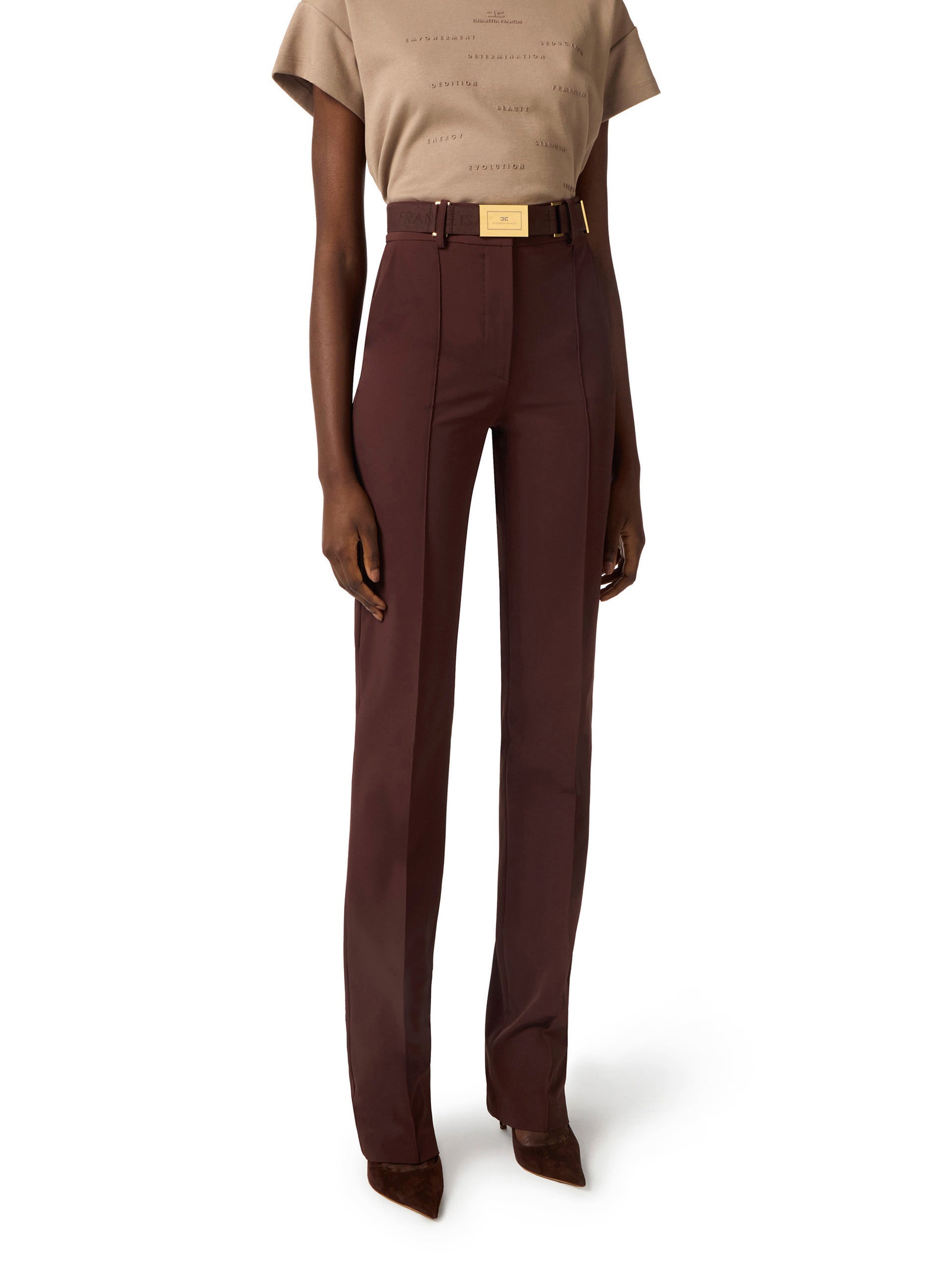 Technical bi-elastic fabric trousers. They are designed with slant pockets and stitching to define the silhouette at the front. Focus on details: the belt enhances the waistline and is illuminated by the laser-engraved logo plaque. Regular fit.