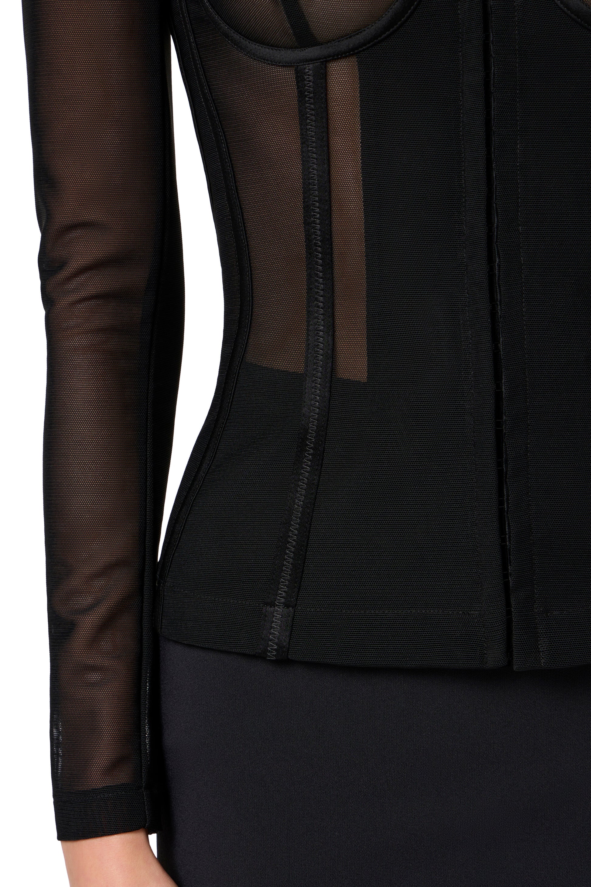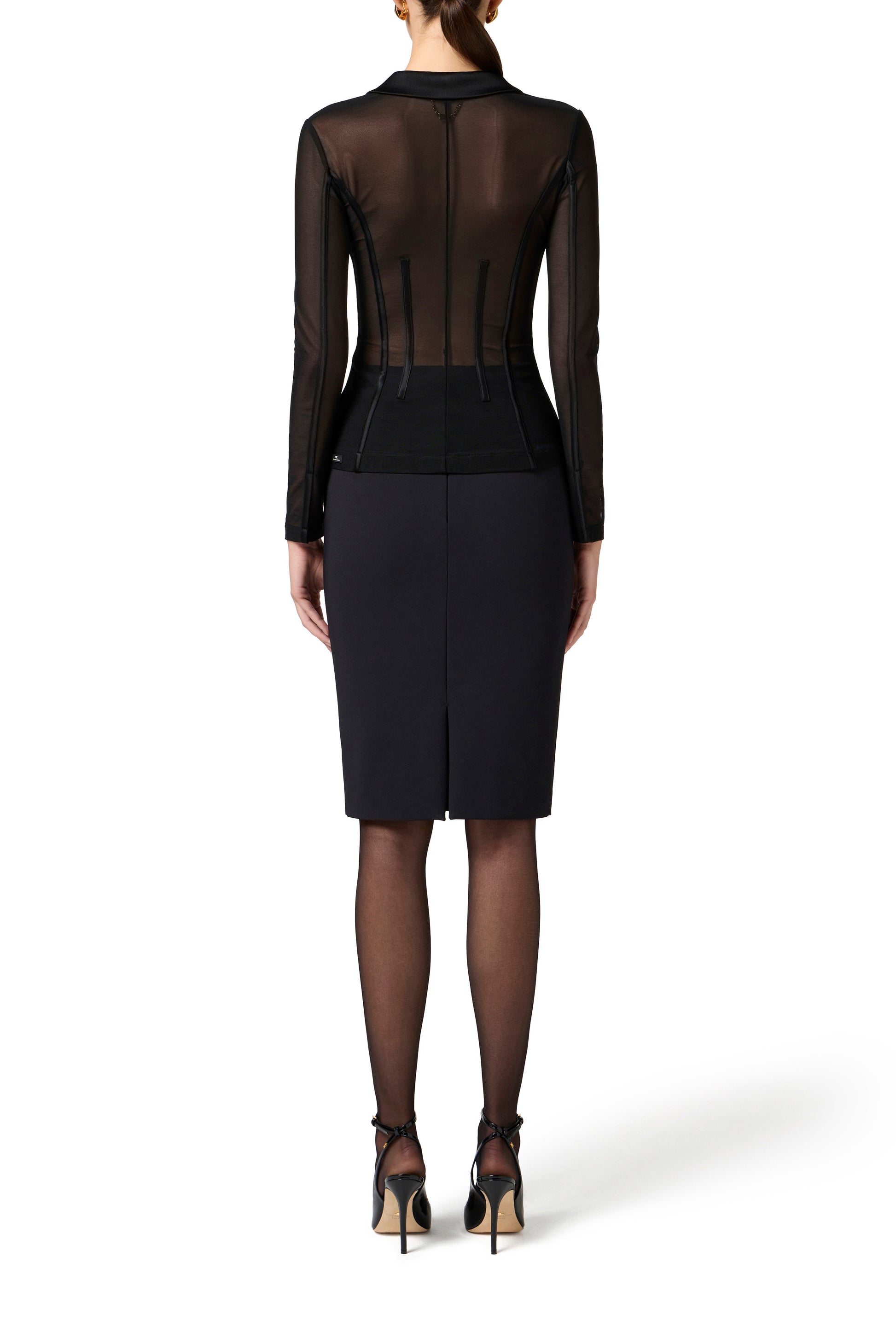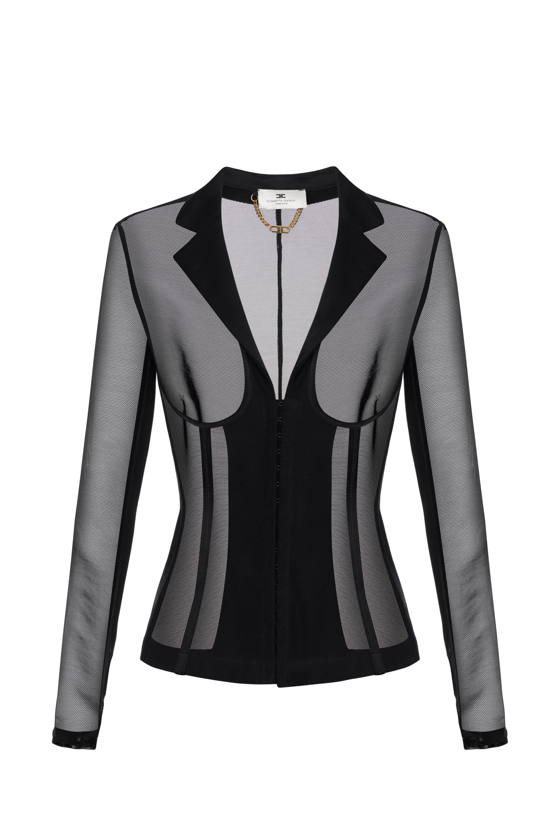 Tulle jacket with long sleeves and collar featuring lapels. The blazer stands out for its bustier construction defined by internally fixed, satin-covered bones, structuring the sides and giving a strong, sinuous silhouette. Slim fit.
