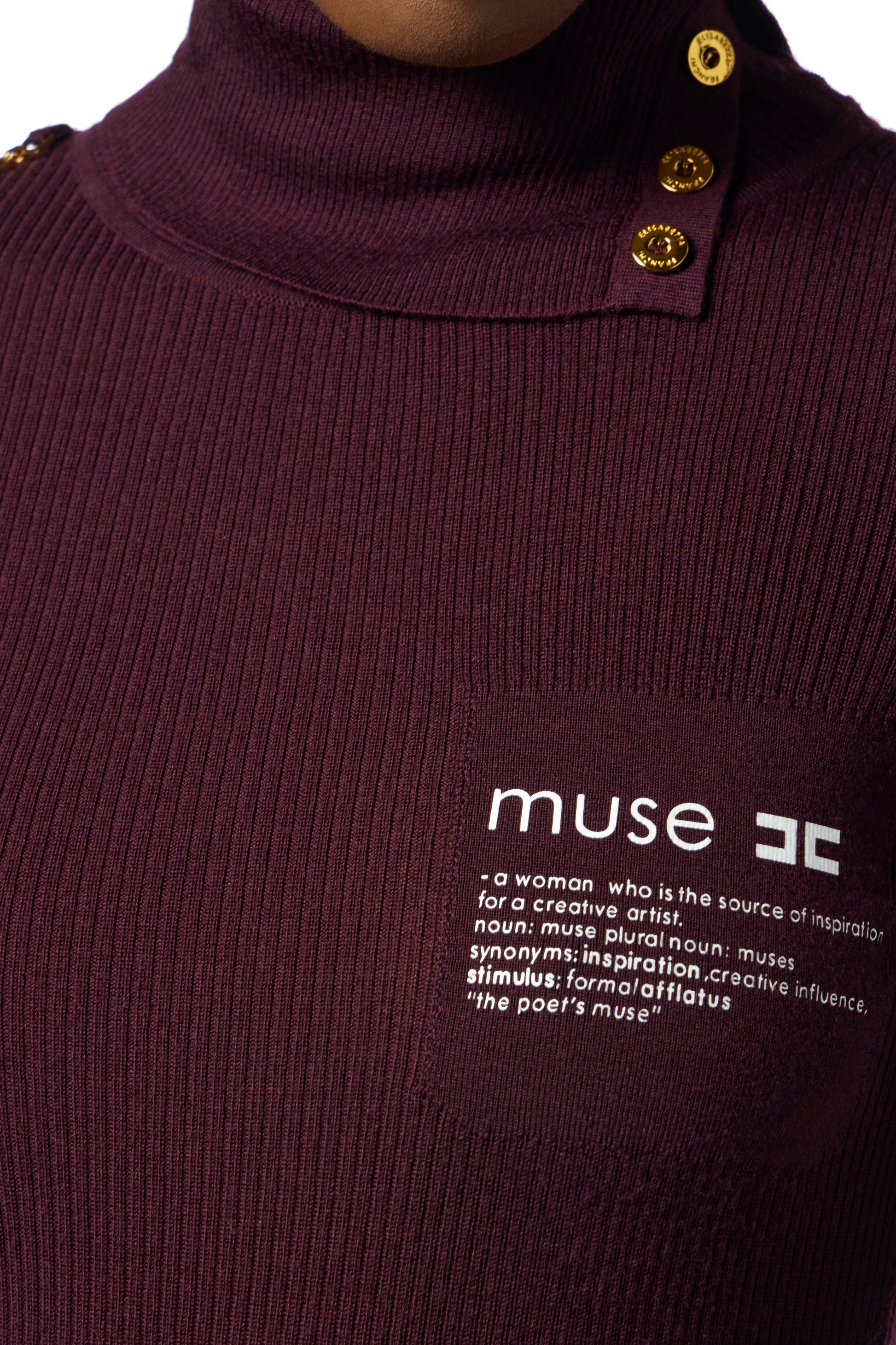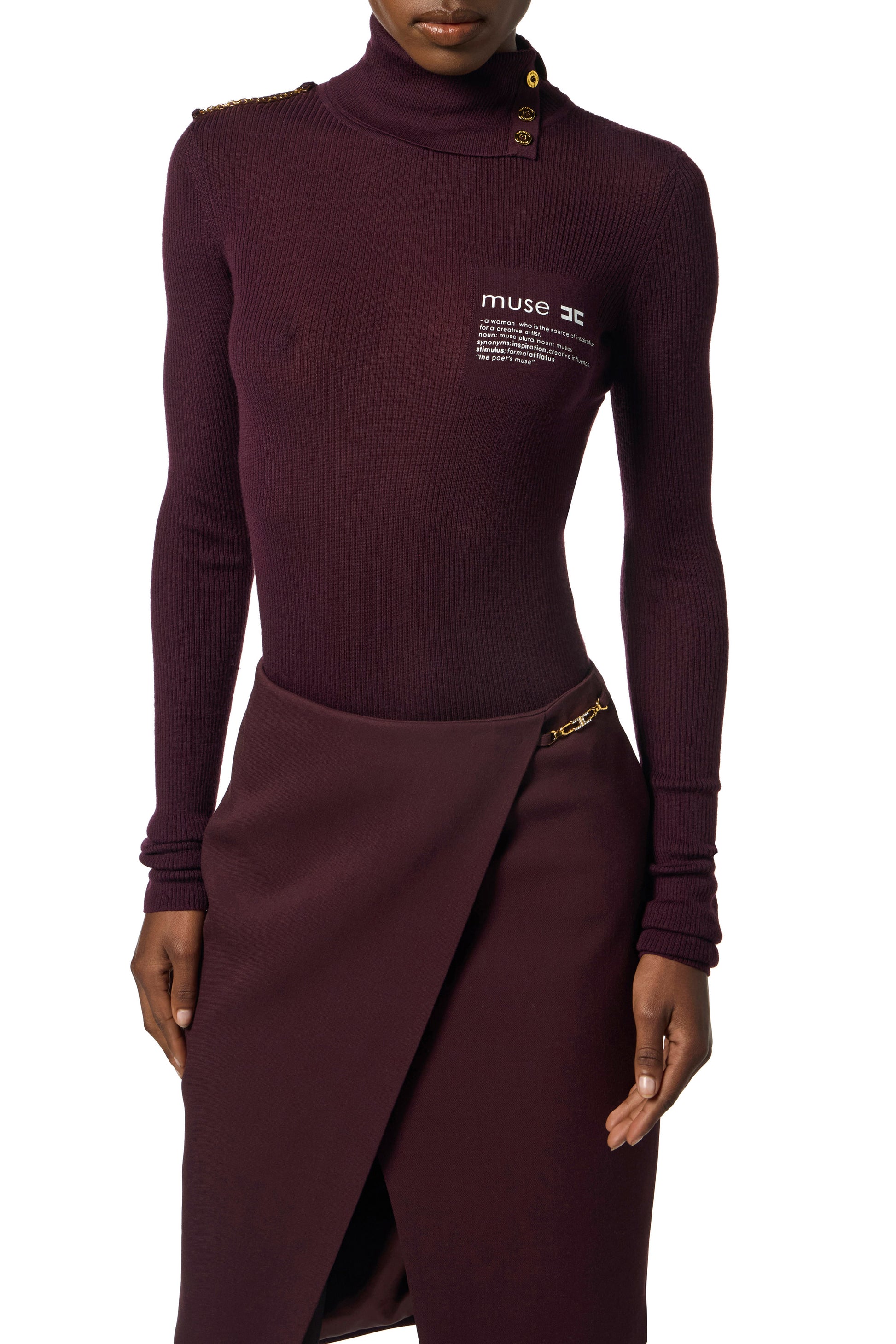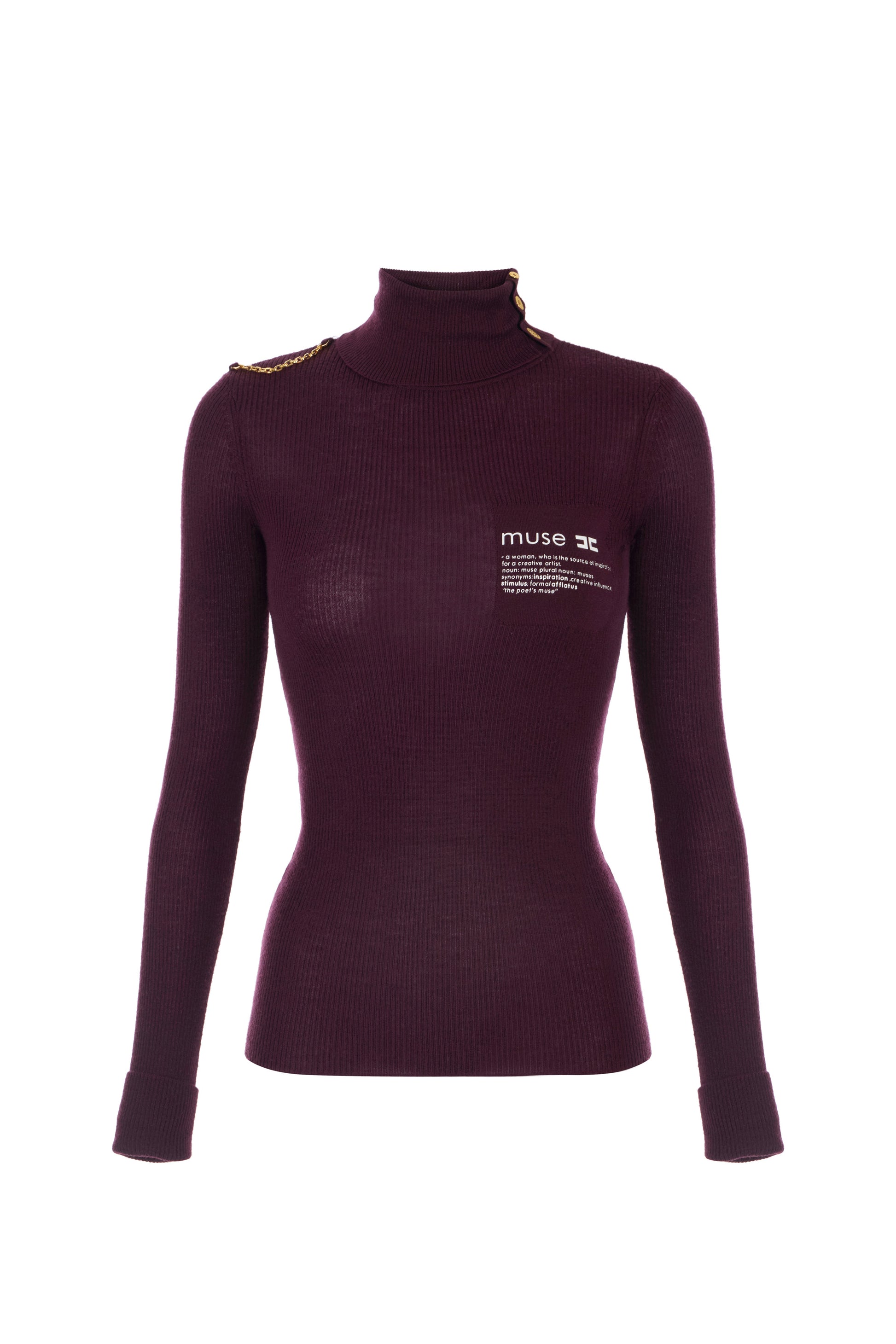 Knit turtleneck top with a slim fit. Ideal to wear under a jacket, it has a turtleneck with side opening and golden metal buttons, and long sleeves with turn-ups at the bottom. Decorated with the inspirational lettering print on the front and the bright chain detail on one shoulder.
