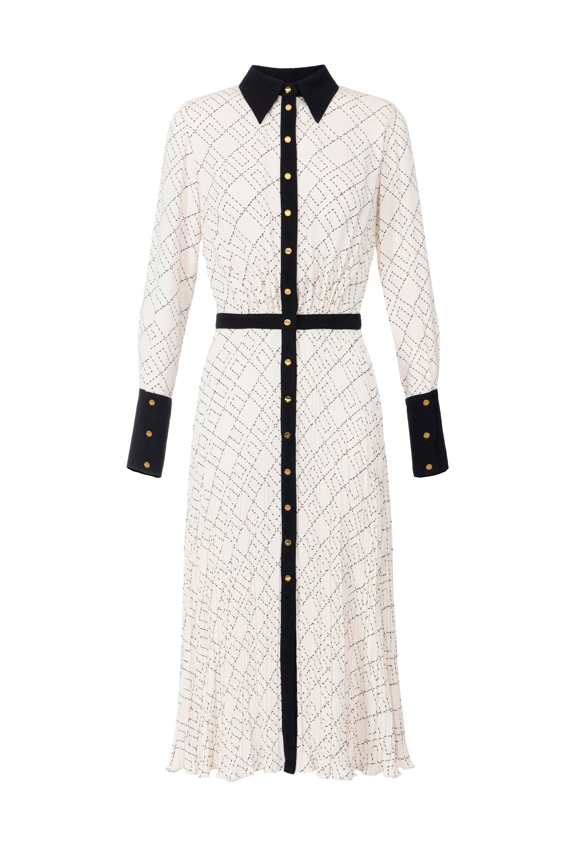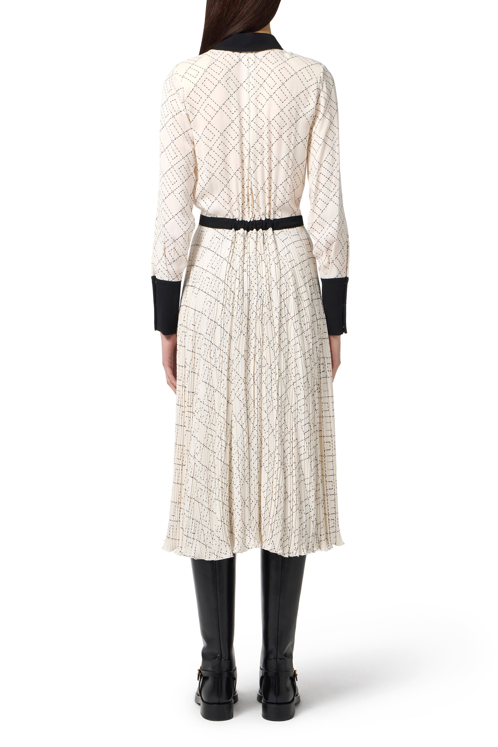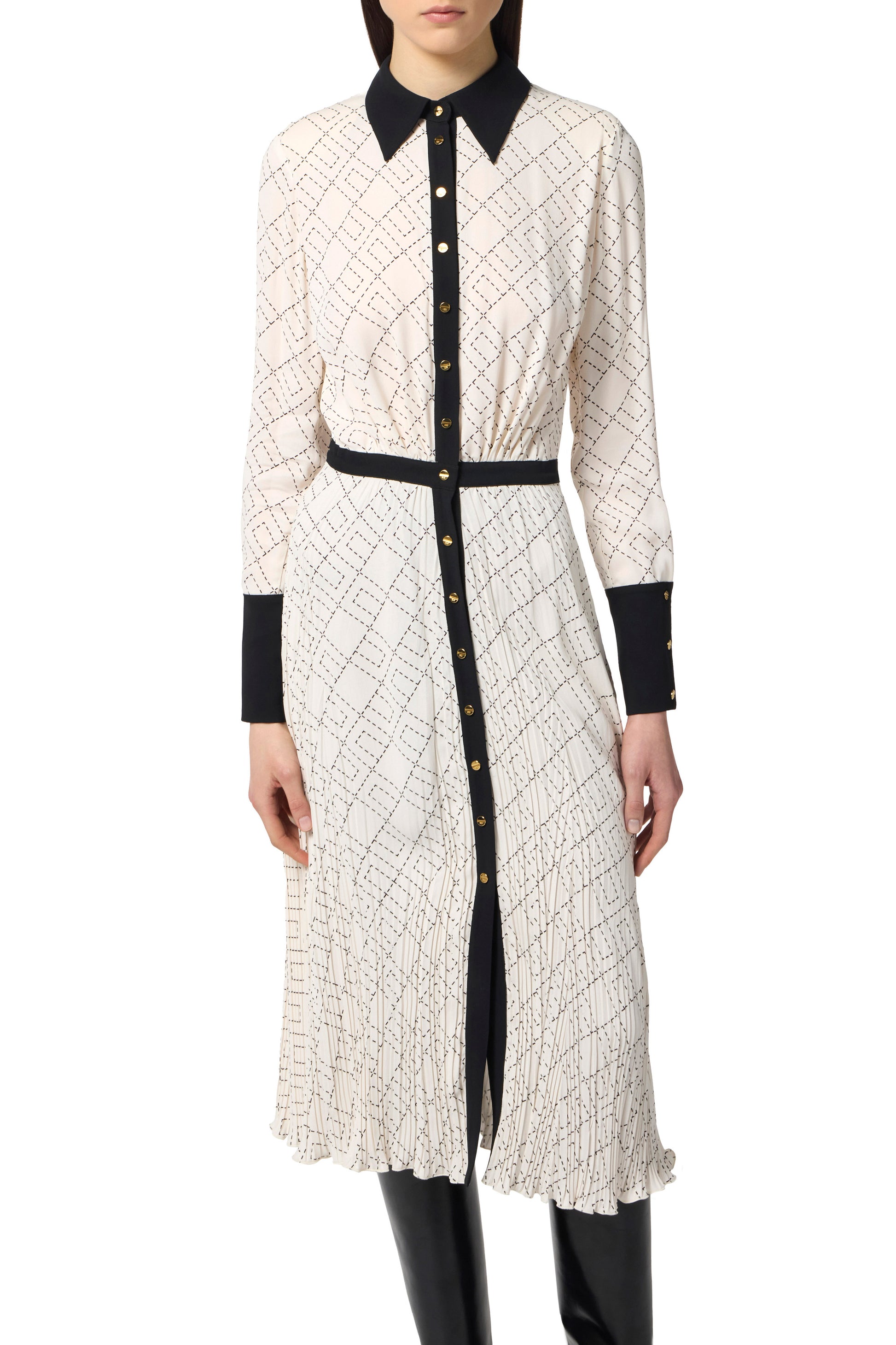 Dress in viscose georgette fabric with slim fit. The dress has a shirt collar, wide cuffs and a pleated skirt with an elastic at the back of the waist. The collection print creates a dynamic two-colour pattern, enhanced by contrasting elements. The golden metal buttons provide a touch of light.