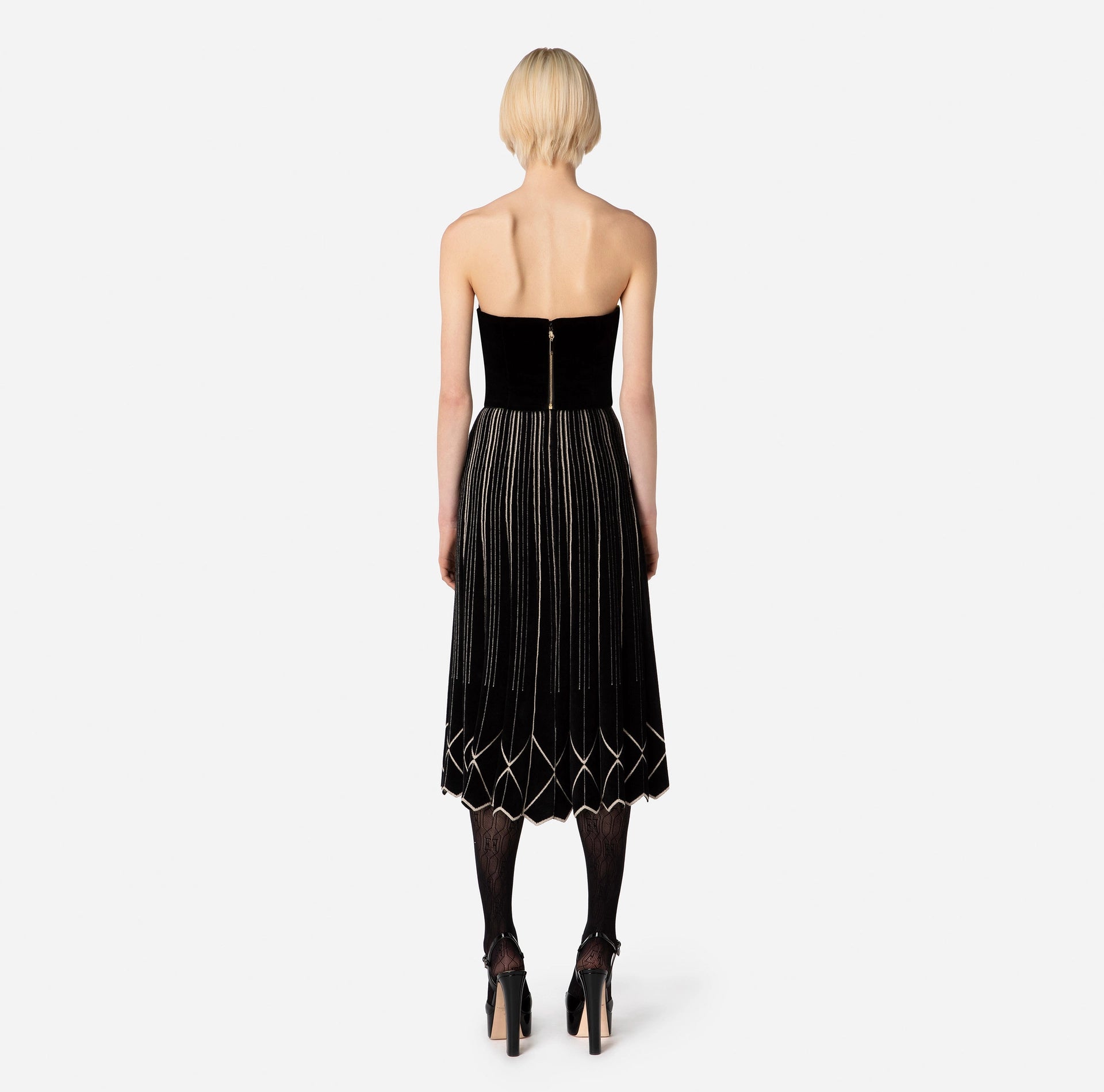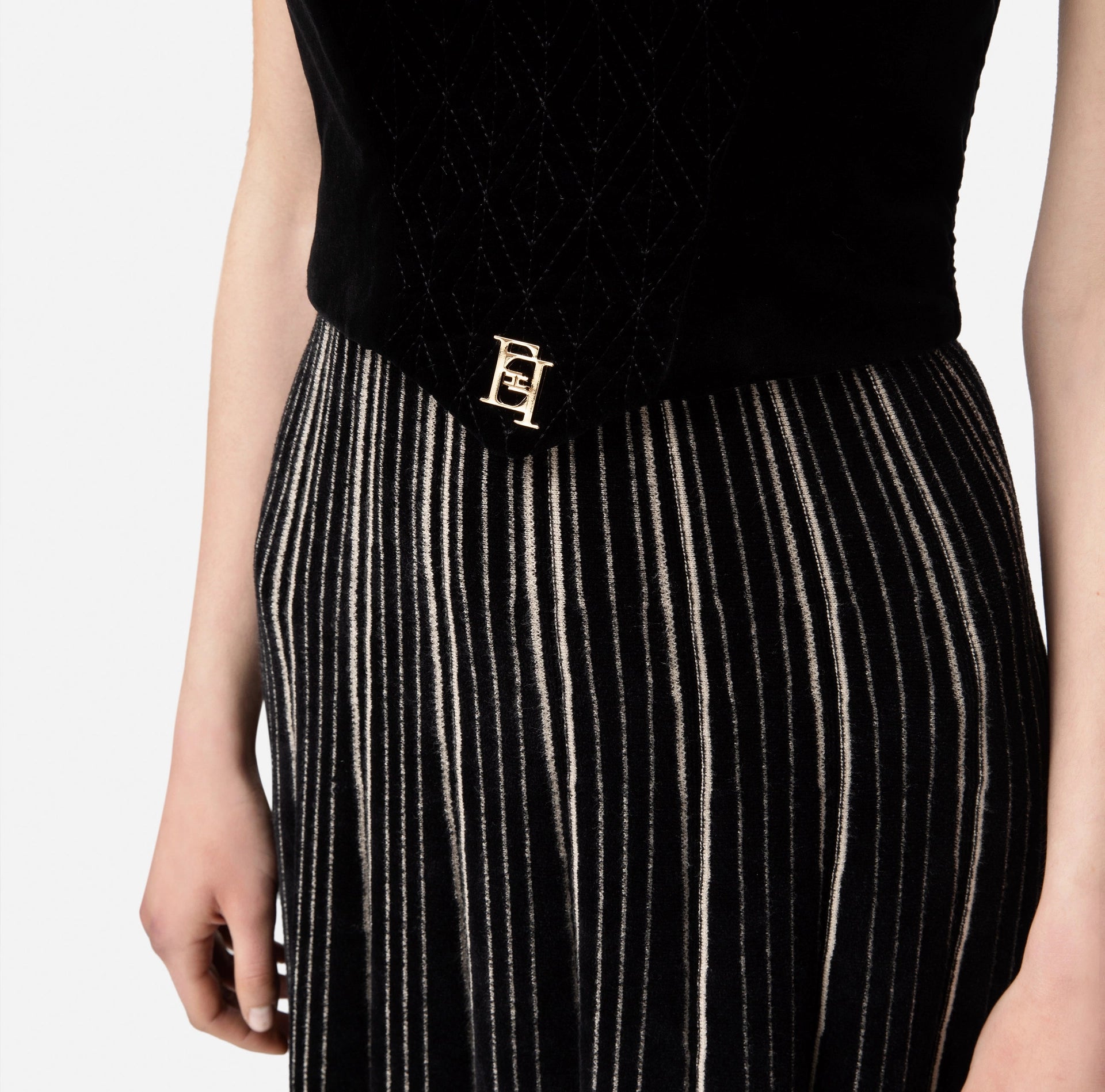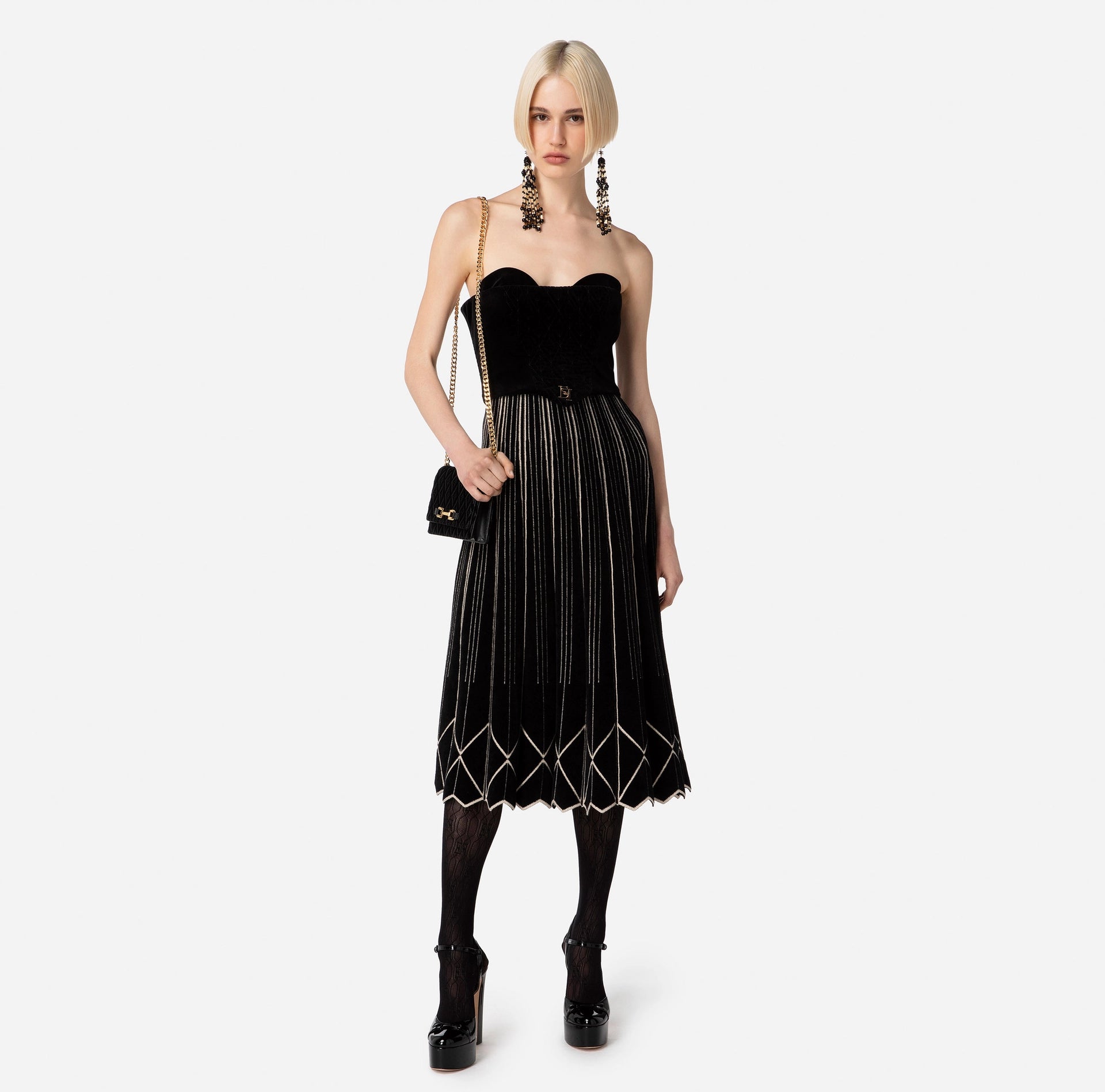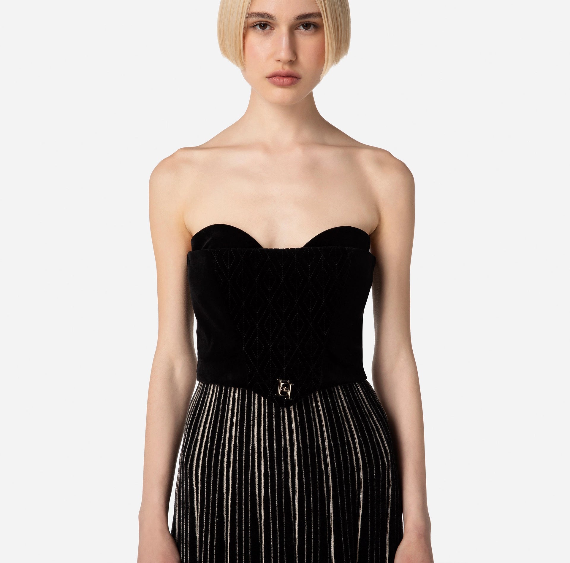 Bustier top with embroidered velvet inserts. Application of a golden metal logo plaque at the waistline and zip closure