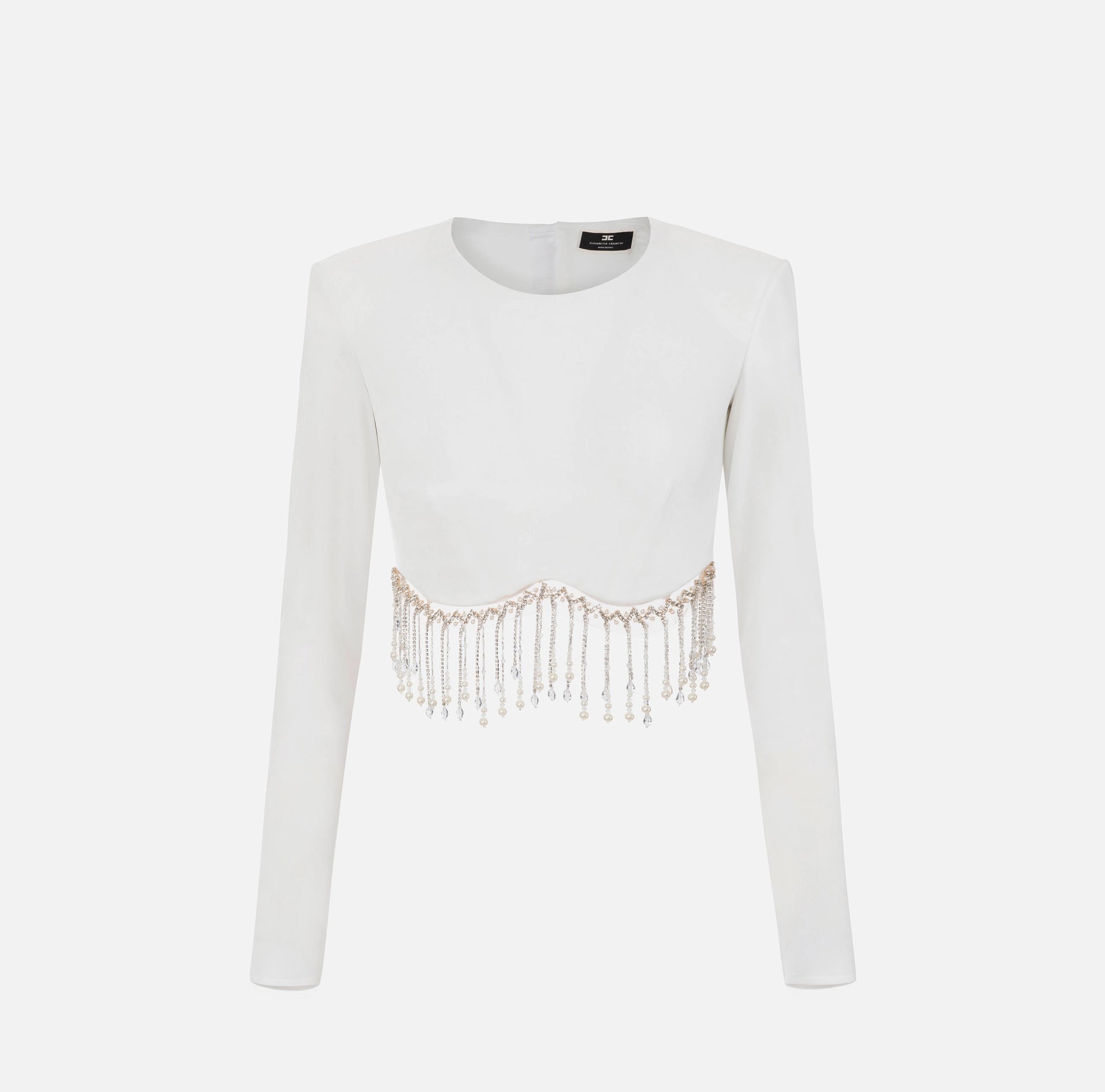 Stretch velvet cropped top with long sleeves. It features fringes embroidered with pearls, stones and crystals under the breast