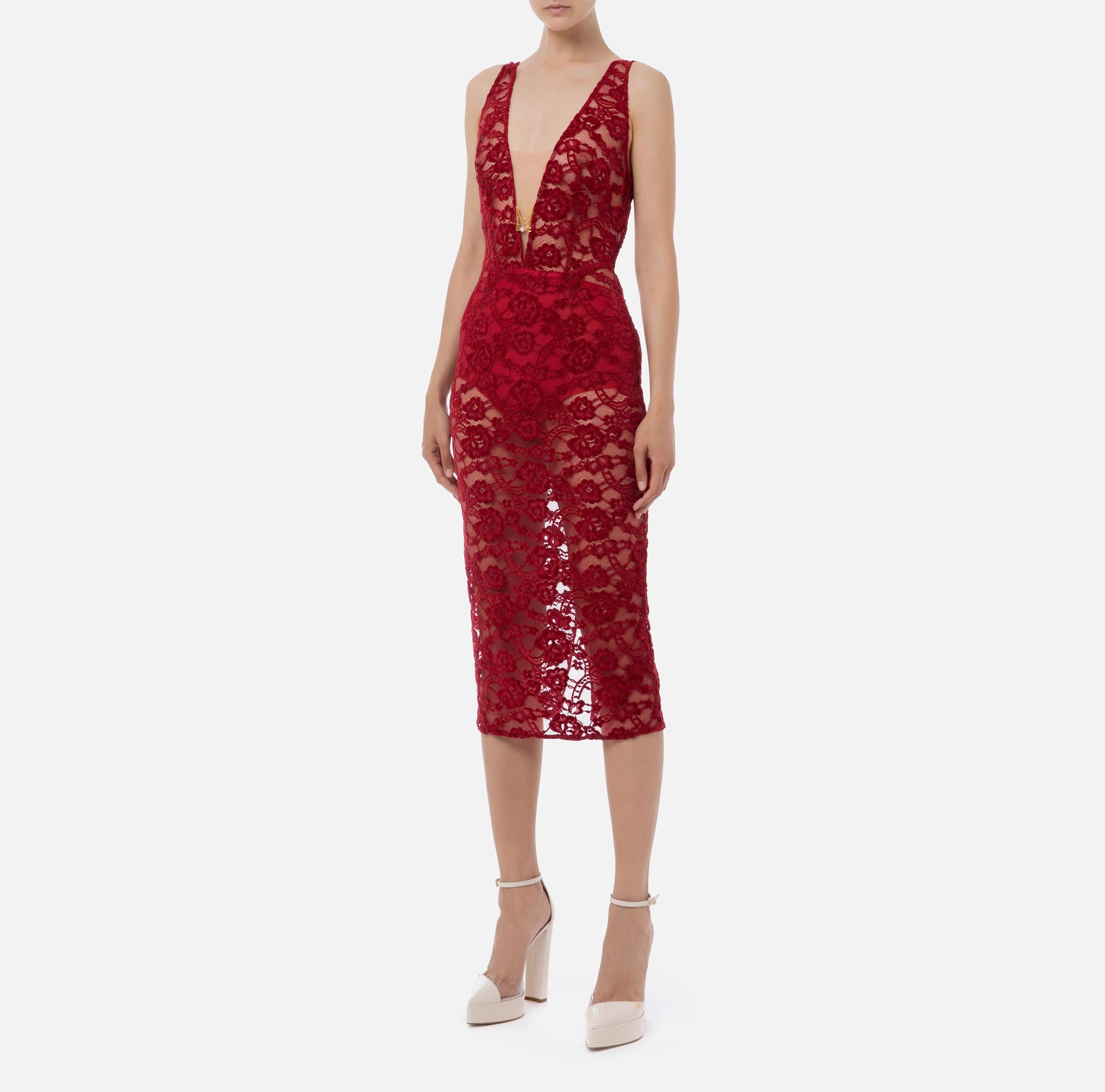 Velvet lace midi dress. It features a plunging neckline held by a nude-coloured tulle insert embellished with a golden metal accessory