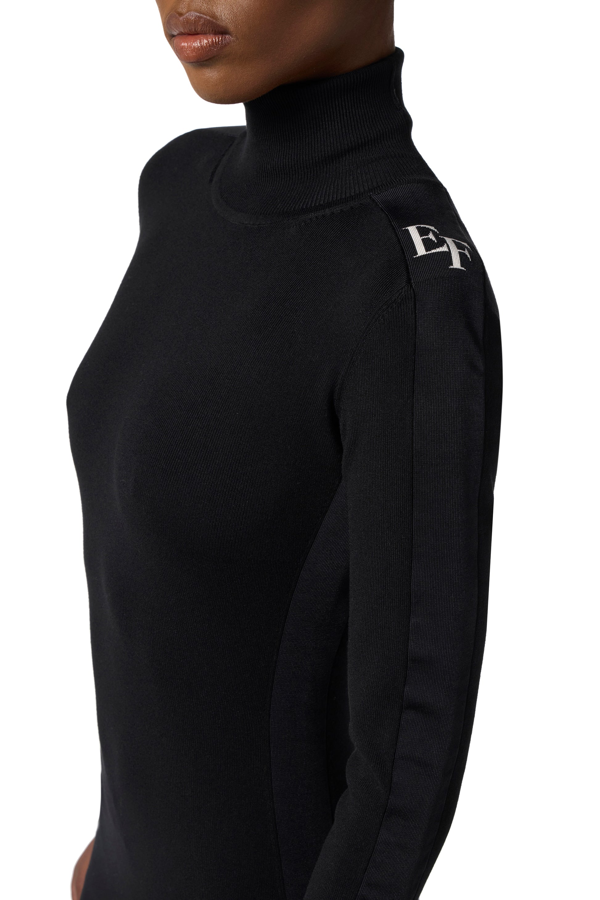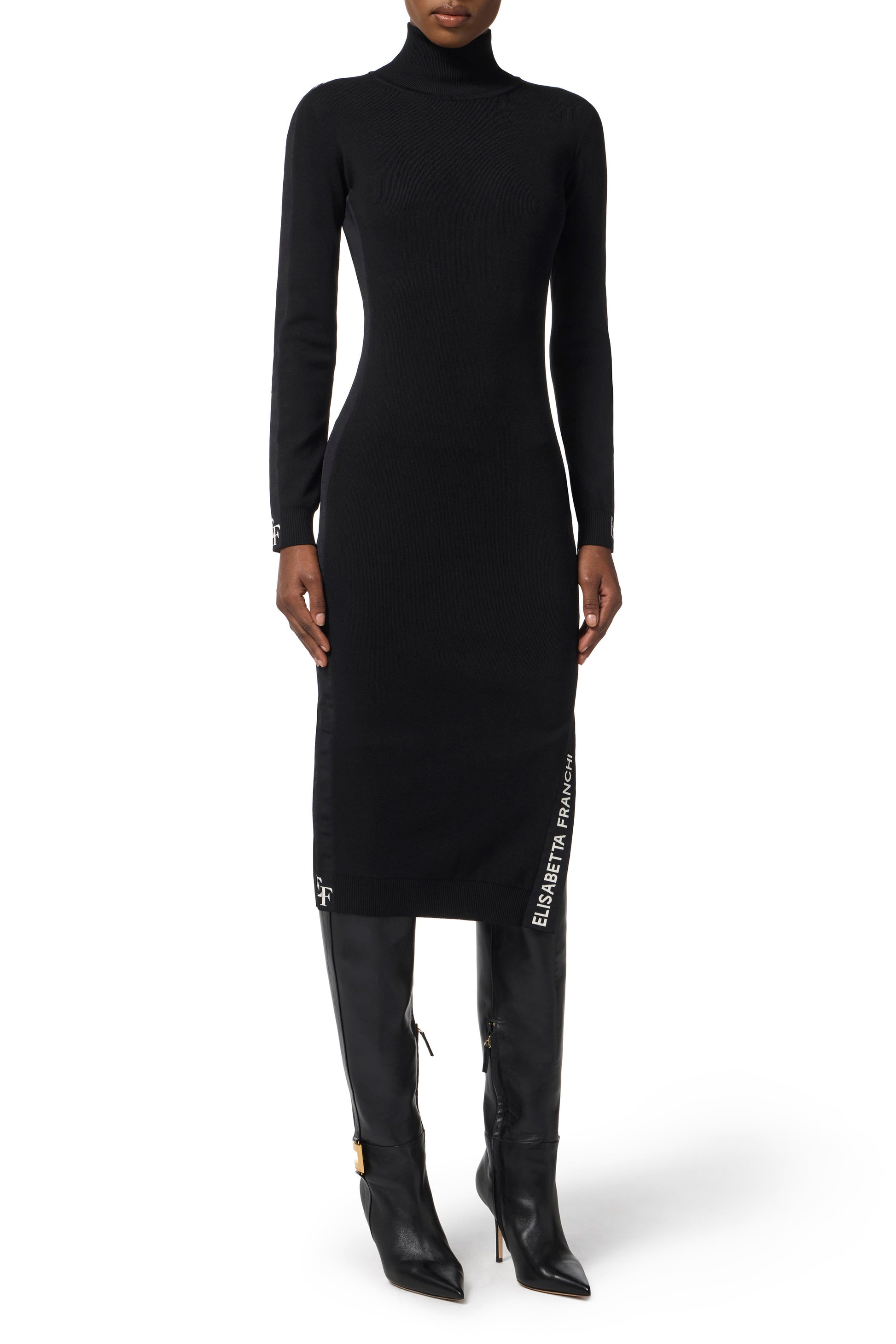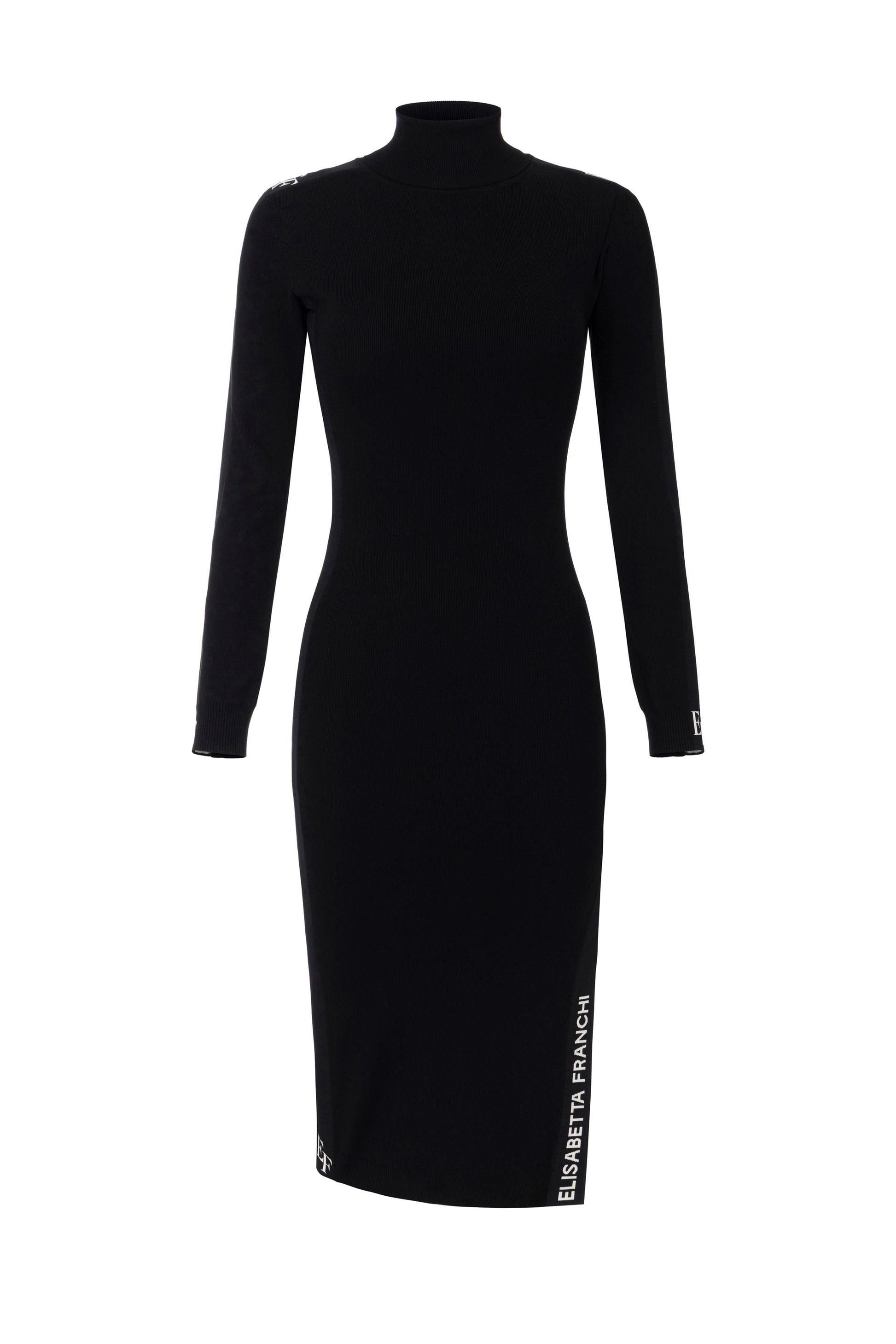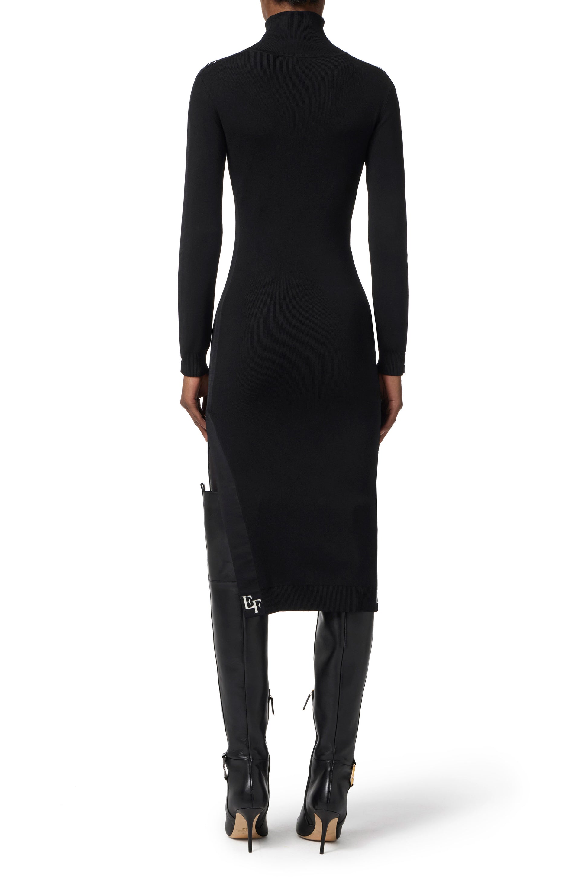 Slim fit knit sheath dress. The dress features a high collar, long sleeves and is characterised by the side slit overlapped by the shiny viscose band. Logo details rendered by inlays and contrasting colours elevate the essential design of the garment with a graphic note.