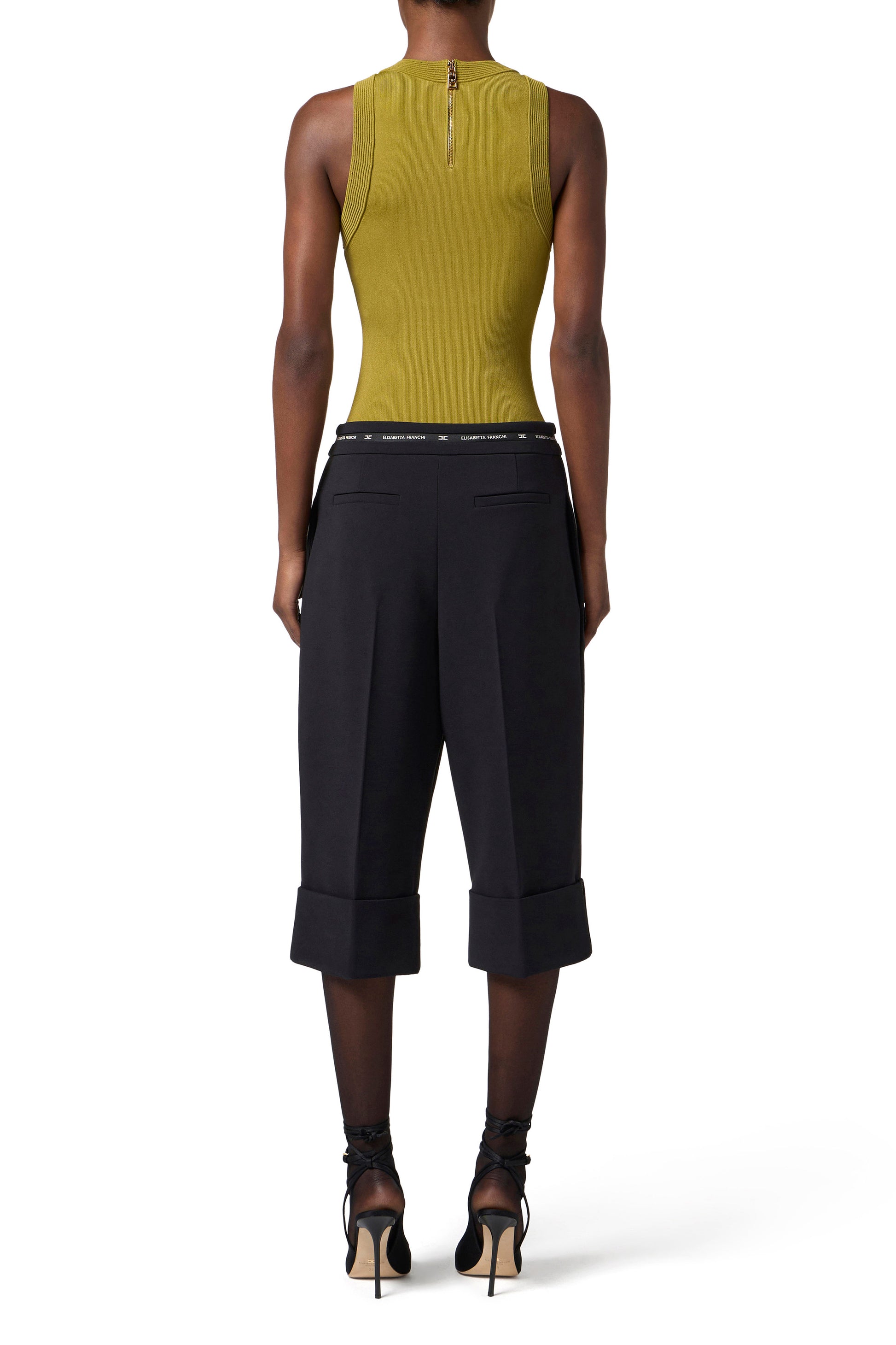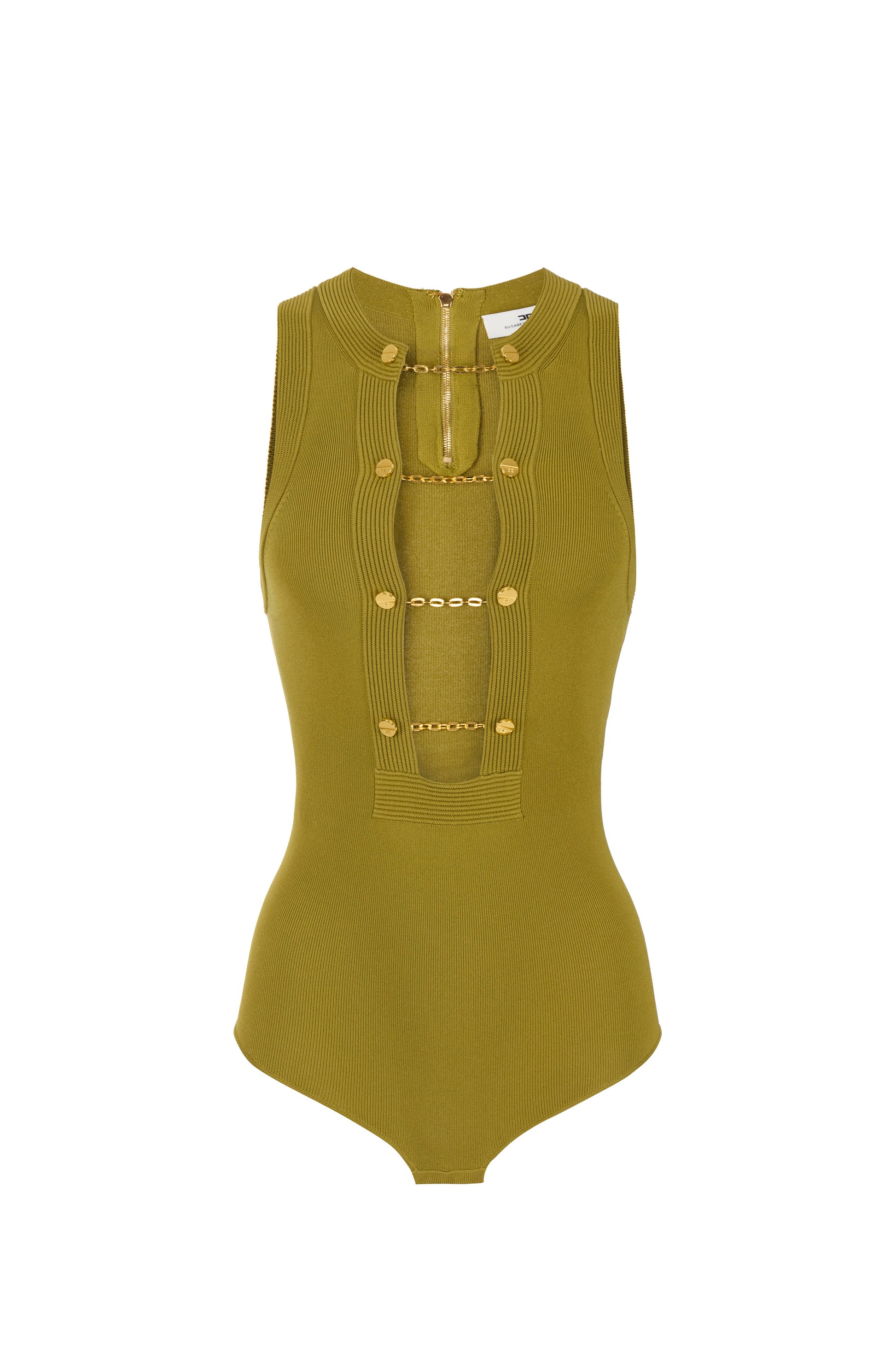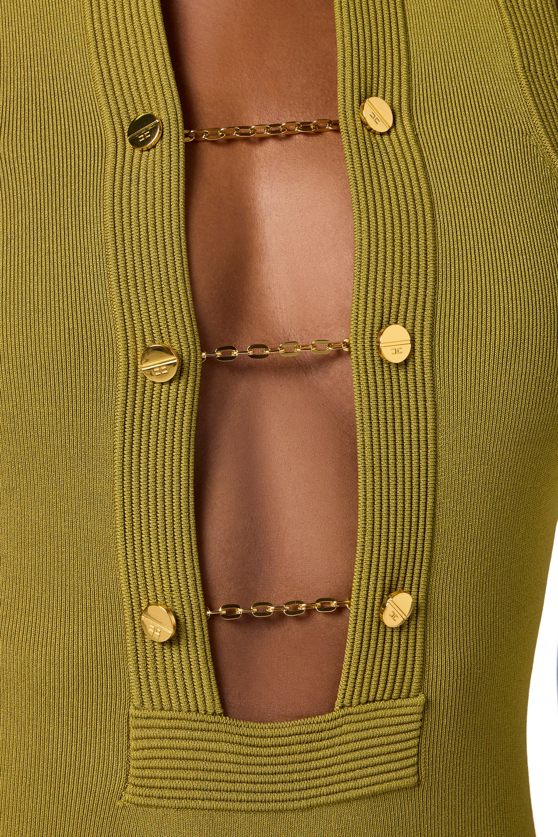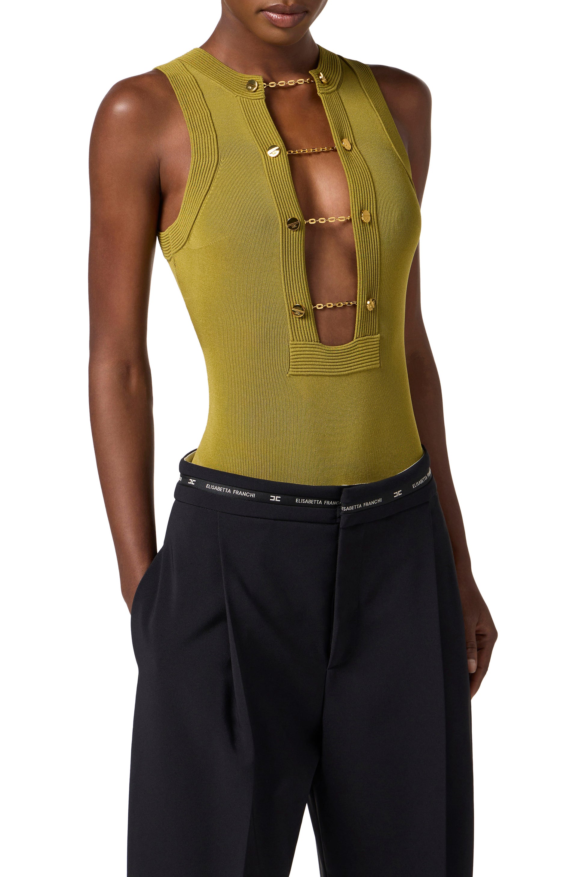 Viscose knit bodysuit with a slim fit. It stands out for its plunging neckline, embellished with jewel cufflinks with a golden metal chain. Ribbed for a defined and tight weave.