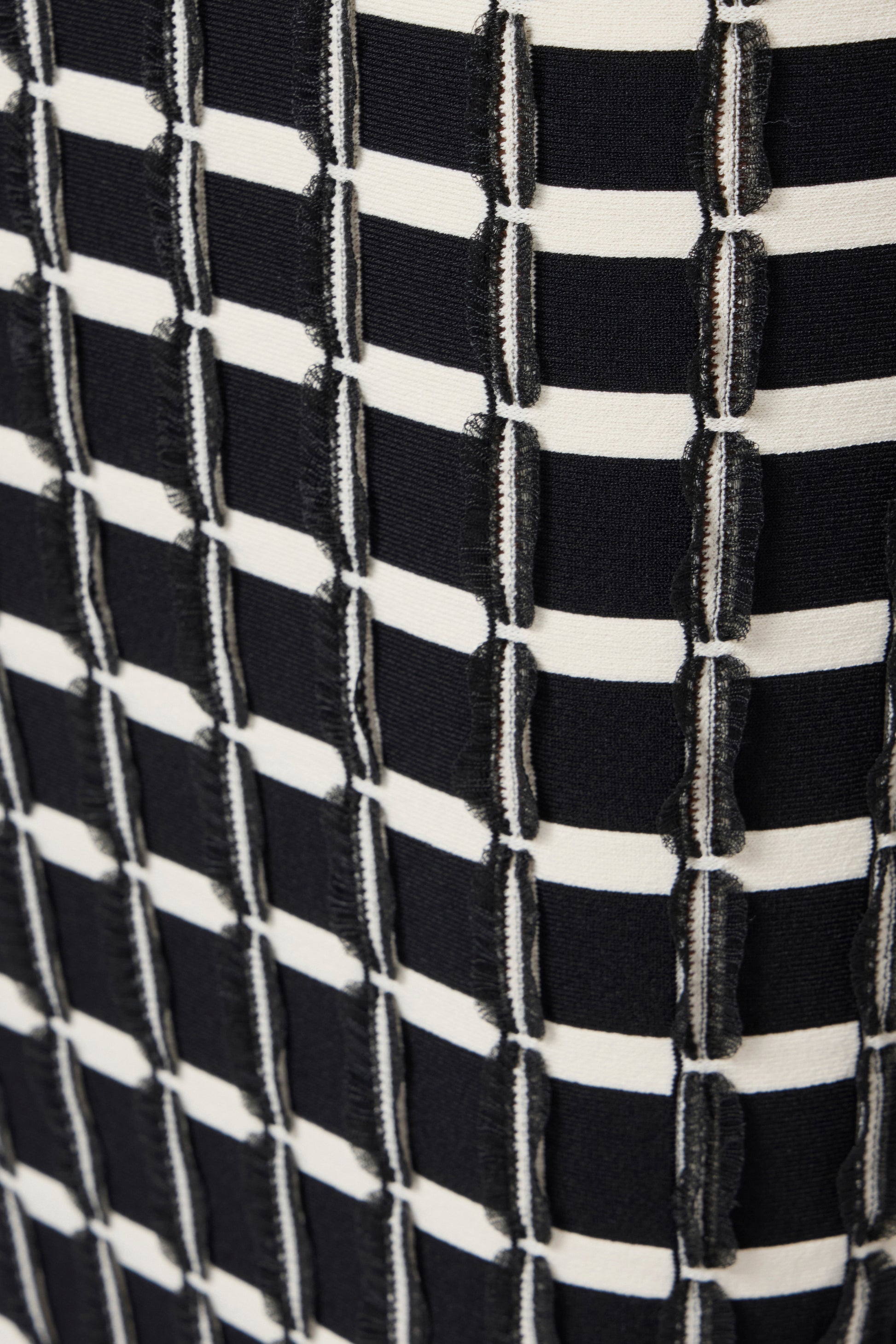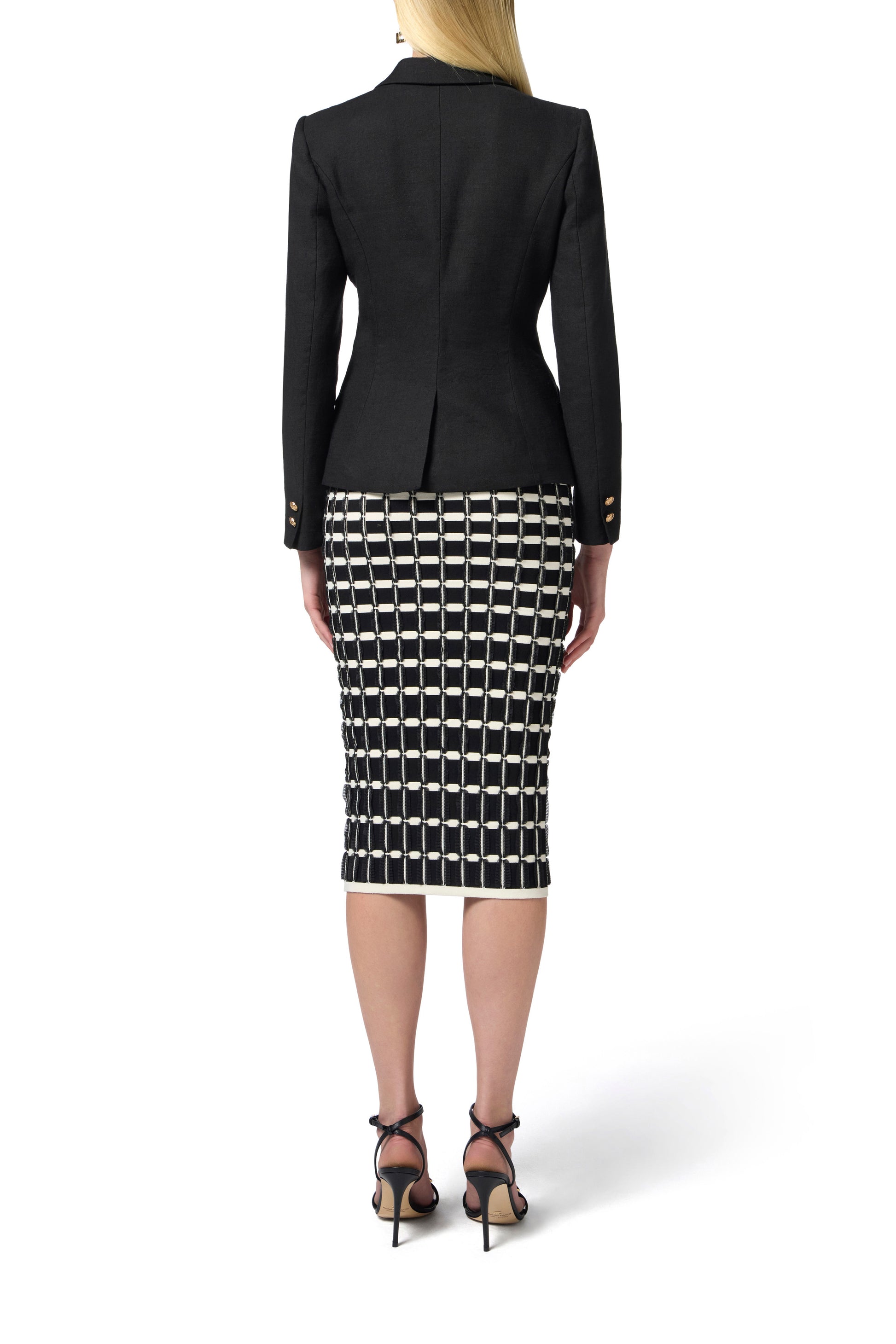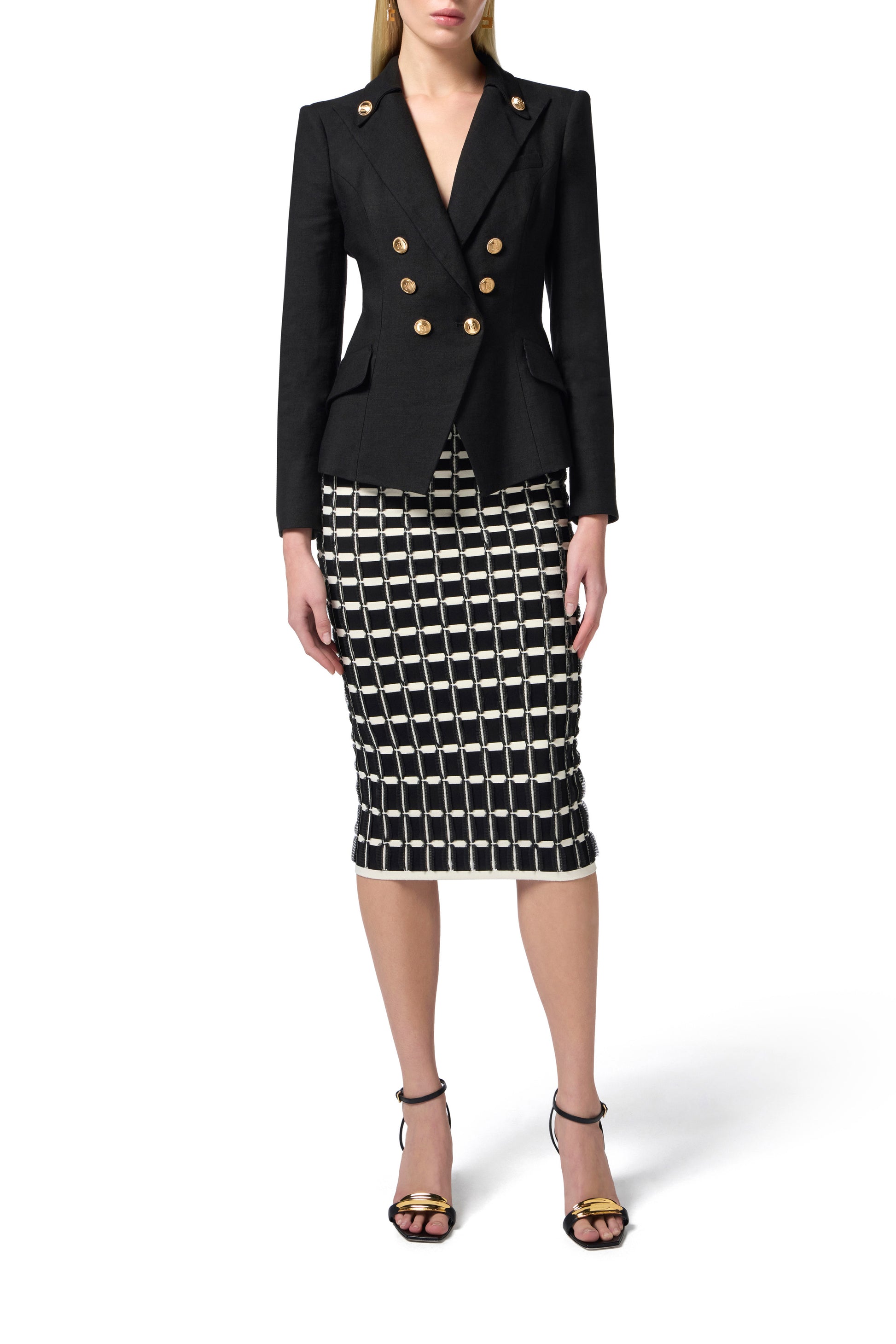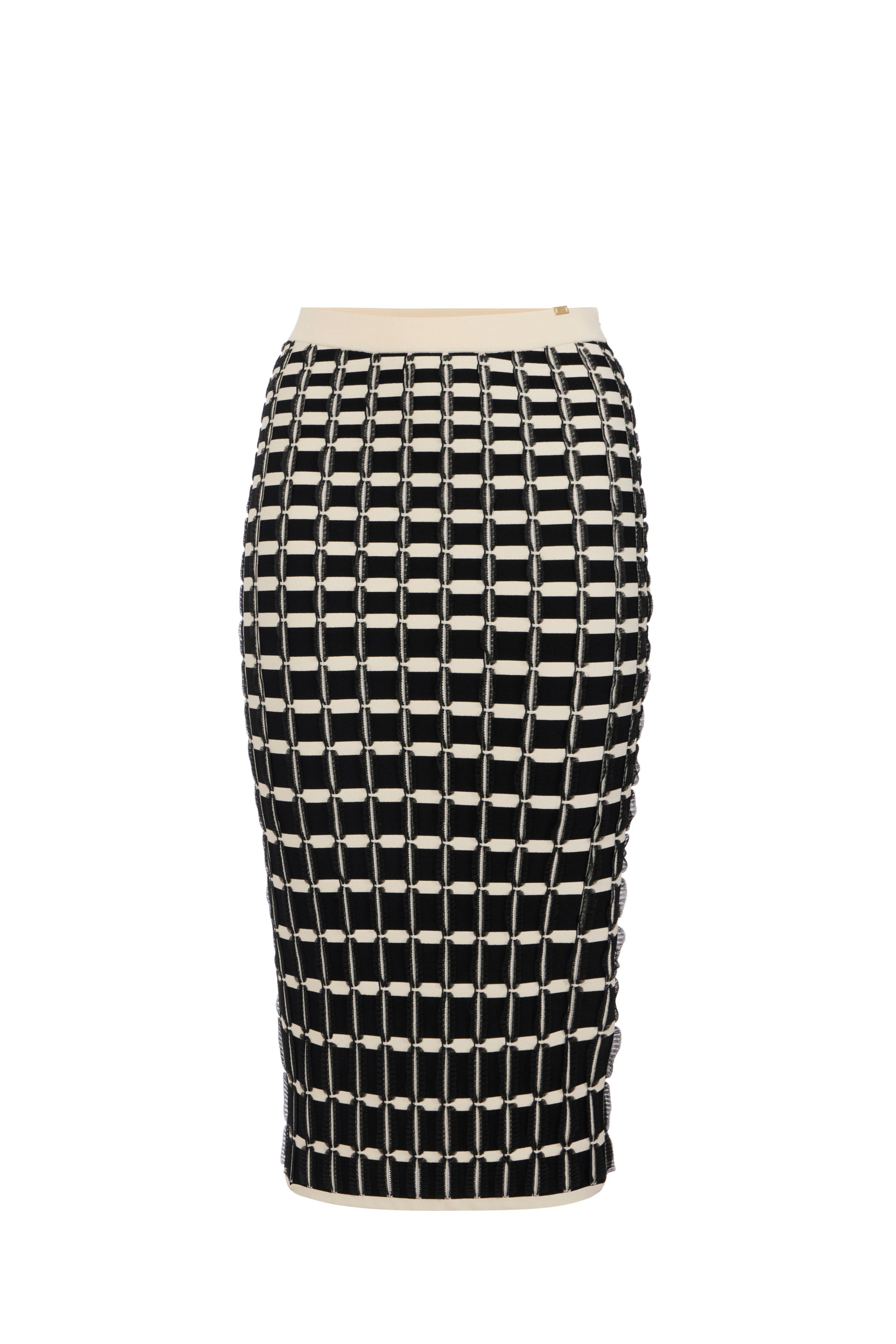 Viscose pencil skirt. The garment is characterised by an elaborate pattern of contrasting ruffles, giving it a striking silhouette. The golden metal logo plaque on the shoulder provides a touch of light. Slim fit.