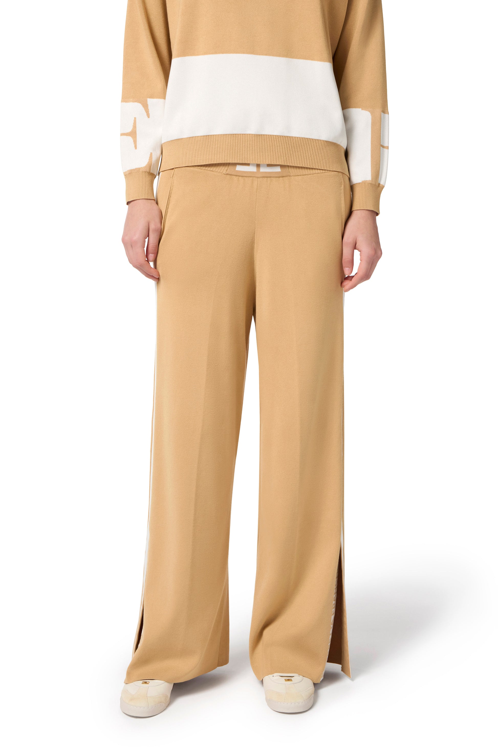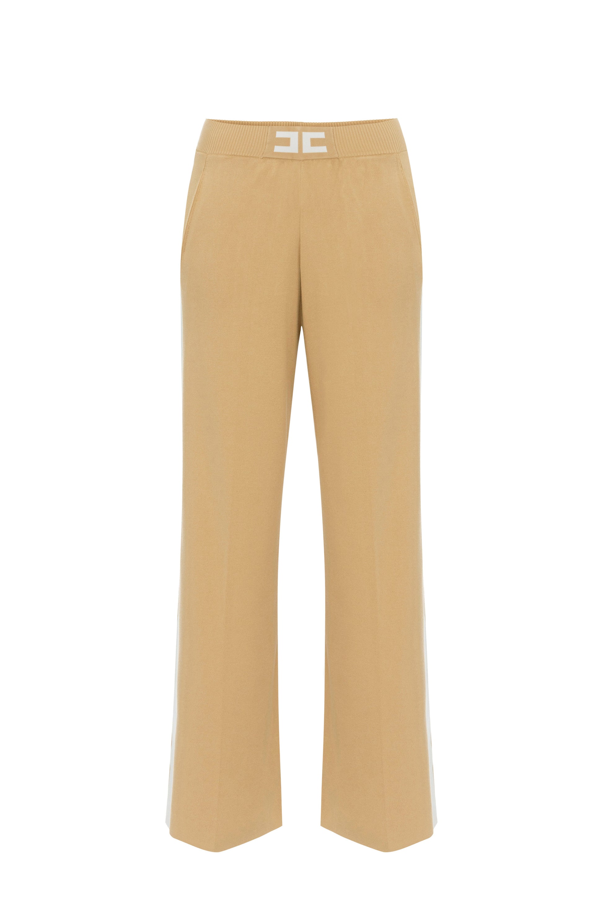 Trousers in viscose fabric with regular fit. They are characterised by the central logo at the waist and the side bands finished in shiny viscose that create elegant contrasts of texture and colour with the side logos. The palazzo line is enhanced by slits at the hemline that reveal a final logo detail.