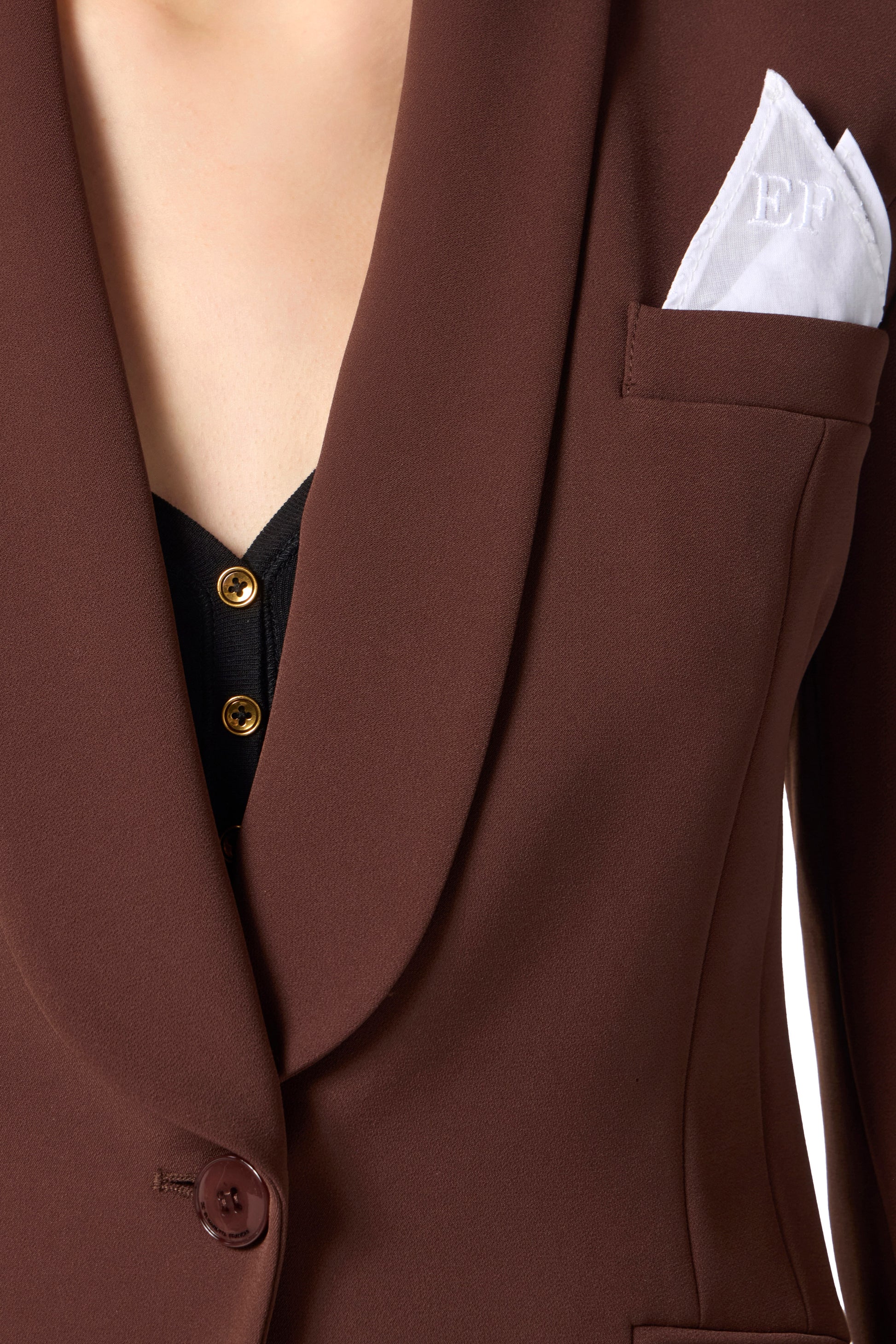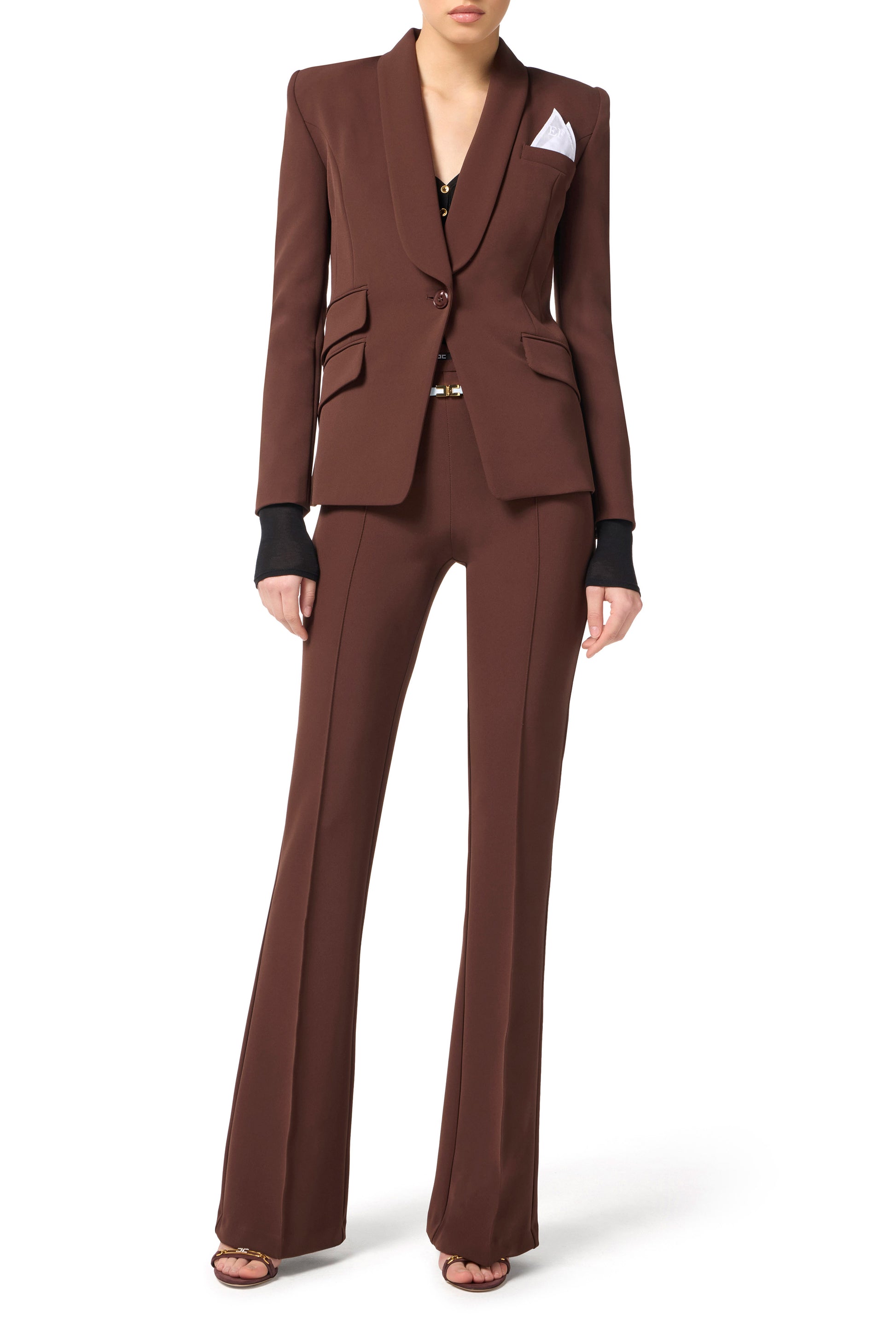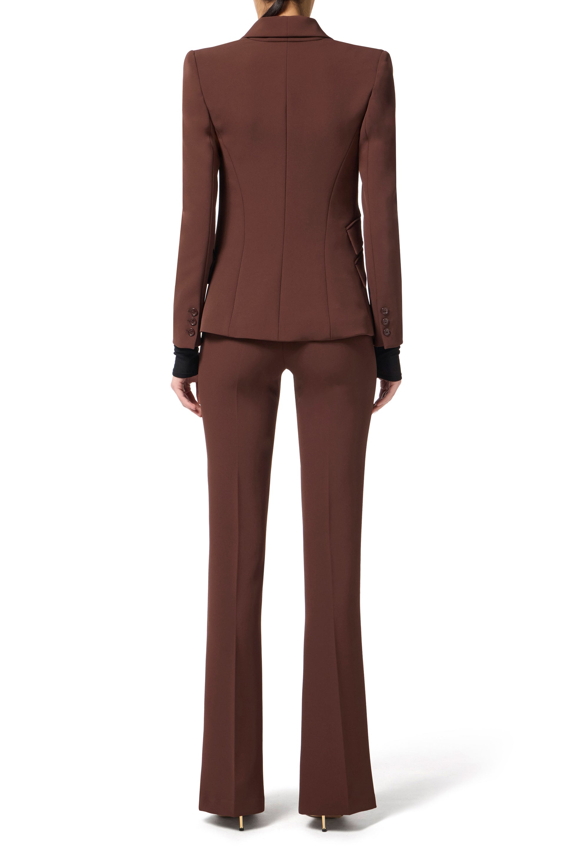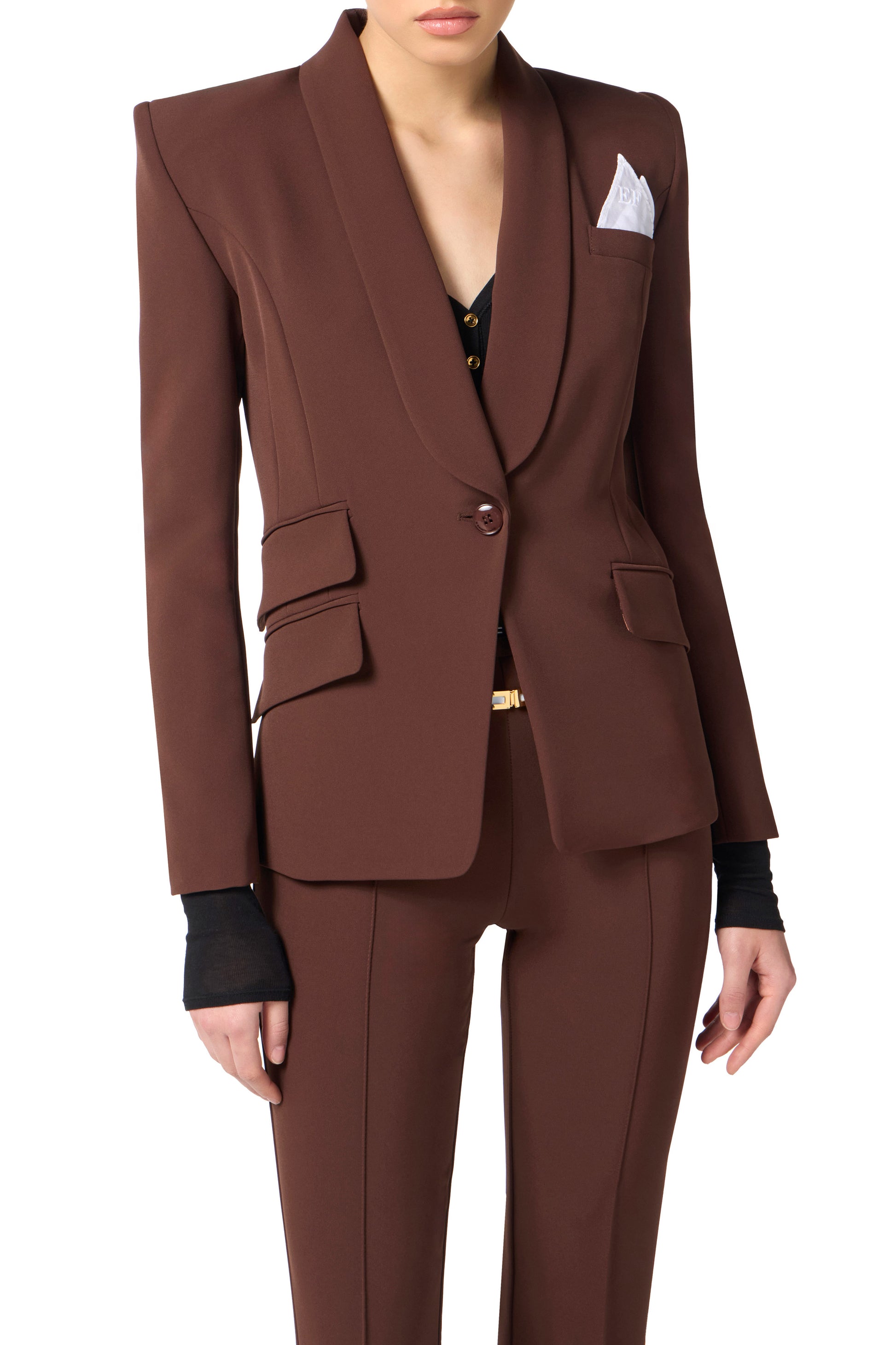 Single-breasted crêpe women’s suit consisting of jacket and trousers. The blazer has structured shoulders, a shawl collar, flaps and a breast pocket with a cotton poplin square pocket with an embroidered logo. The trousers have a flared line at the bottom and feature a ribbon with logo that decorates the waistband. Slim fit.