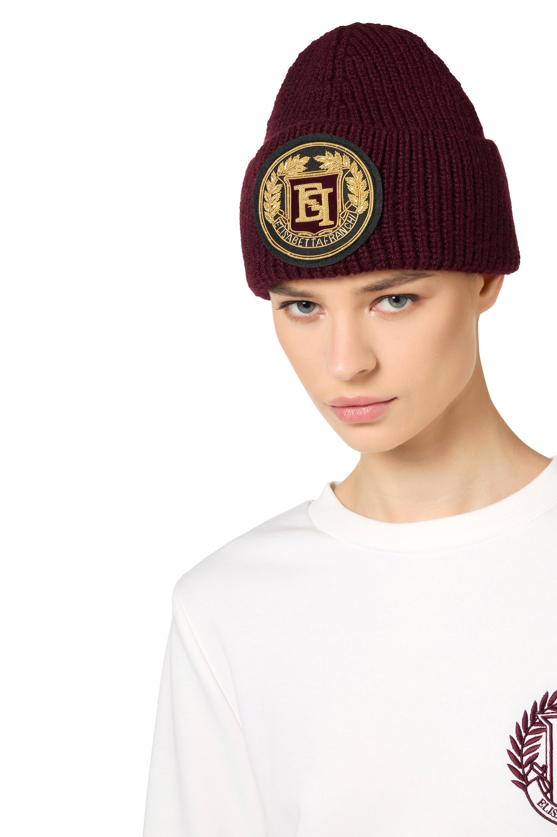 Wool blend ribbed beanie. It features a logo patch with lurex embroidery on the front.
