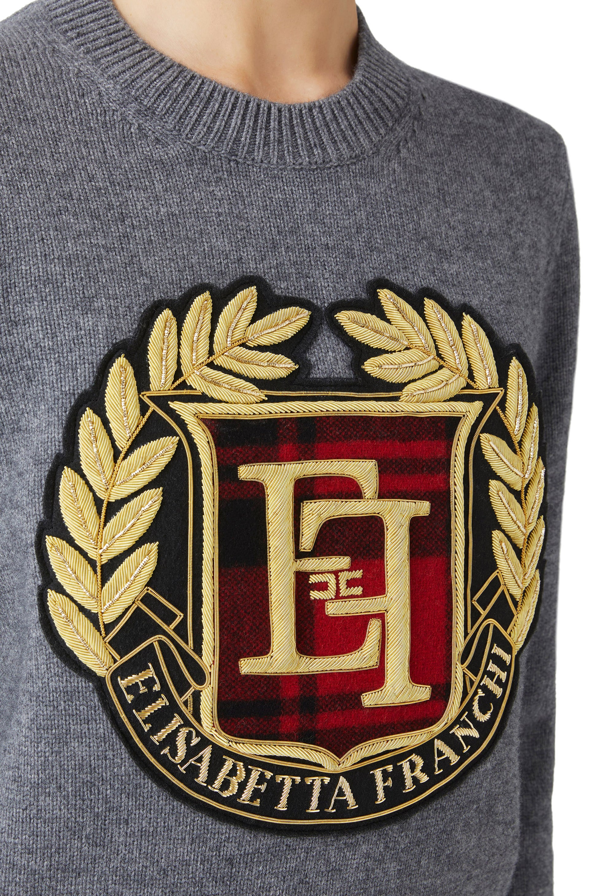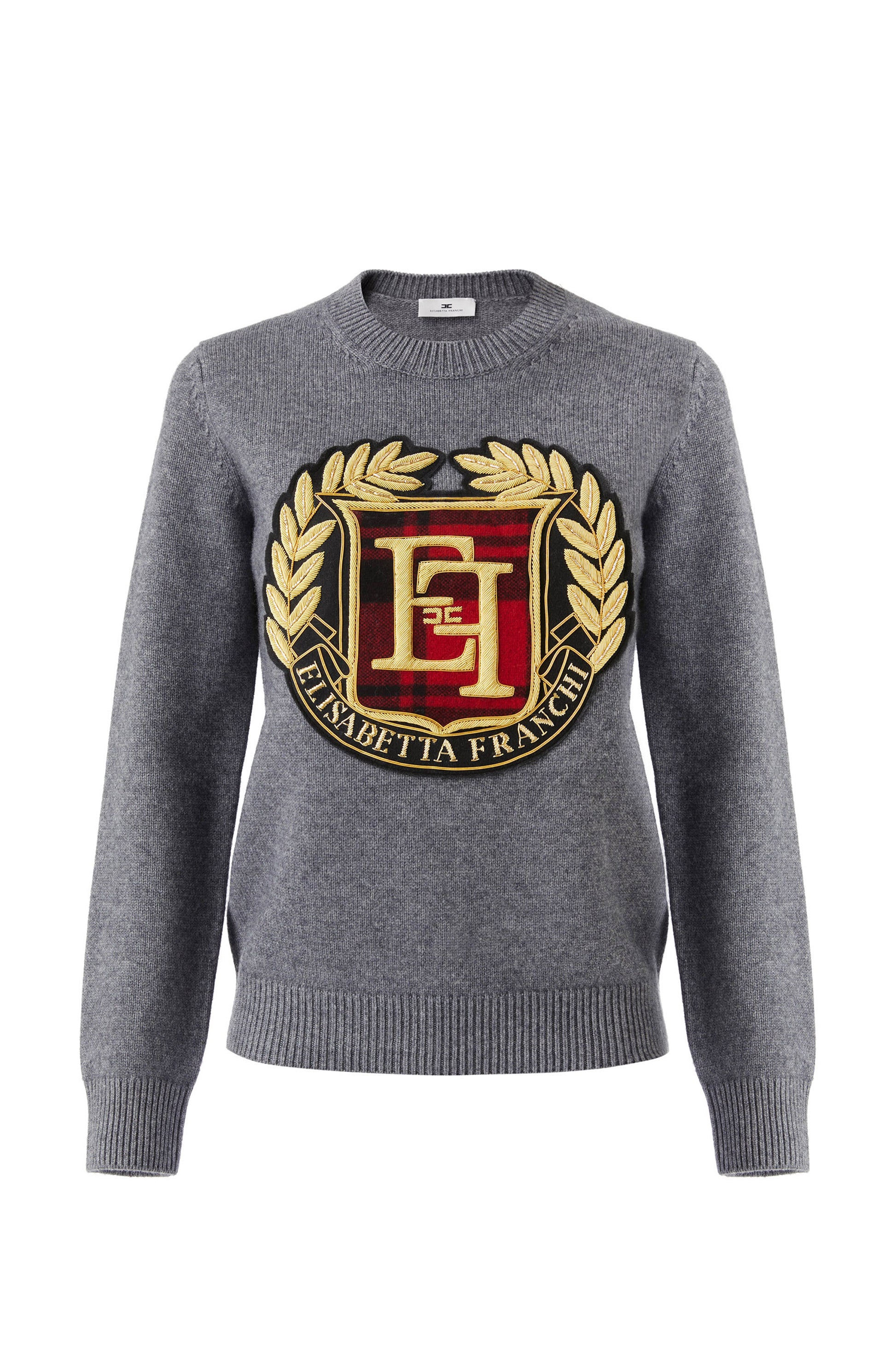 Pullover in wool blend with long sleeves, crew neck and ribbed finishing details. It features a maxi logo patch with embroidery in lurex, tartan and bugle beads on the front.