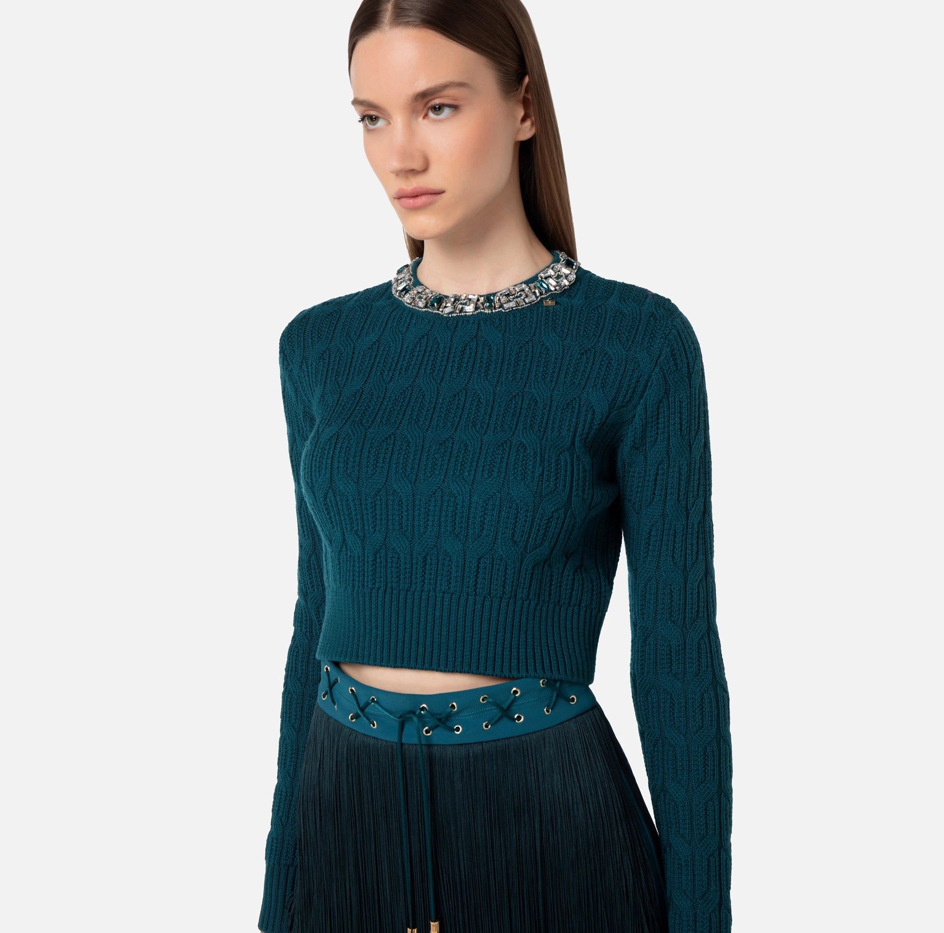 Wool top with long sleeves and a keyhole opening at the back. It features a hand-made embroidery on the neckline of matching rhinestones and bugle beads as well as a charm at the shoulder