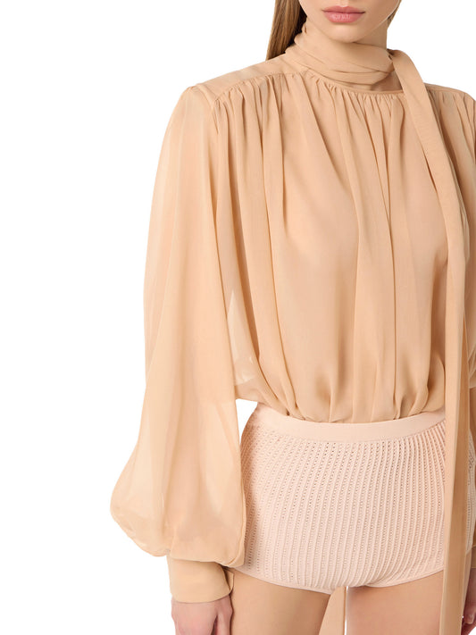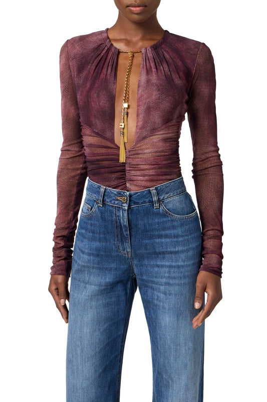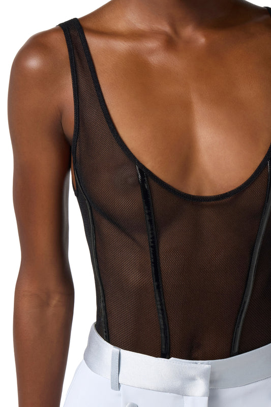 Bodysuit in tulle fabric with embroidery and narrow shoulder straps