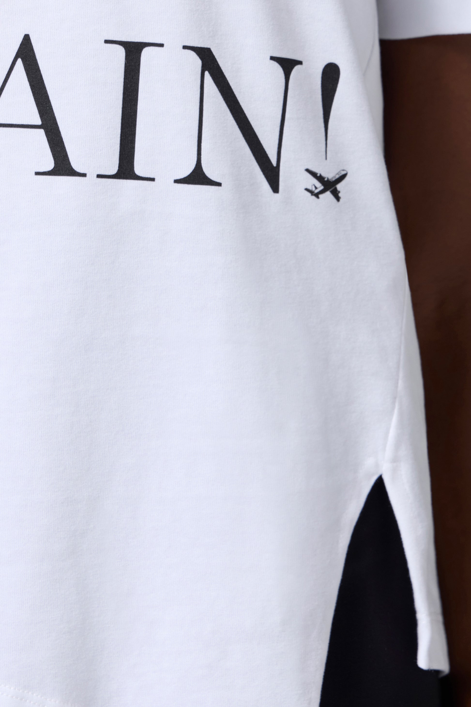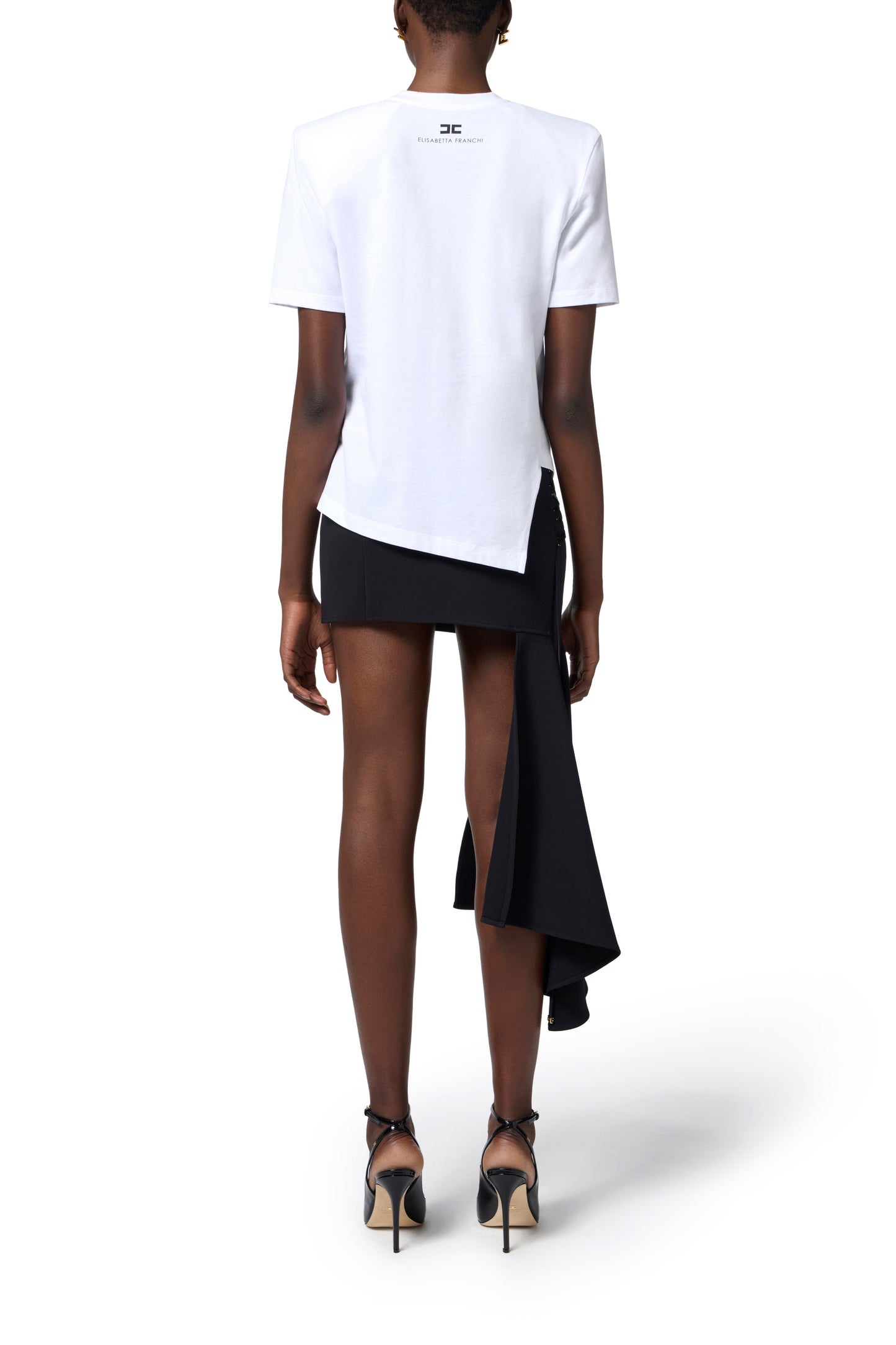 Short-sleeved cotton jersey T-shirt with slim fit. The garment features padded shoulders and an asymmetrical bottom that wraps around the left hip. The printed lettering on the front adds a striking message to an essential garment.