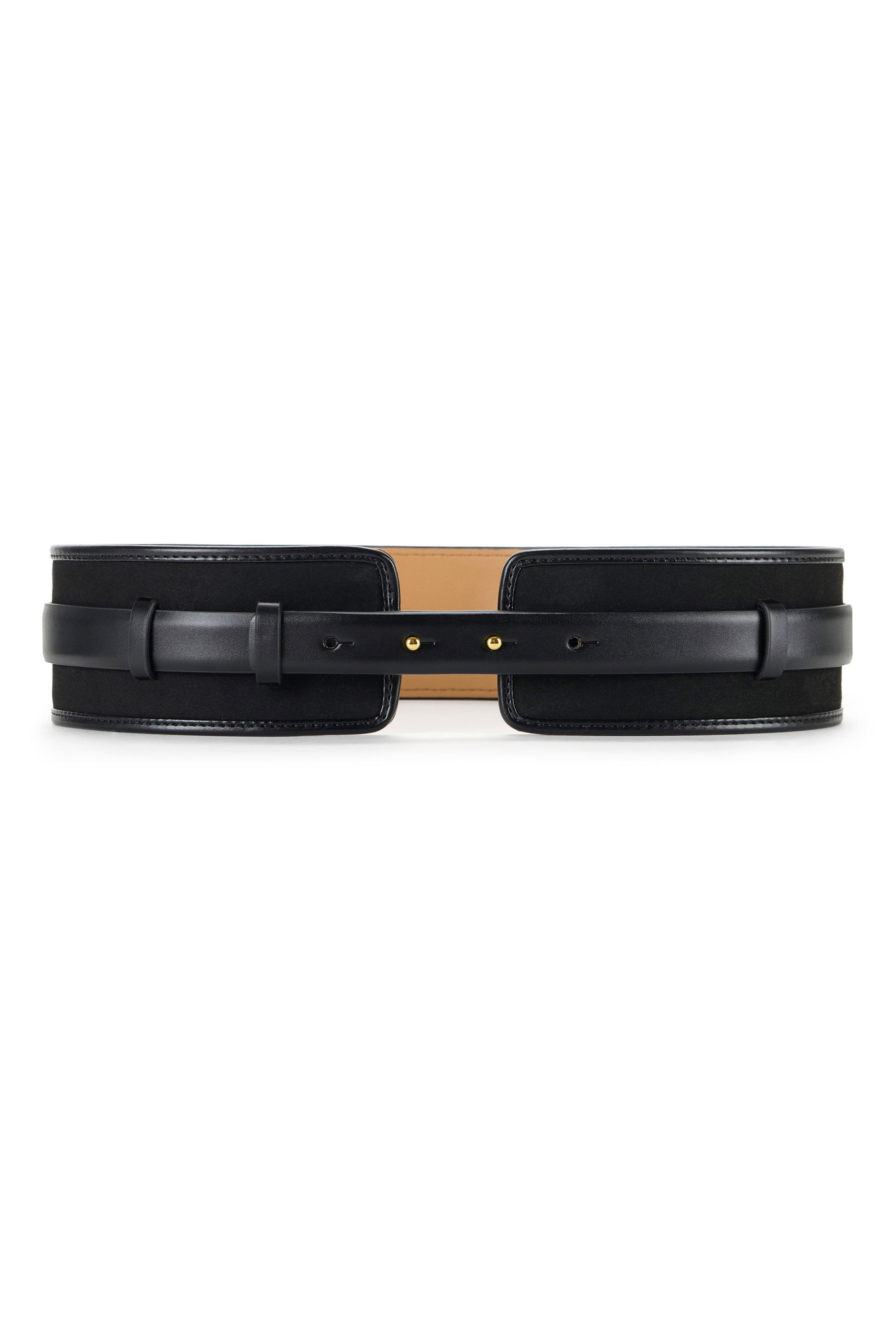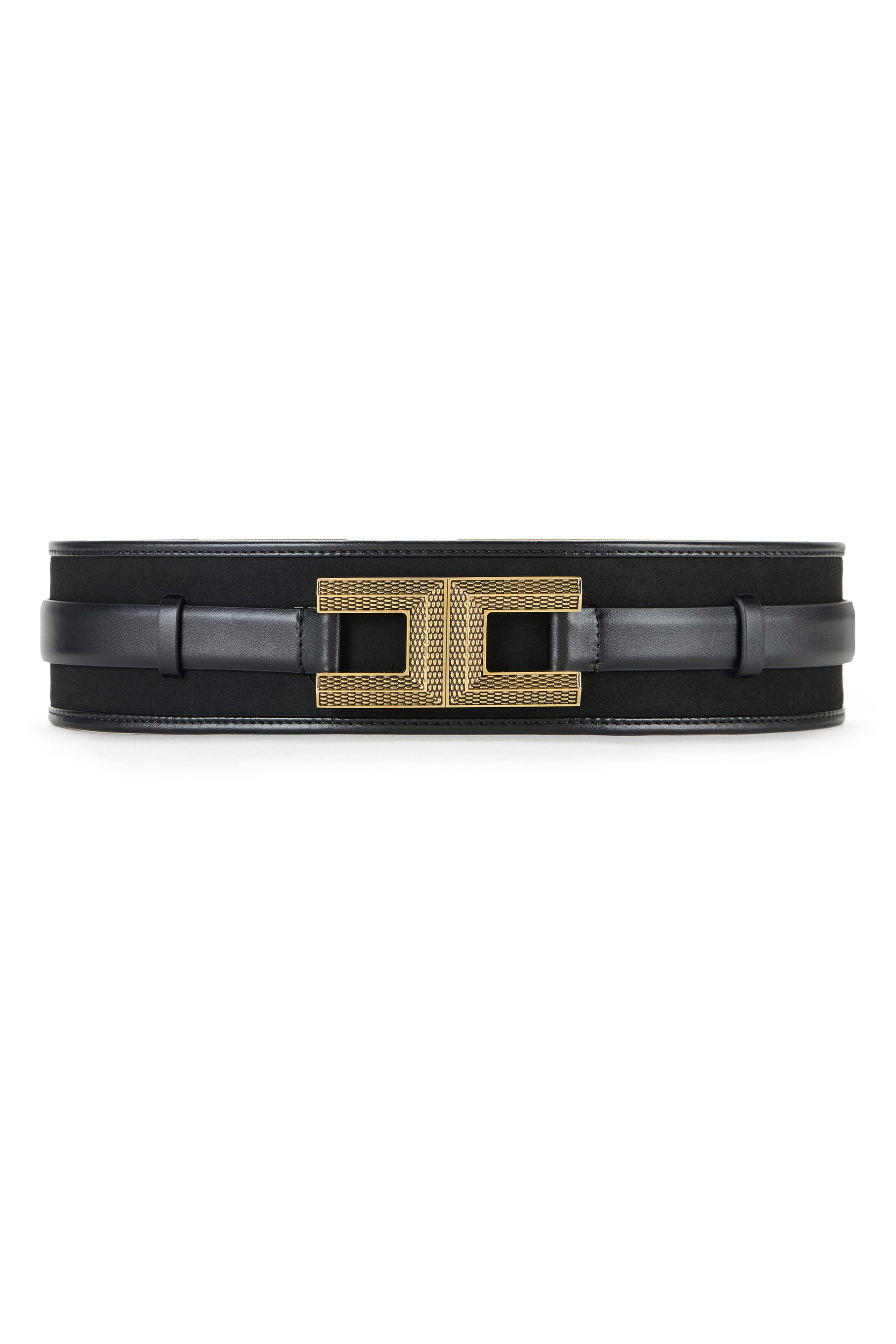 Regular waist belt in synthetic leather-effect material. It is embellished with golden metal detail with snake-inspired pattern. Closure with round head button studs.