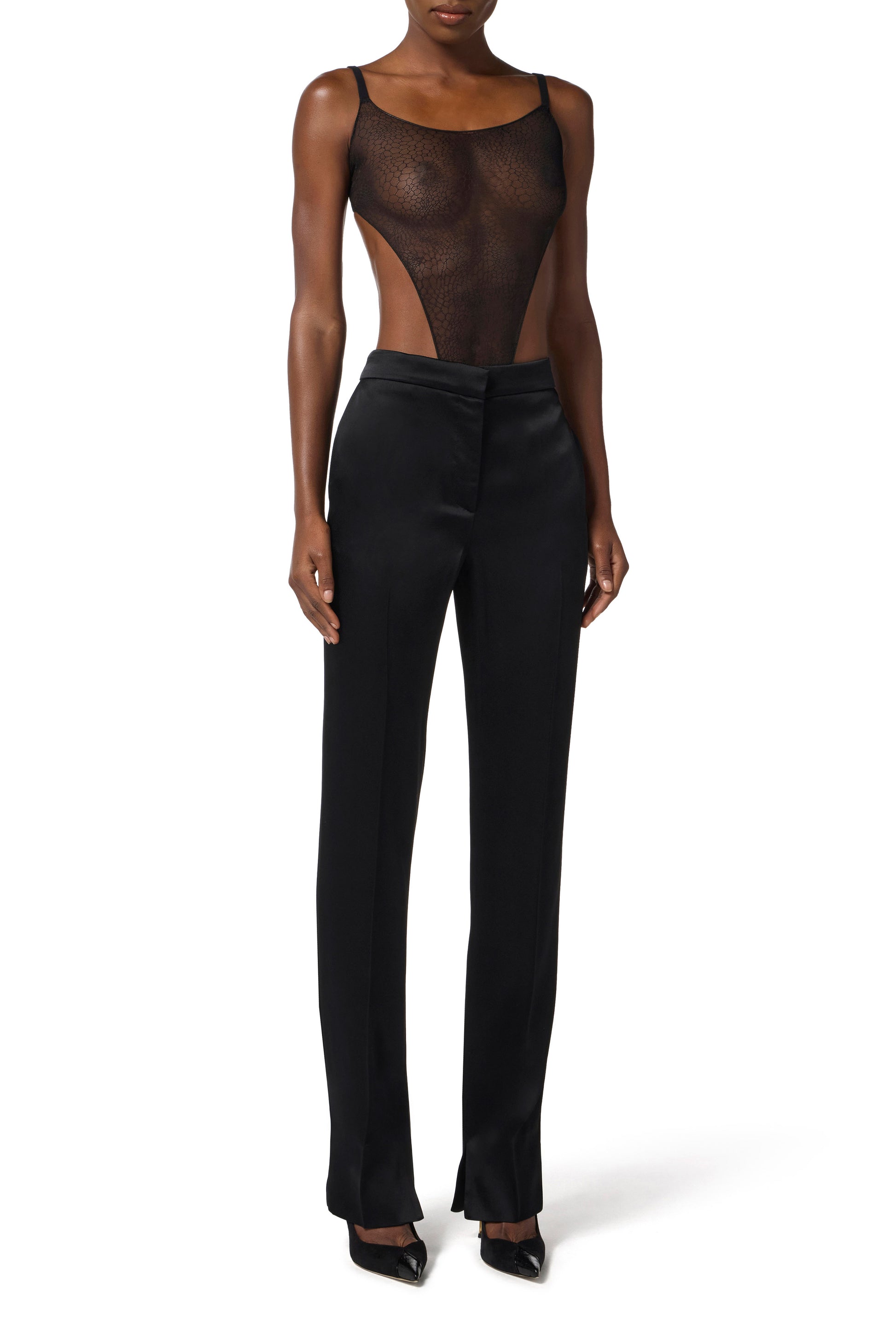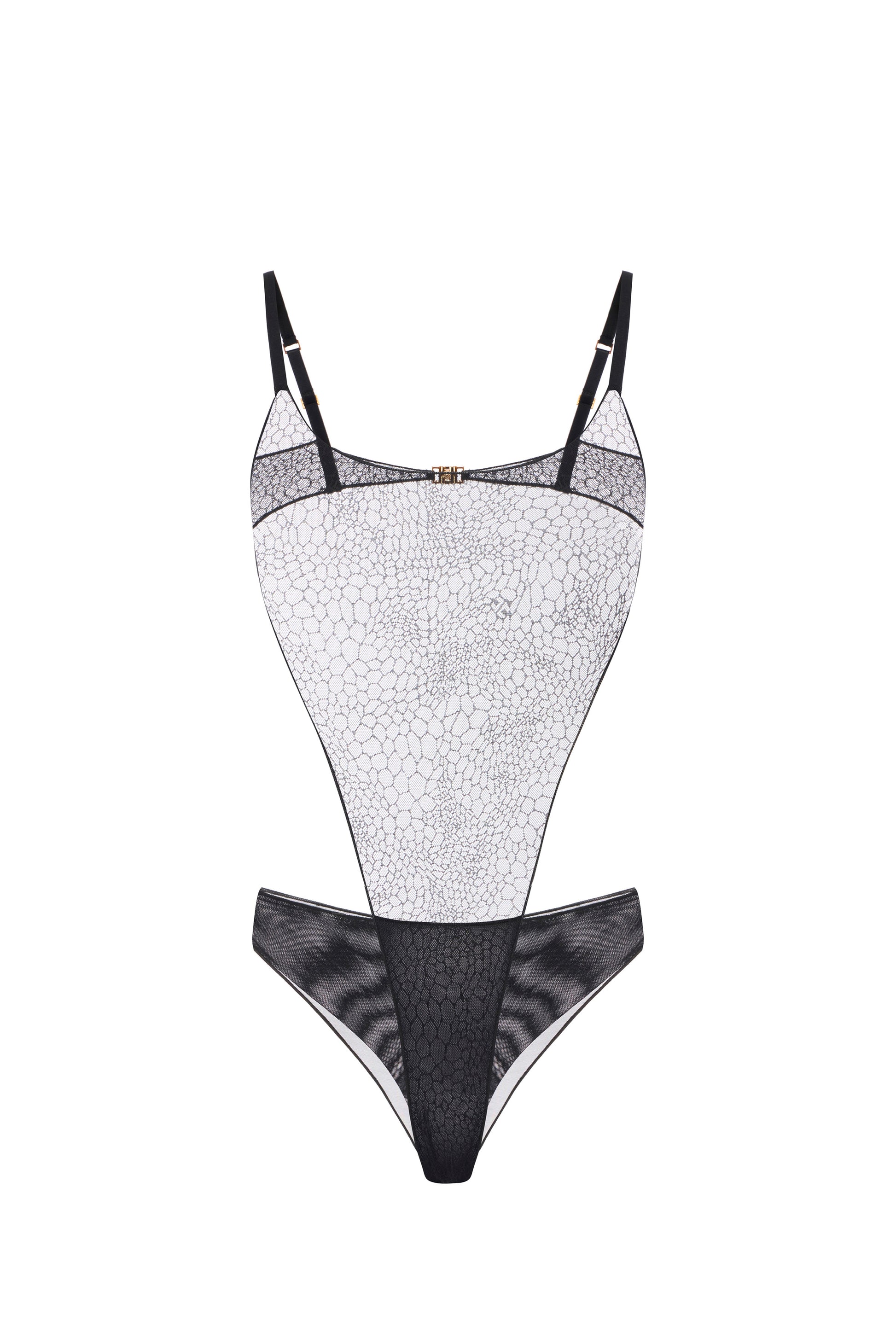 Bodysuit in tulle fabric with slim fit. With high leg and thin straps, it has bold cuts that leave the hips and back uncovered. It stands out for its jacquard workmanship with a snake-inspired pattern to give movement.