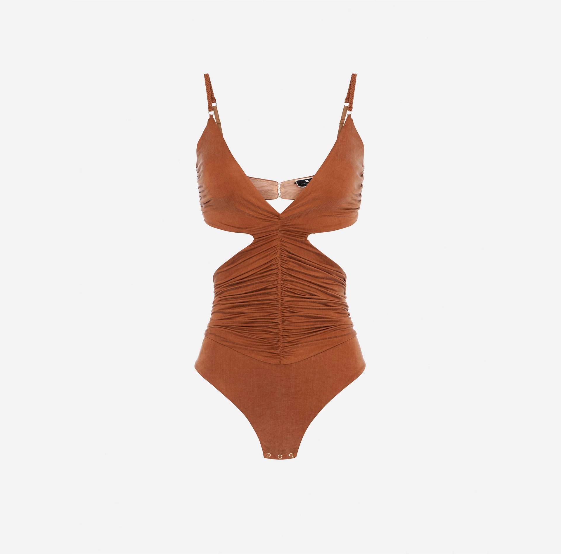 Bodysuit in cupro jersey fabric with braided straps and gathers on breast and bust area.