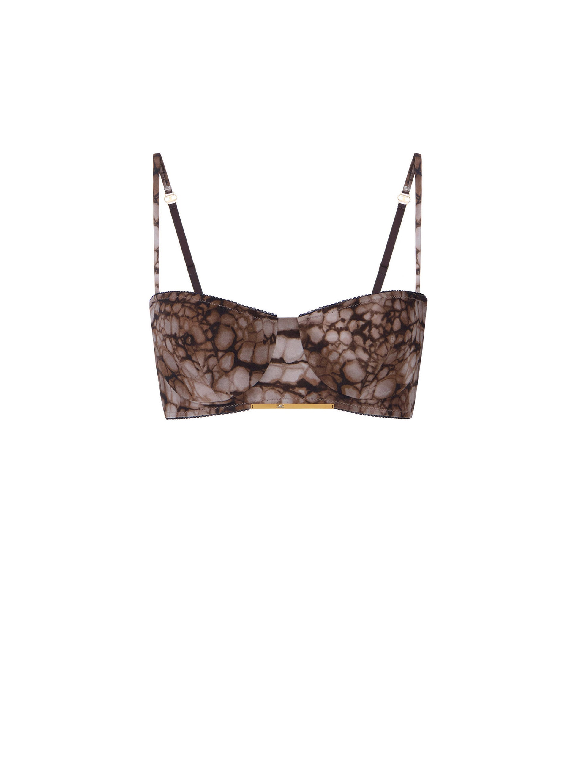 Cady bra with back in tulle fabric. The star feature is the alligator-patterned all-over print, inspired by natural shapes and geometries. A golden metal logo plaque under the cups adds a touch of light. Slim fit.