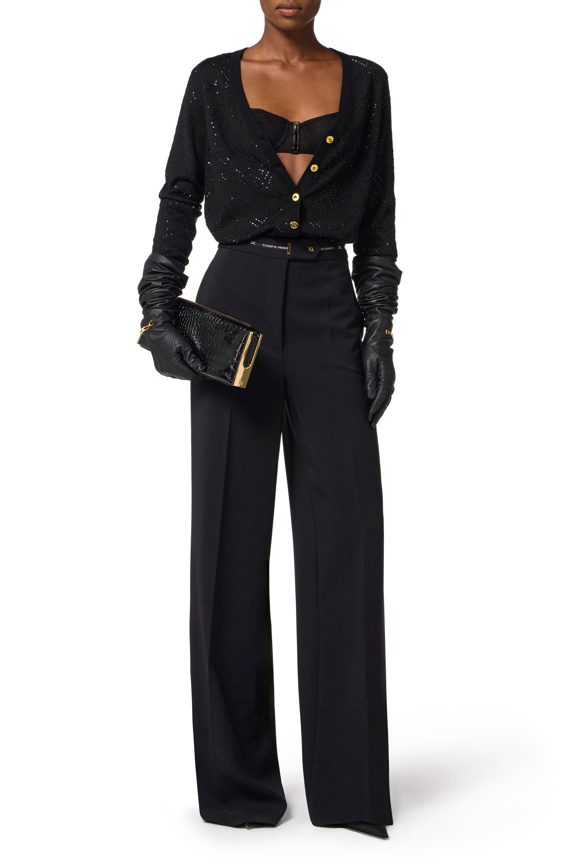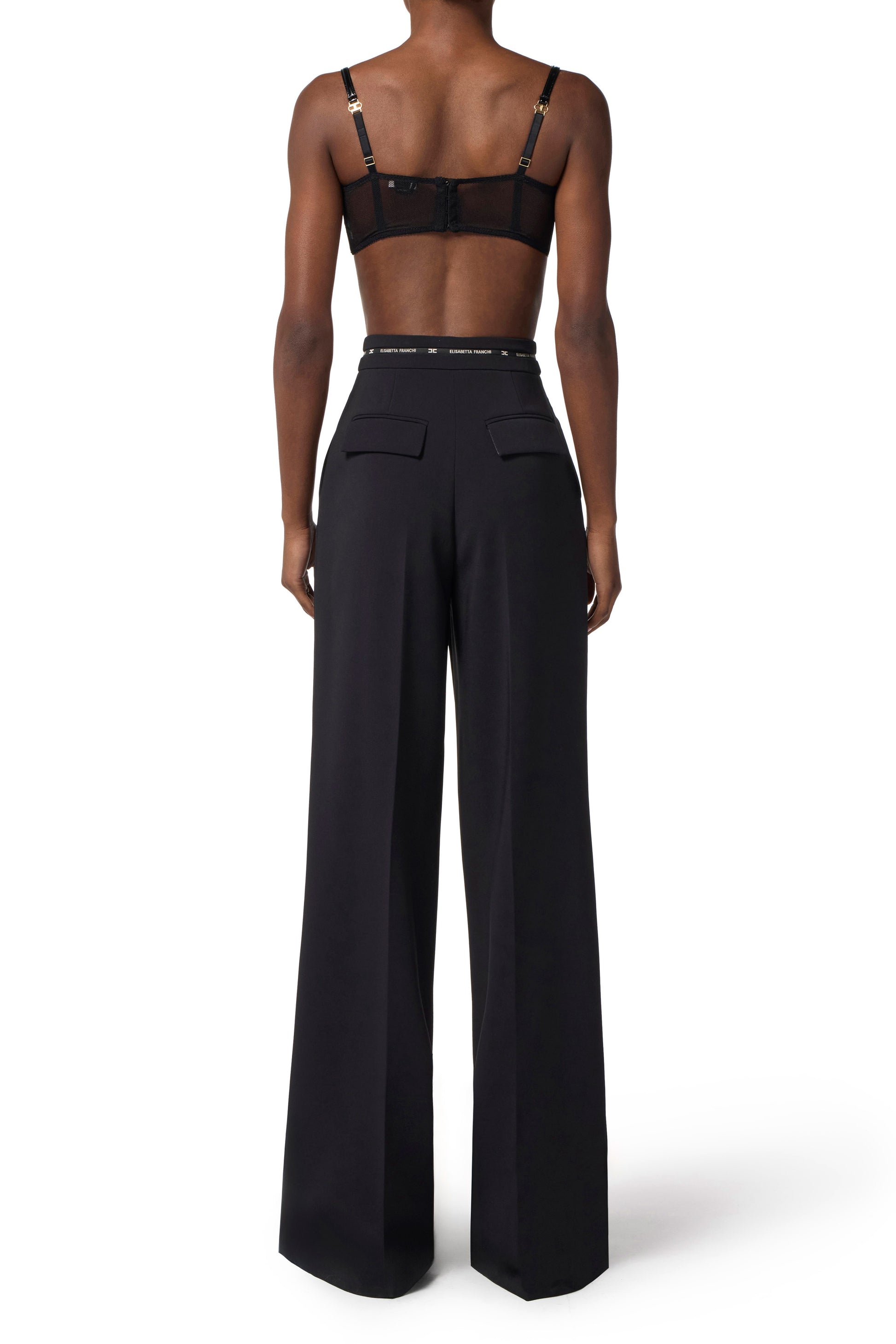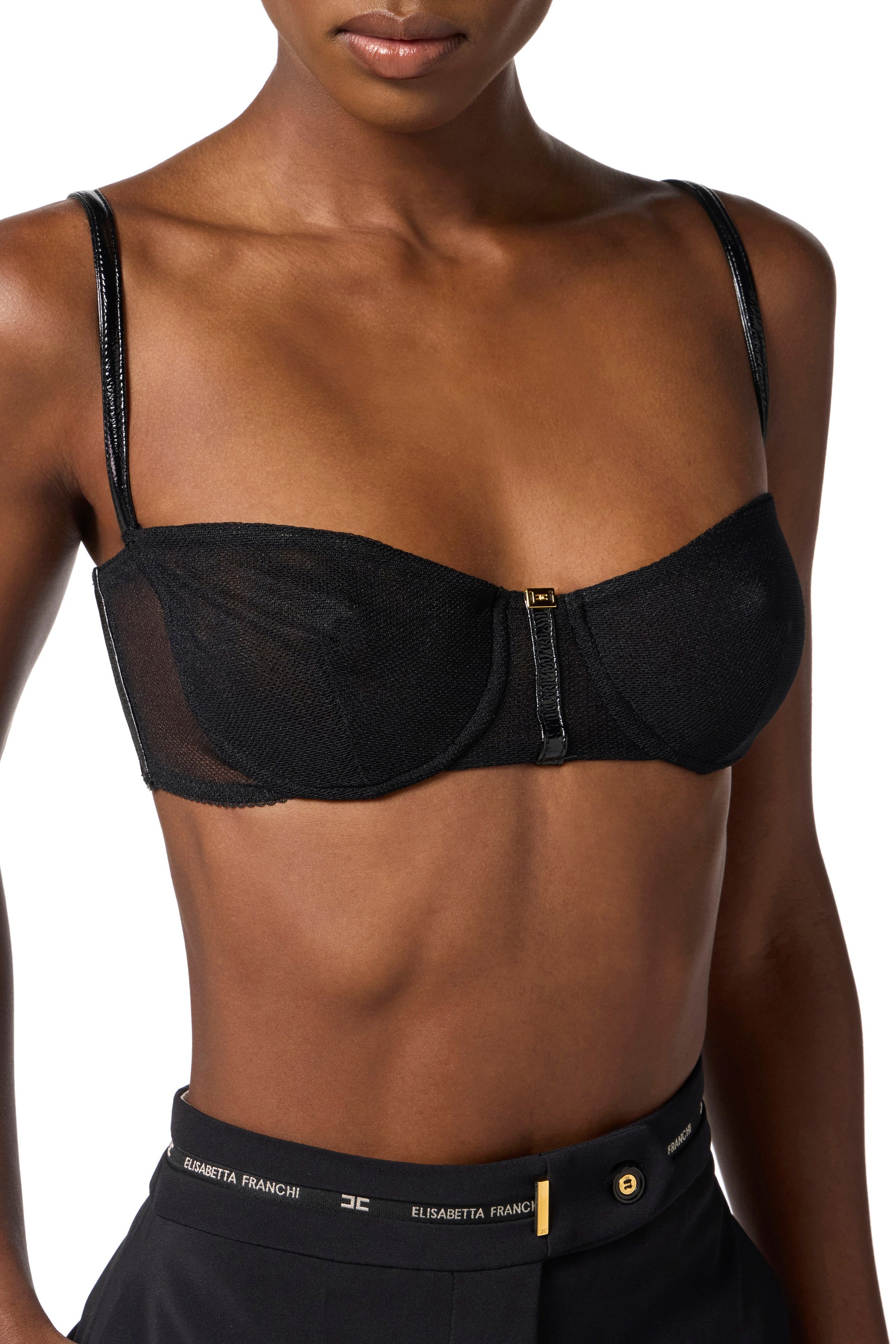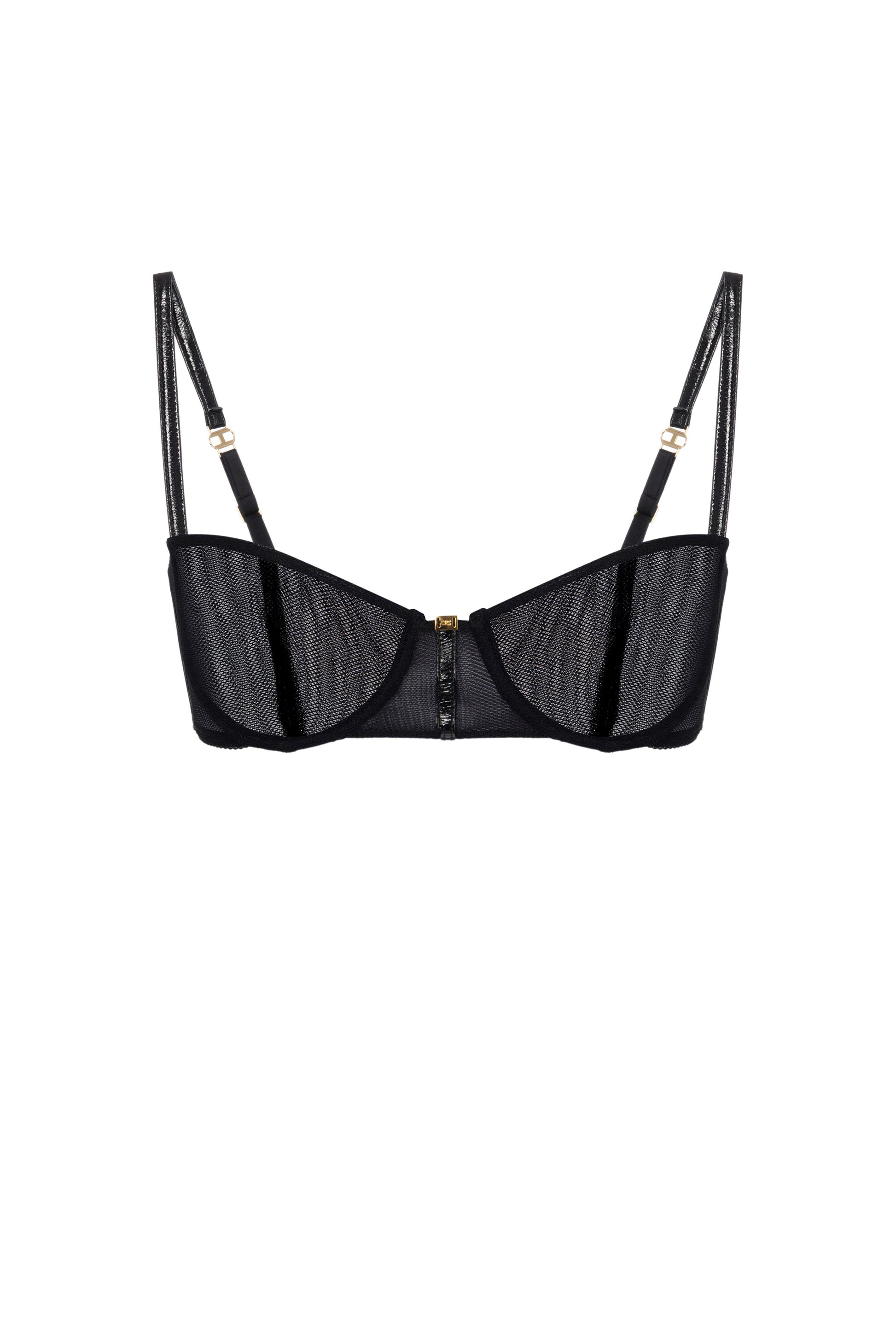 Bra in stretch tulle fabric with cup construction. It is characterised by vinyl details that create interesting texture contrasts. Hook closure.