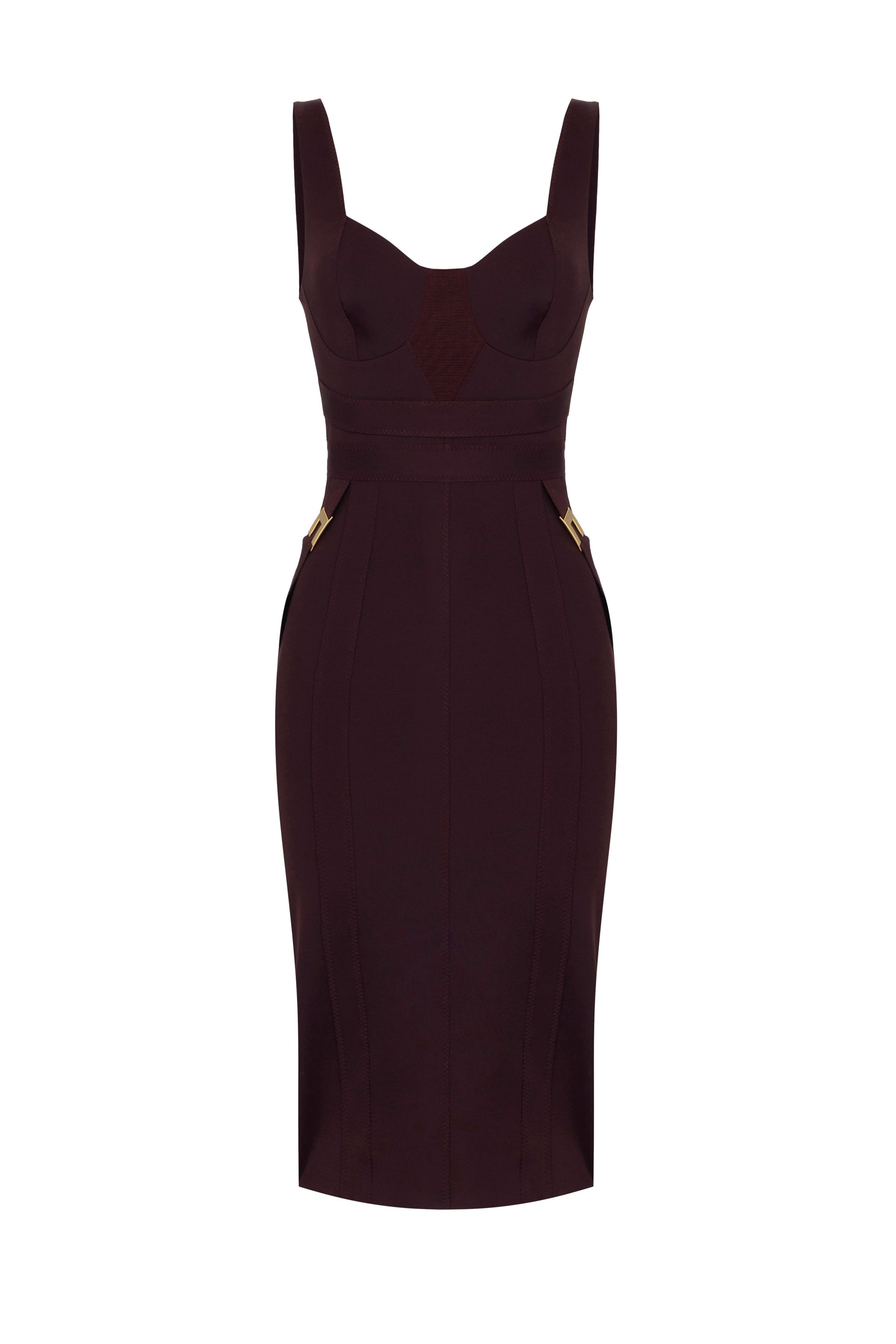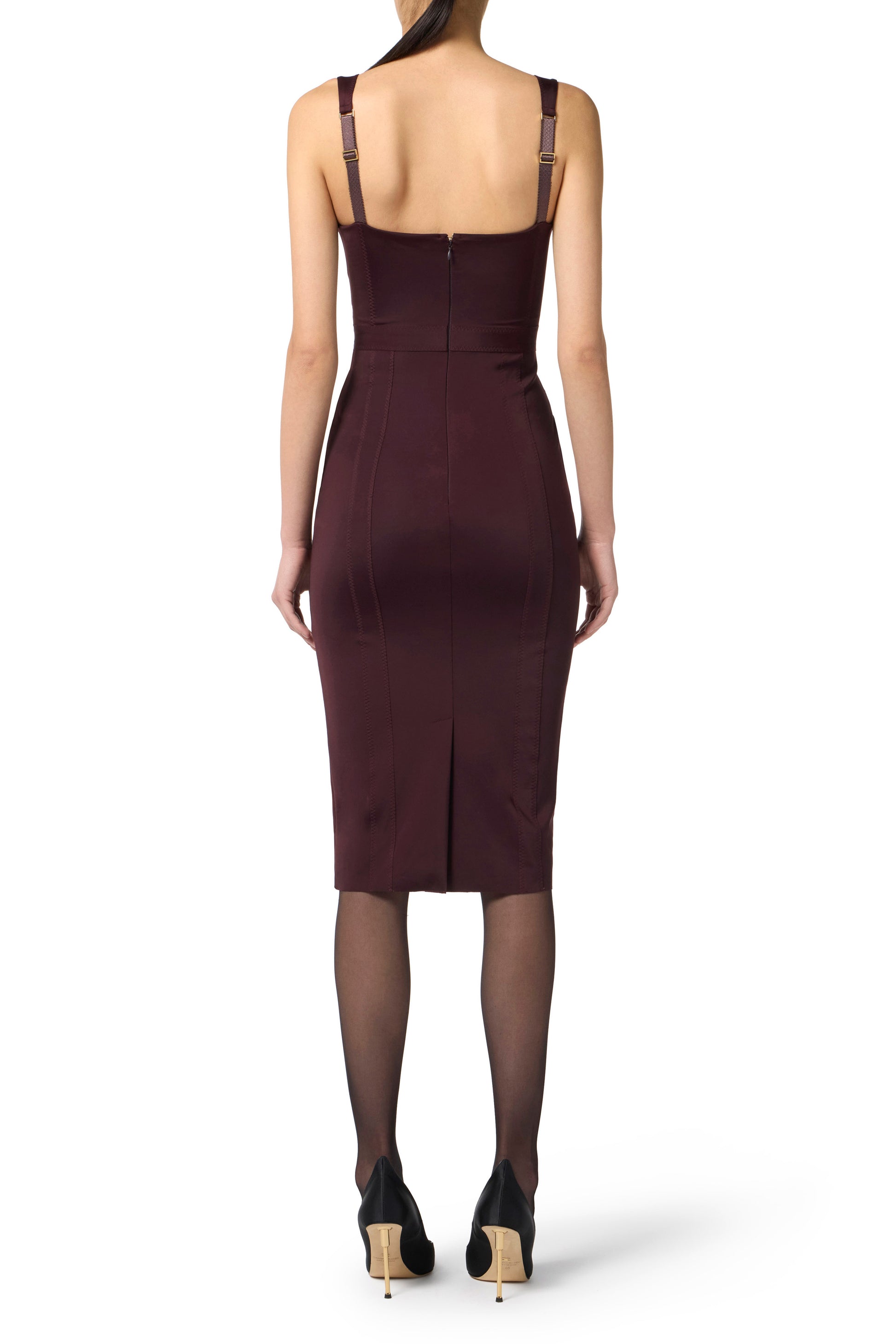 Sheath dress in bi-elastic fabric with slim fit. The strap dress echoes the world of corsetry with zigzag topstitching and cuts with a bustier effect, sculpting the silhouette. Tulle inserts and jewelled logo details complete the garment.