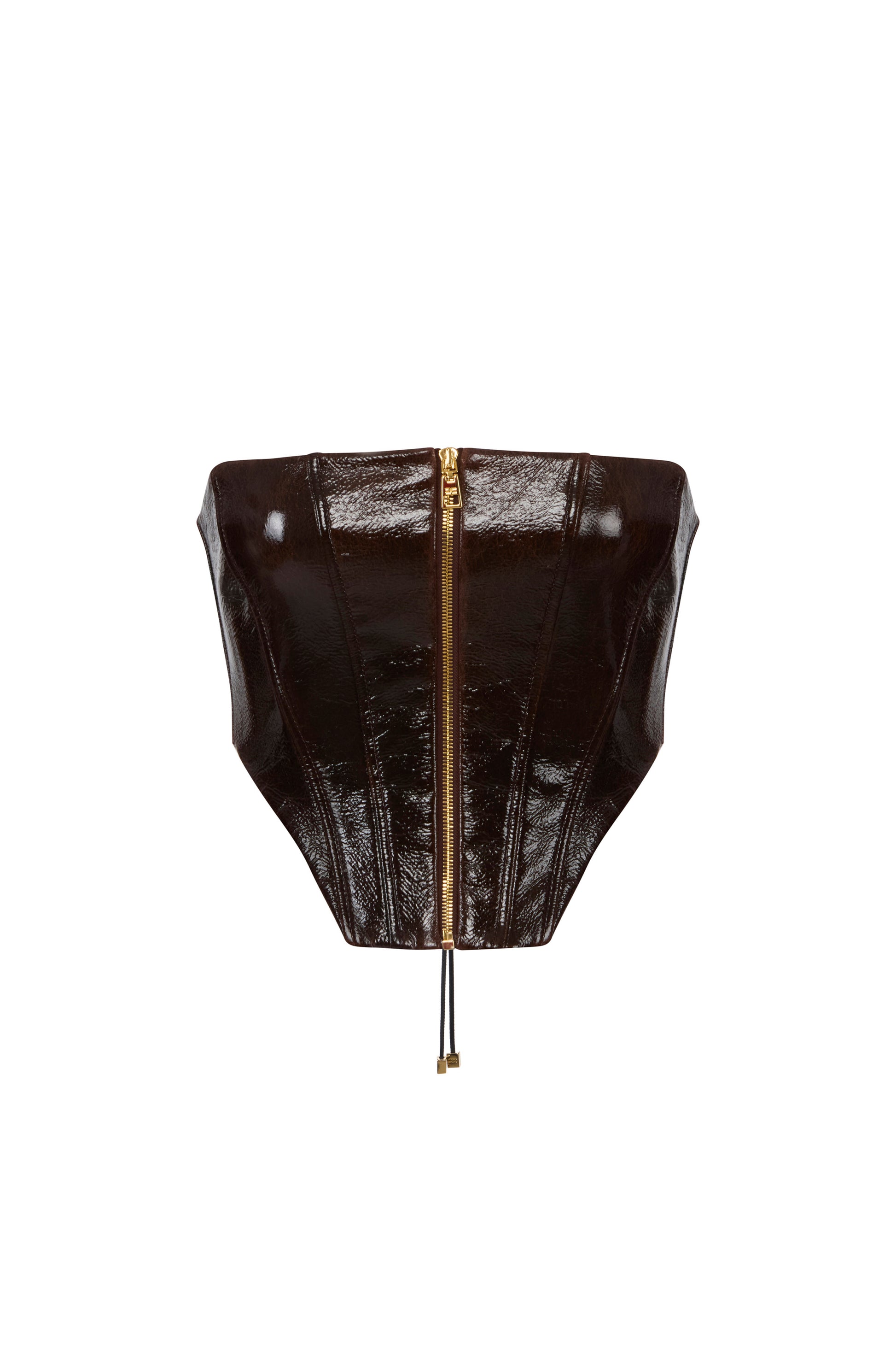 Top made of coated cloth fabric with a bustier construction. Inspired by the most seductive corsetry, it has internal splints that give structure and criss-cross laces at the back. The golden metal zip illuminates the bust. Slim fit.