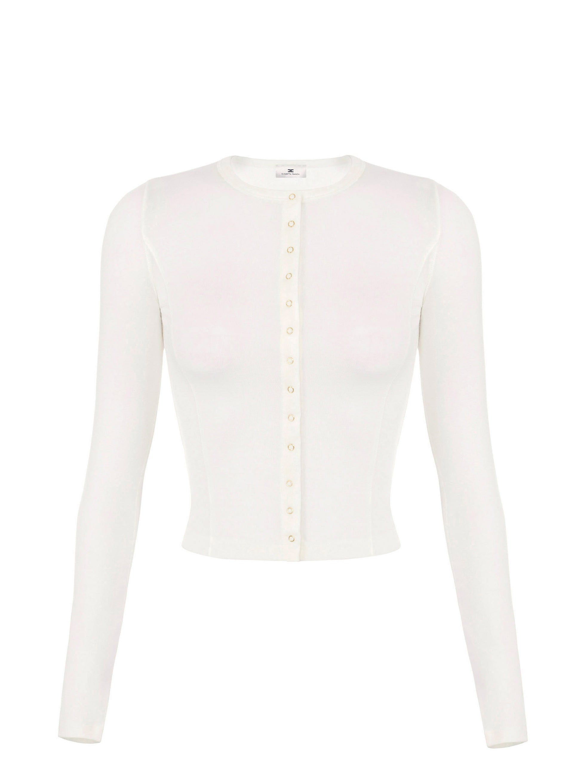 Cardigan in lightweight jersey fabric. With a crew neck and long sleeves, it has a minimalist silhouette defined by unusual cuts. The front is embellished with an embroidered logo in matching thread, while a label is added on the back of the neck. Slim fit.