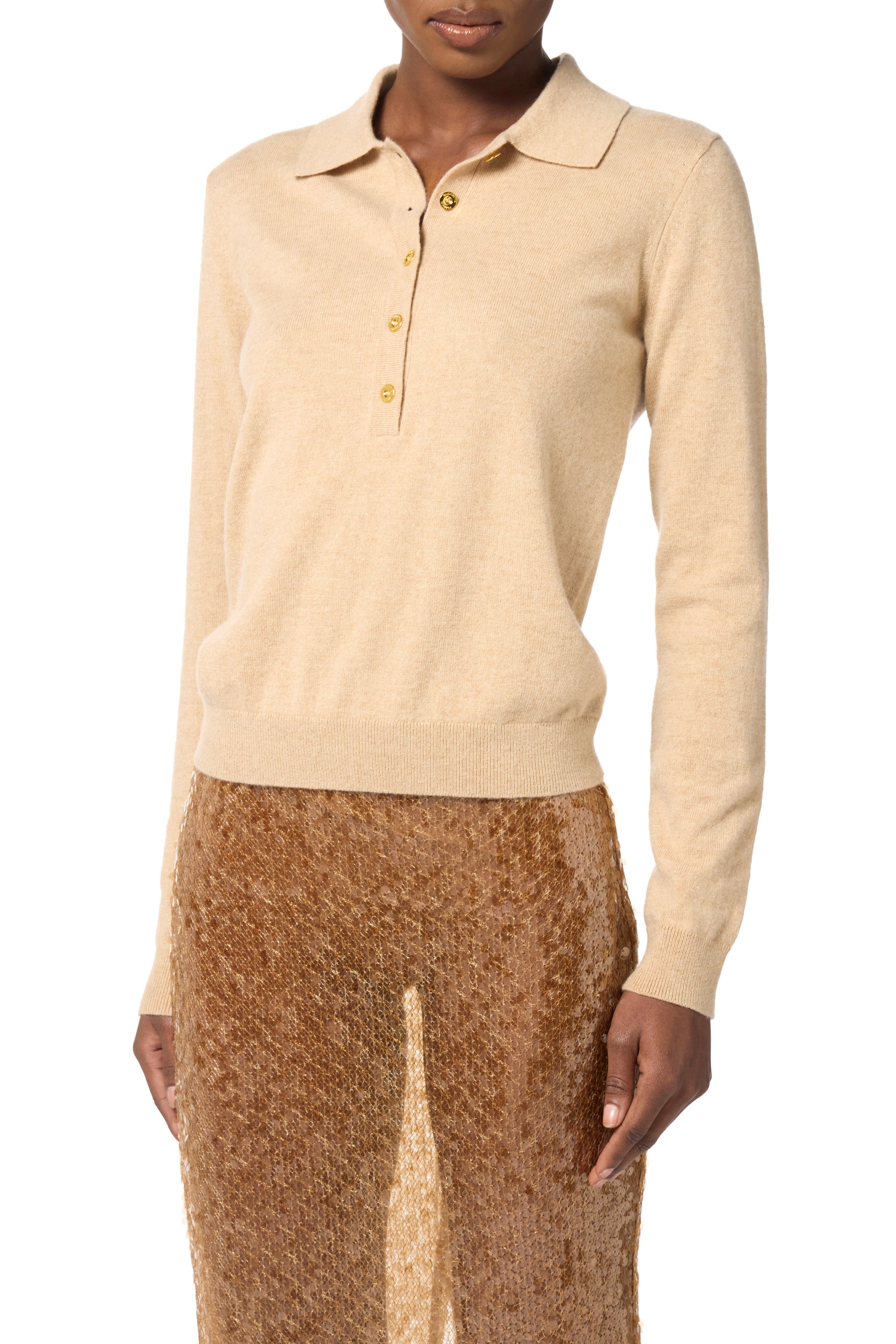 Cashmere blend jumper with regular fit. It has a polo shirt collar and long sleeves and a soft texture that caresses the skin. Golden metal buttons add a touch of light and complete the garment.
