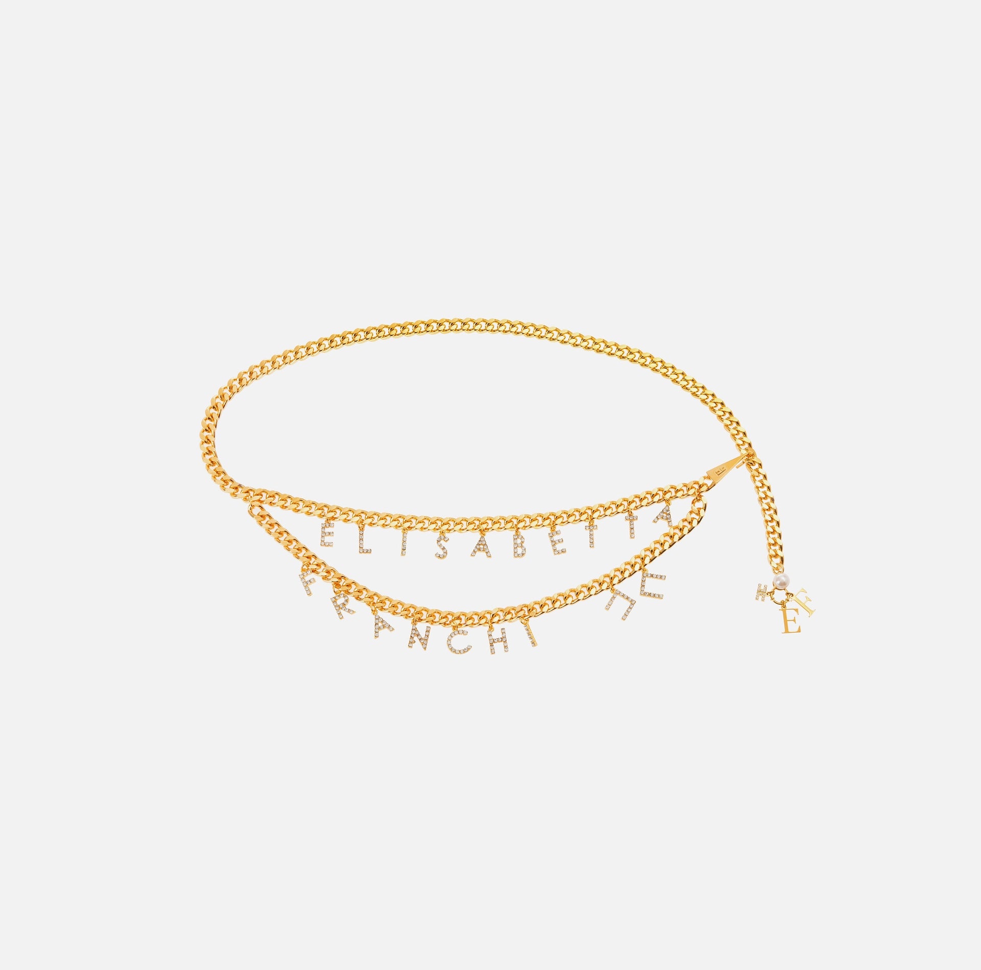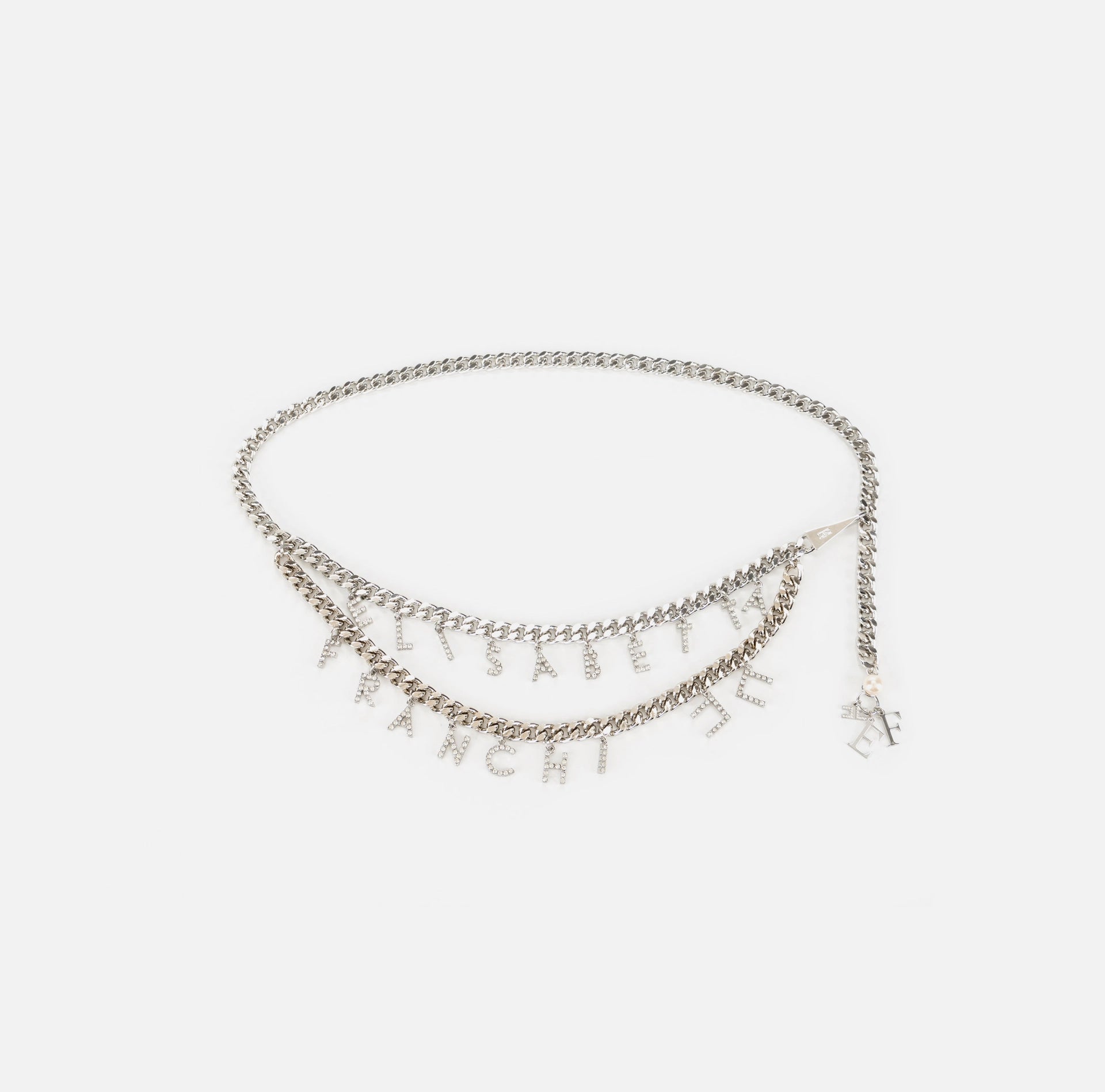Chain belt with rhinestone lettering. It features a hook closure with logo charms and pearls.