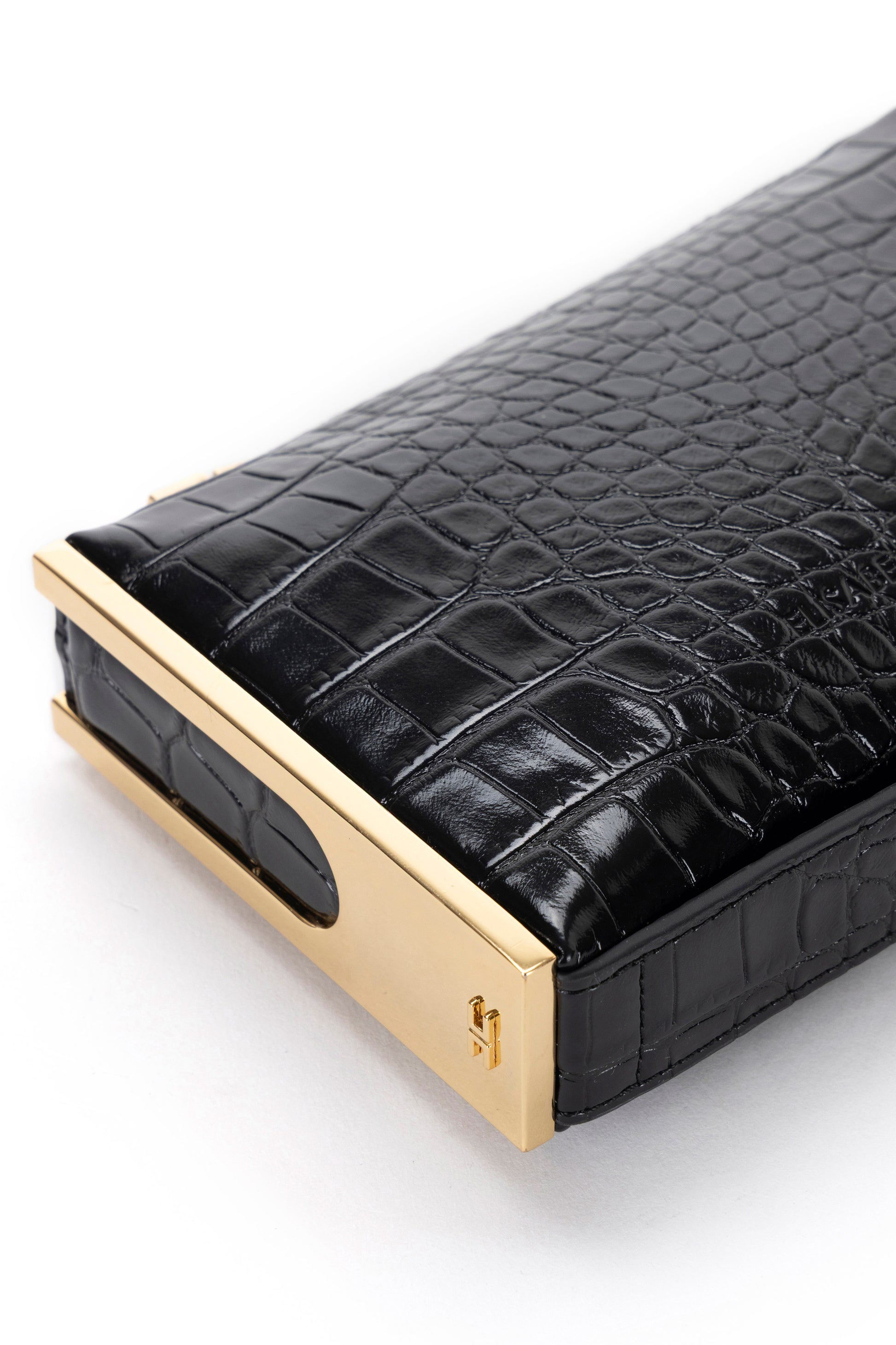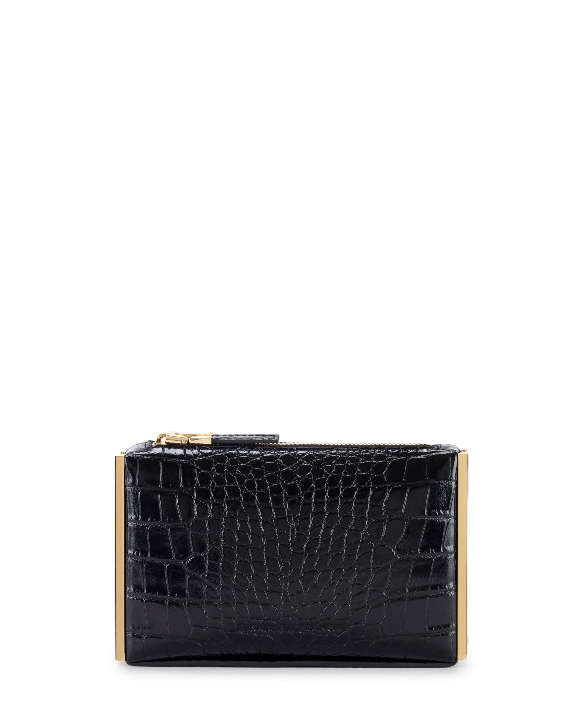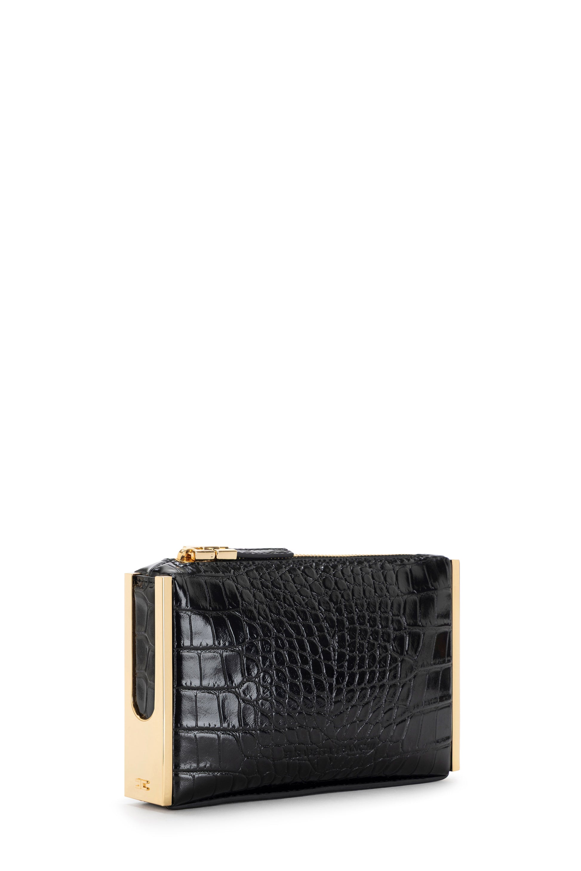 Clutch bag in synthetic leather-effect material. The crocodile print texture lends character to the accessory, embellished with golden metal side plaques with logo. Zip closure.