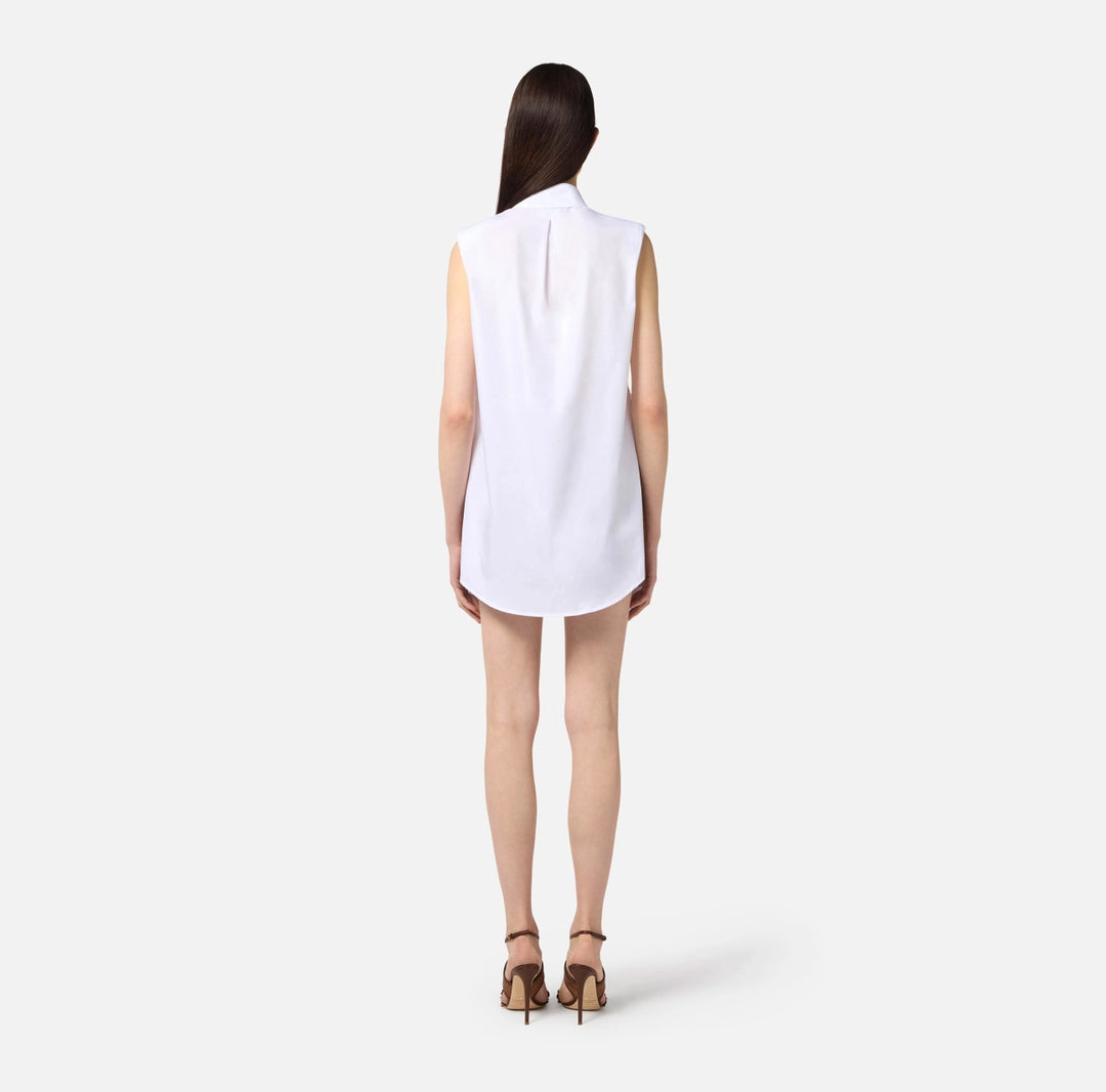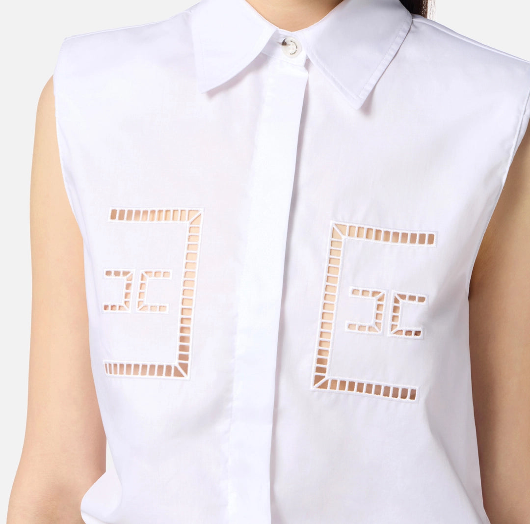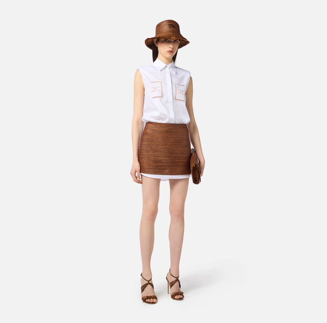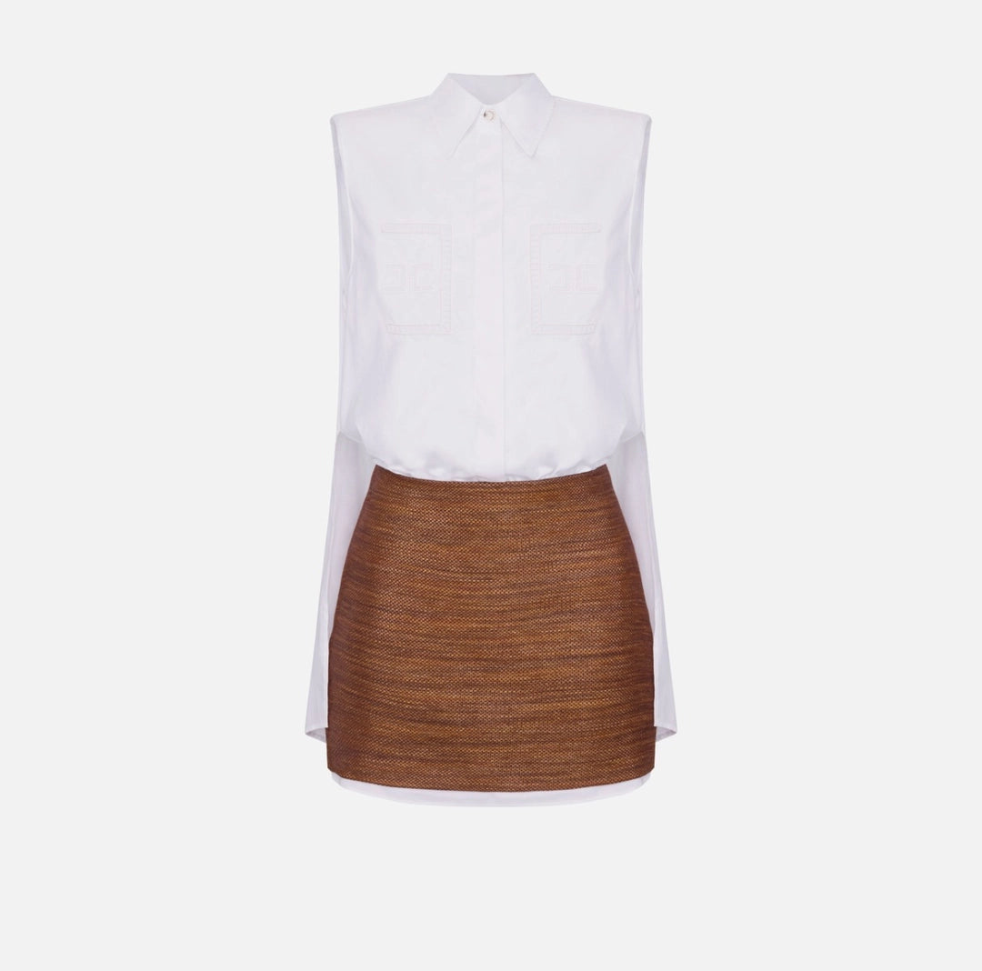 Cotton poplin sleeveless dress with slim fit. The dress features structured shoulders and shirt collar. It is characterised by a raffia skirt that creates an especially designed overlapping effect. The logo openwork embroideries are hand-made and bestow sumptuous lightness.