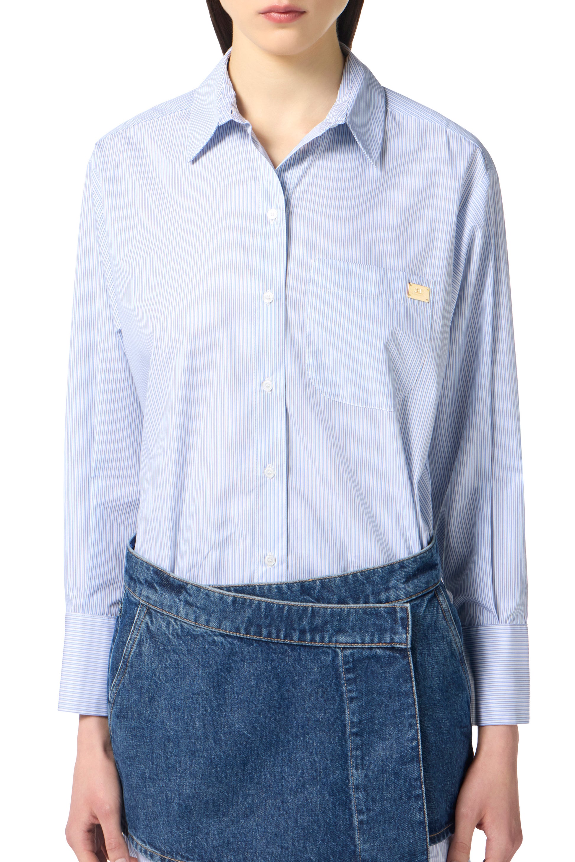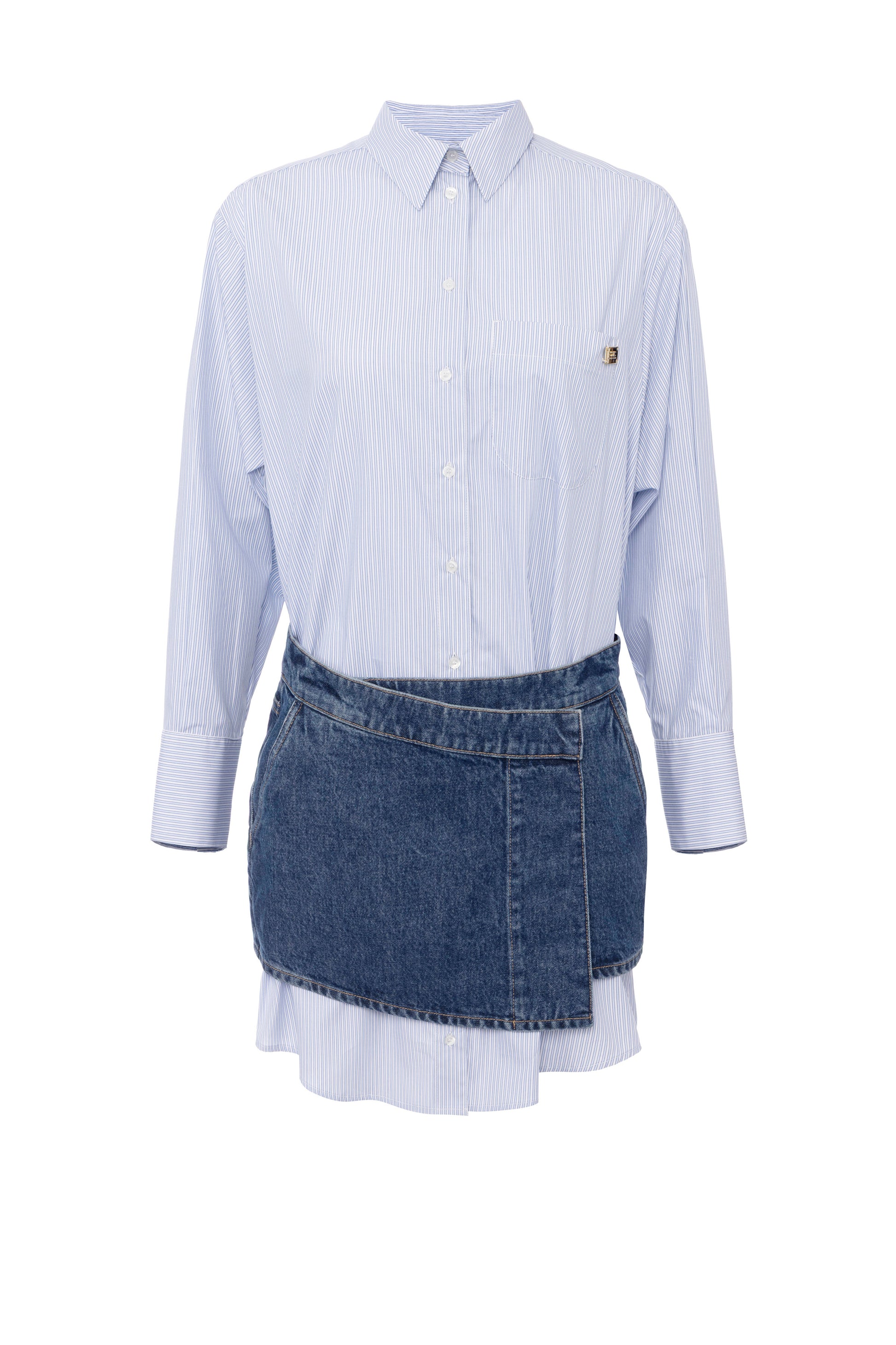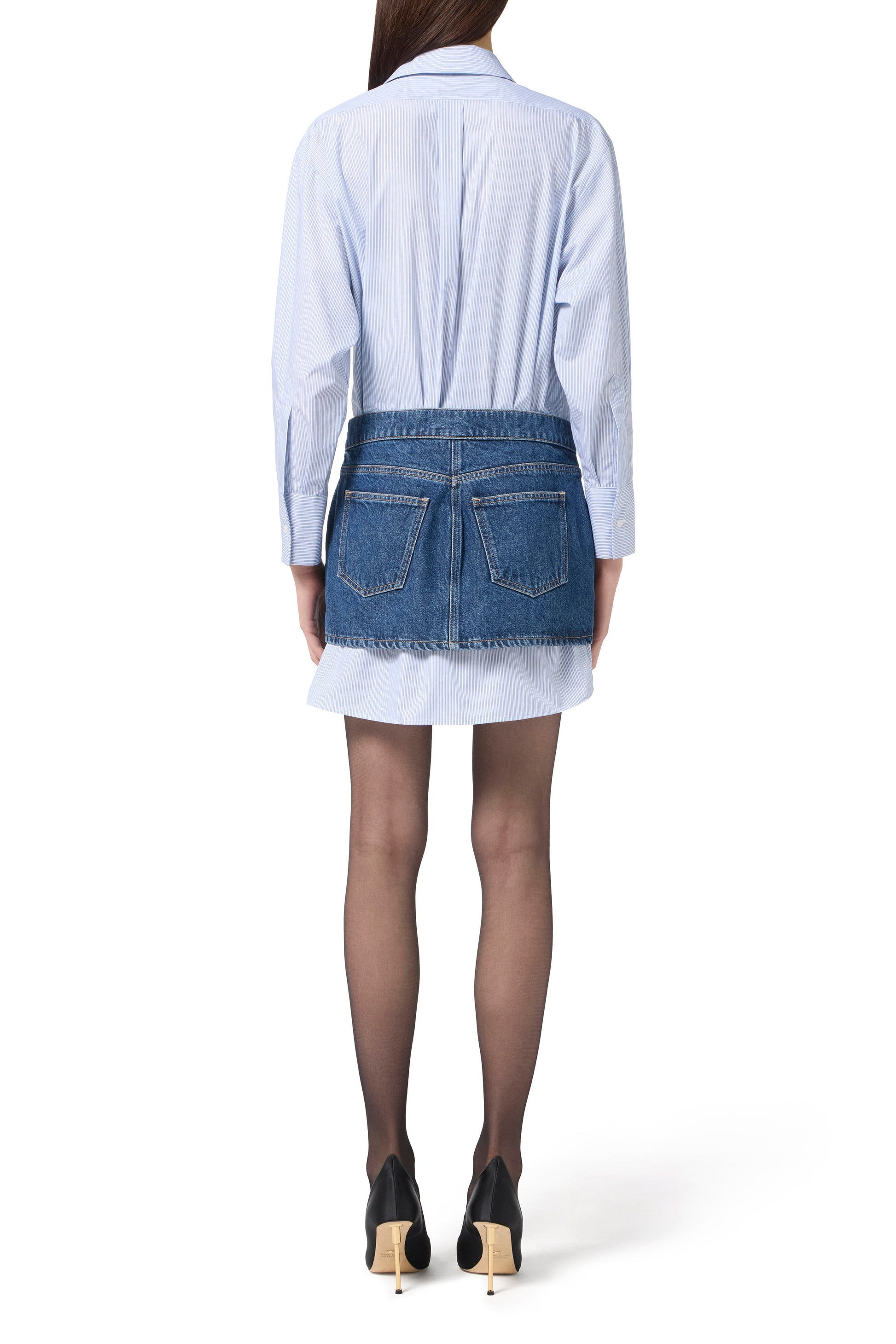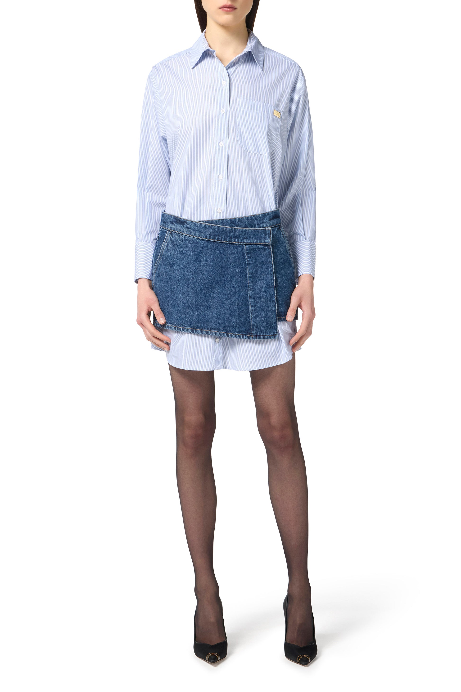 Dress consisting of striped cotton poplin shirt and denim miniskirt. The shirt has a classic collar, long sleeves, breast pocket with golden metal plaque while the miniskirt has a wraparound construction. A dynamic mix of textures and overlays. Regular fit.