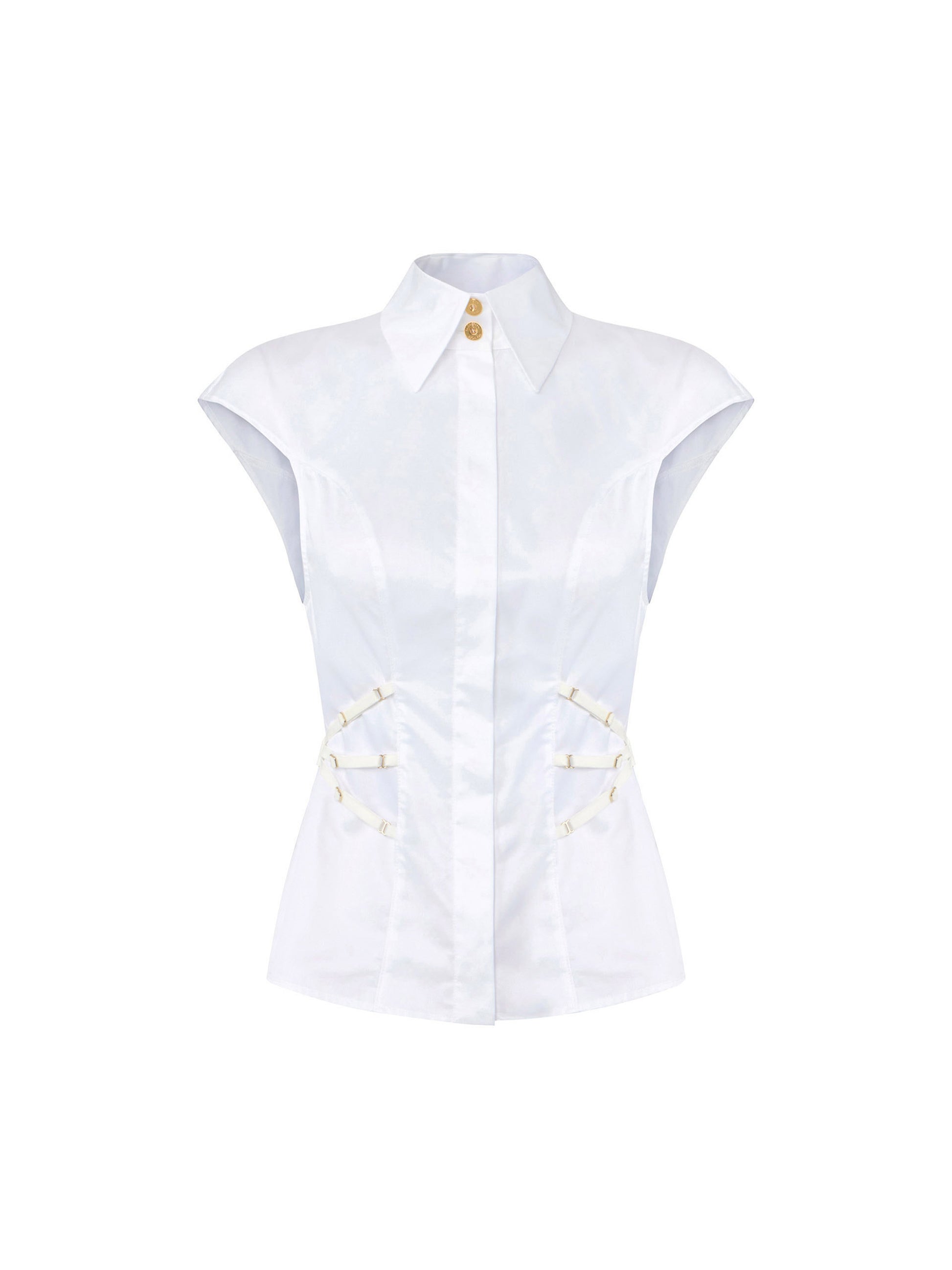 Cotton poplin shirt with classic collar. The hips are defined by lingerie-inspired elastic straps that create a geometric pattern. The first golden metal logo button adds a touch of light. Slim fit.