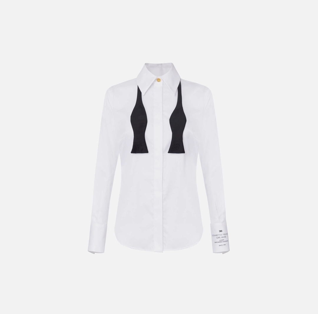 Cotton poplin shirt with slim fit. The garment has a classic collar embellished with a visible golden metal button. The sleeves have wide cuffs, one of which is personalised with the collection print in a contrasting colour.