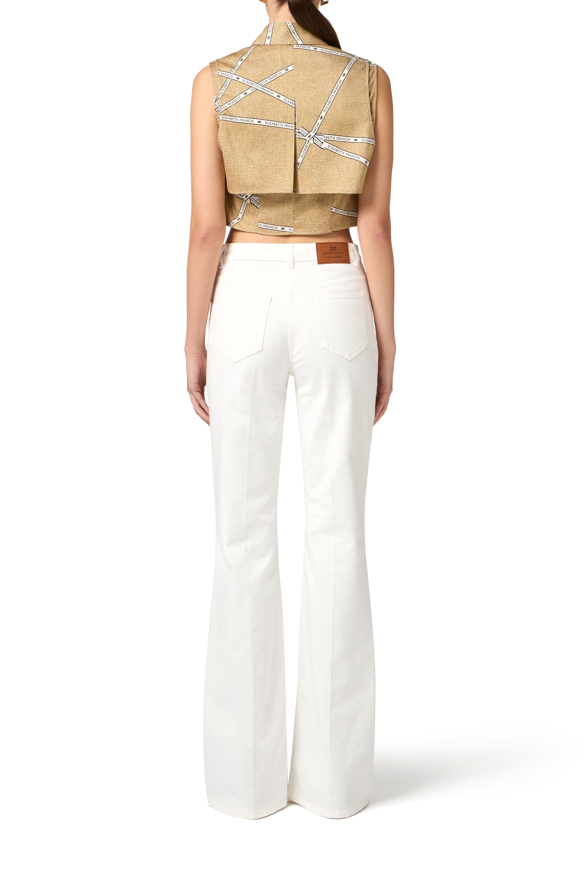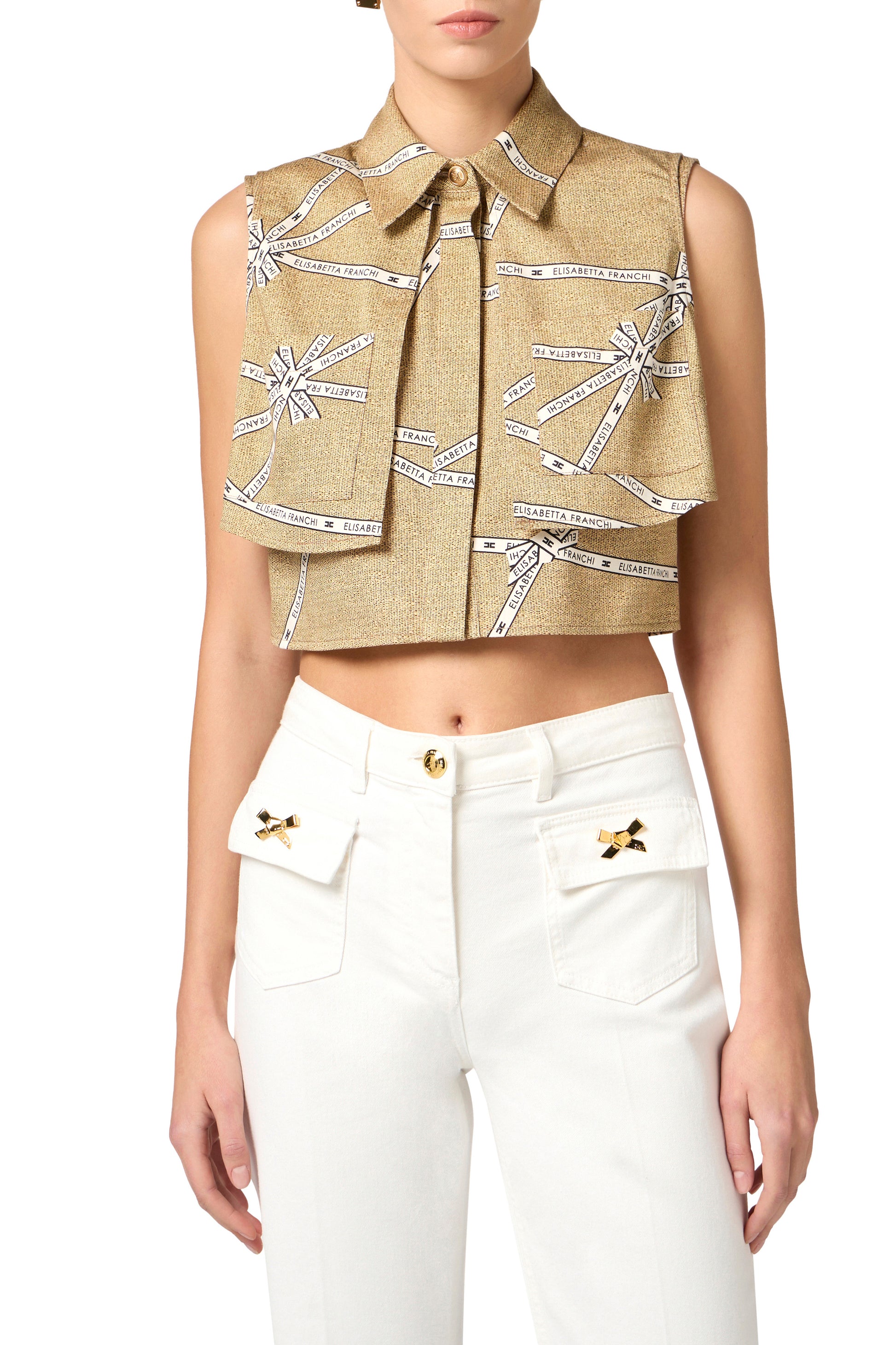 Sleeveless cotton shirt with regular collar and boxy cut. The bib construction gives three-dimensional volumes together with the patch pockets. Protagonist is the all-over multicoloured pattern that mixes iconic collection motifs such as ribbons with logo and raffia-effect print. Regular fit.