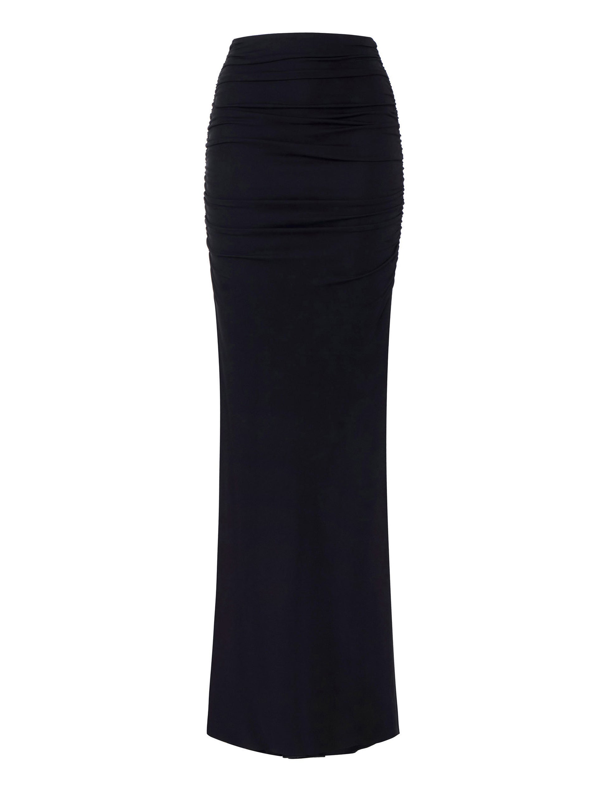 Long skirt in crêpe jersey fabric. It features an elaborate draping that wraps around the hips with a horizontal pattern and the back with a radial pattern. Slim fit.