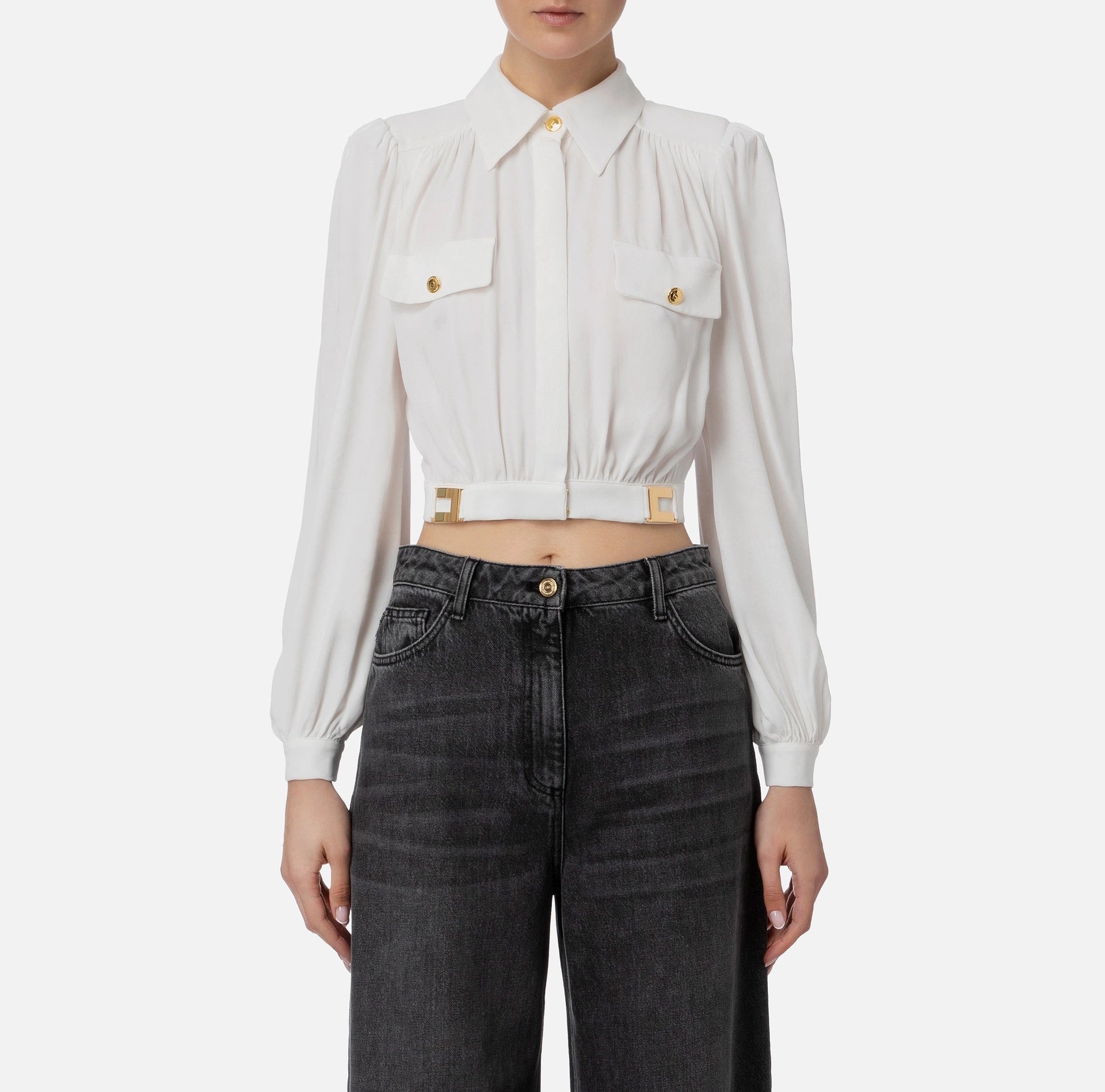 Crop blouse in double viscose georgette fabric with pockets at breast height. It features gathered sleeves and a waistband enriched with golden metal plaques