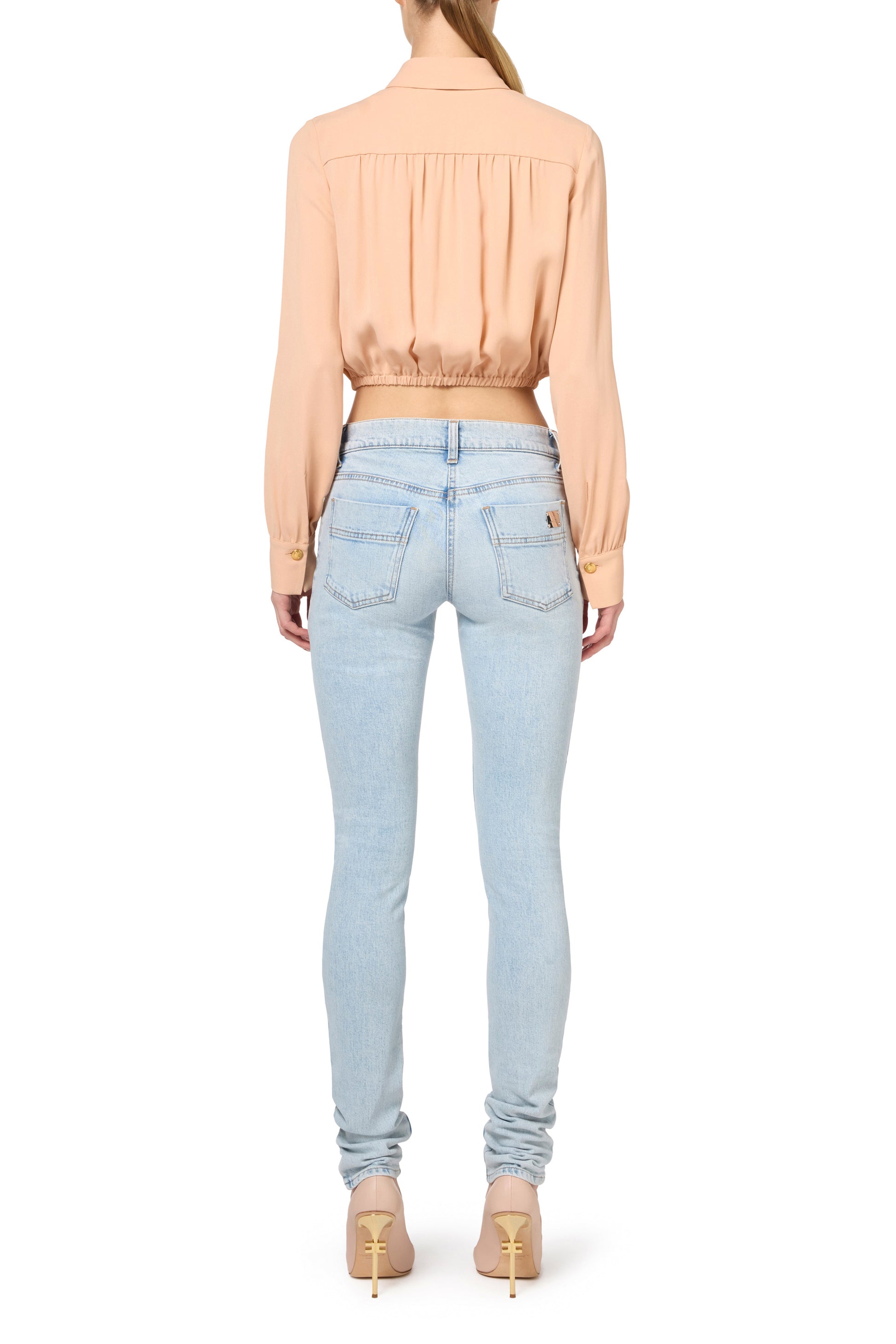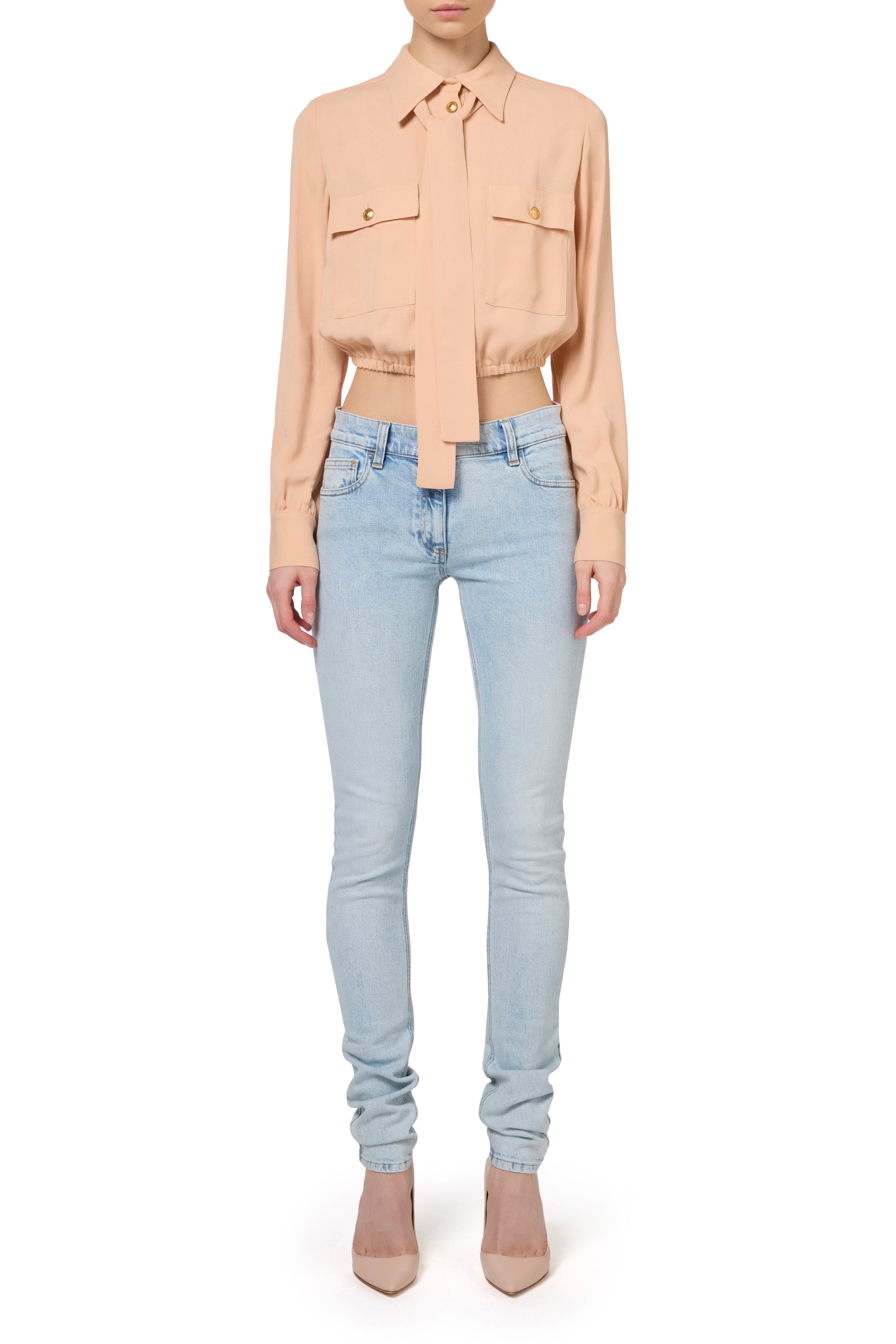 Cropped georgette blouse with long sleeves, pockets at breast height and an elasticated hem. It features a foulard scarf neck.