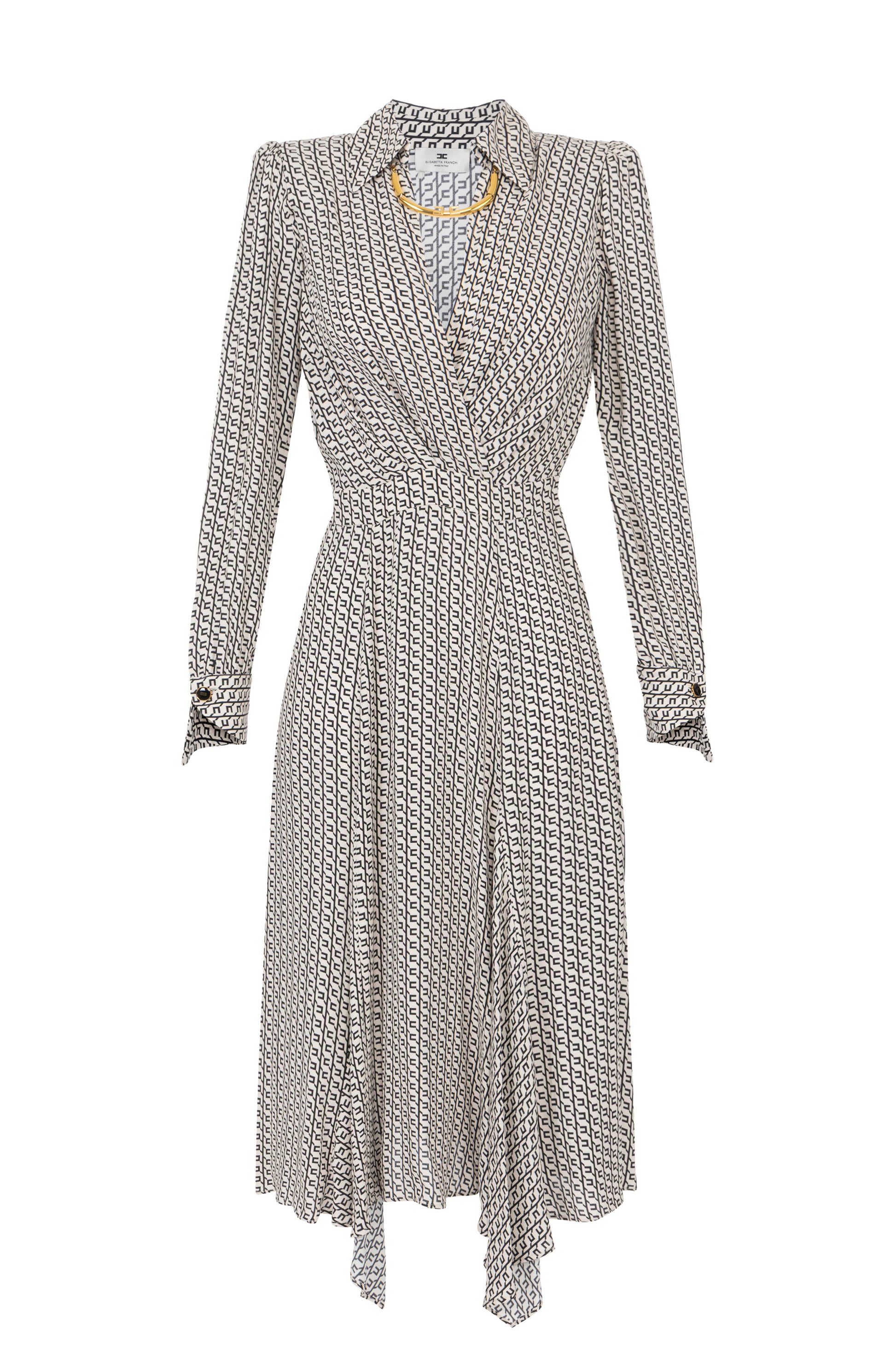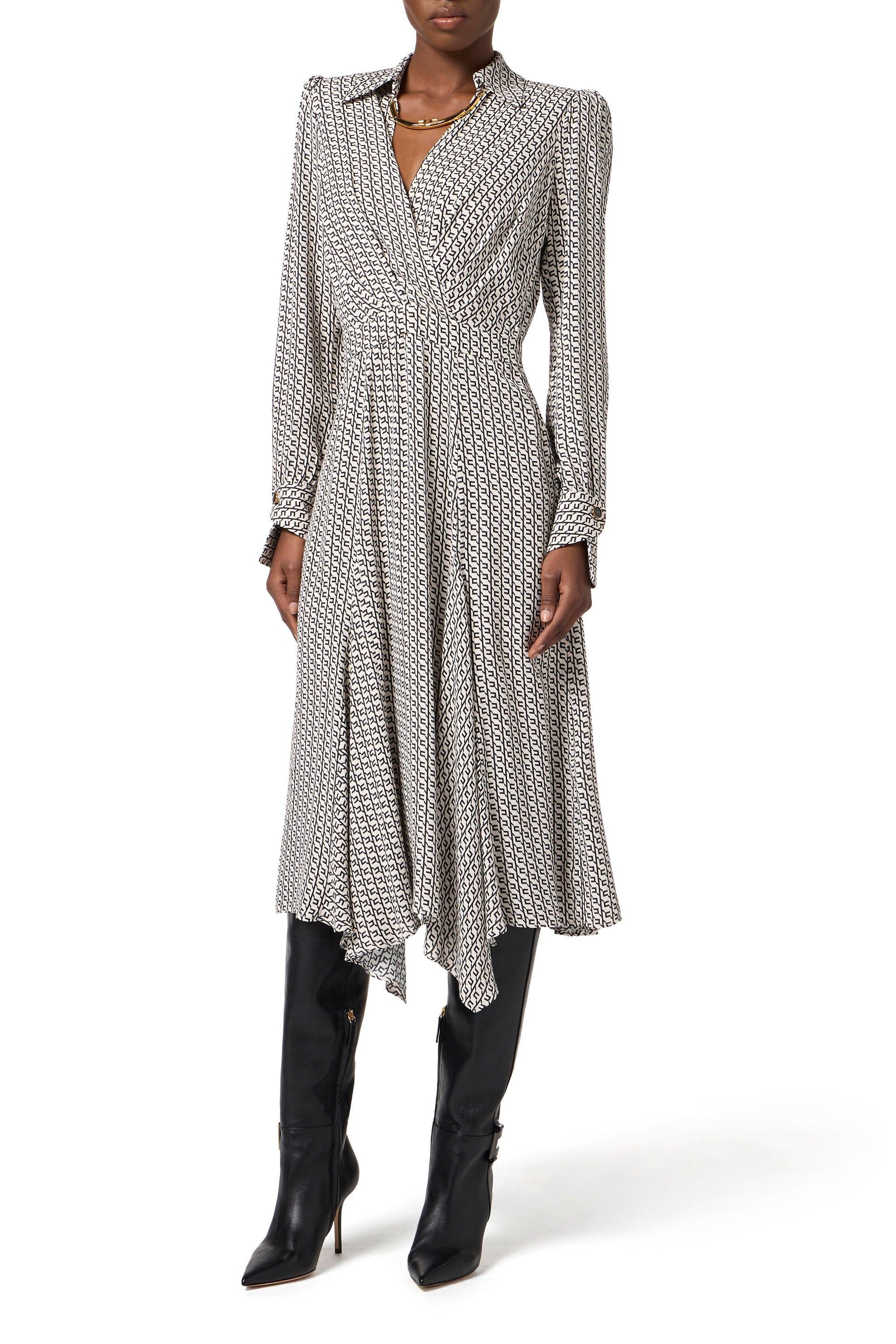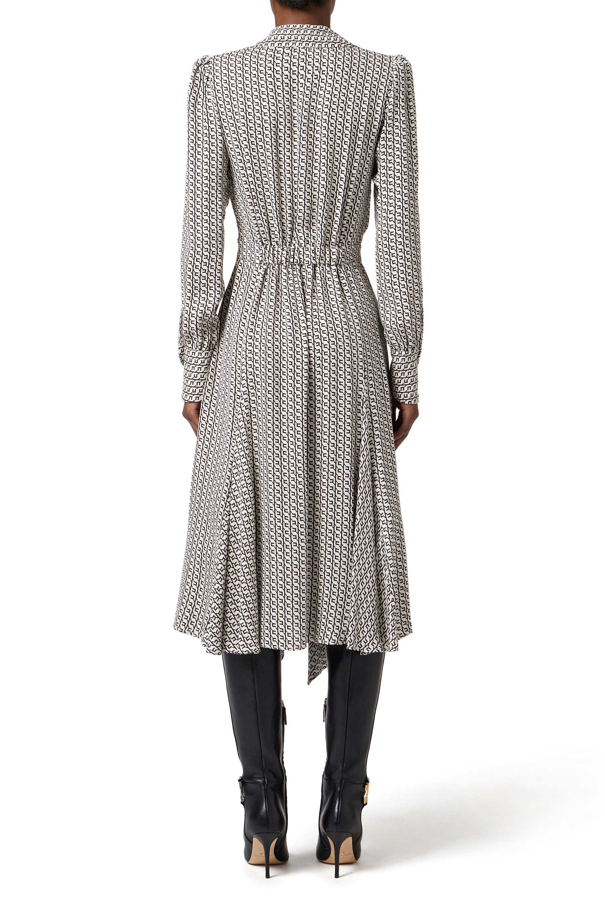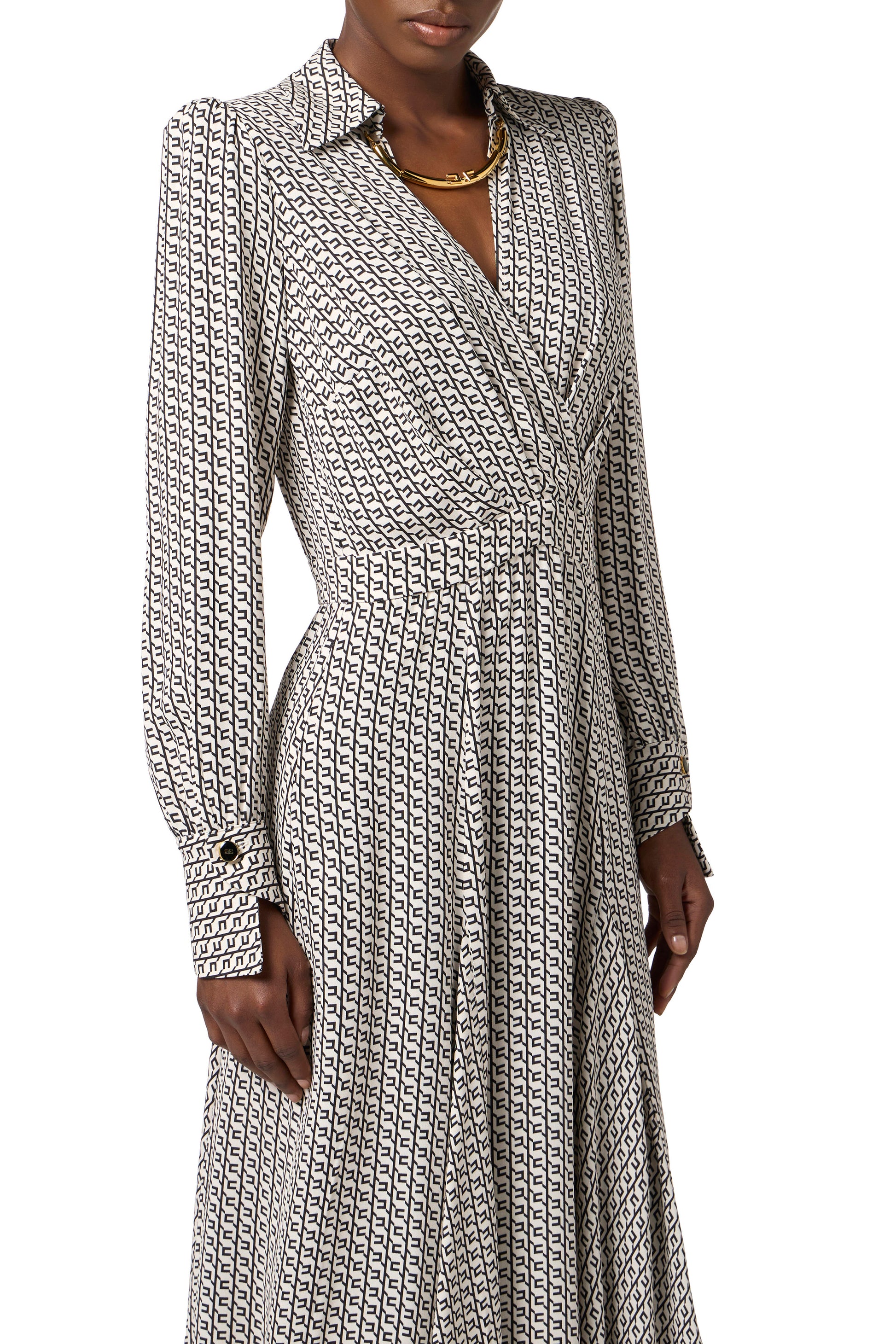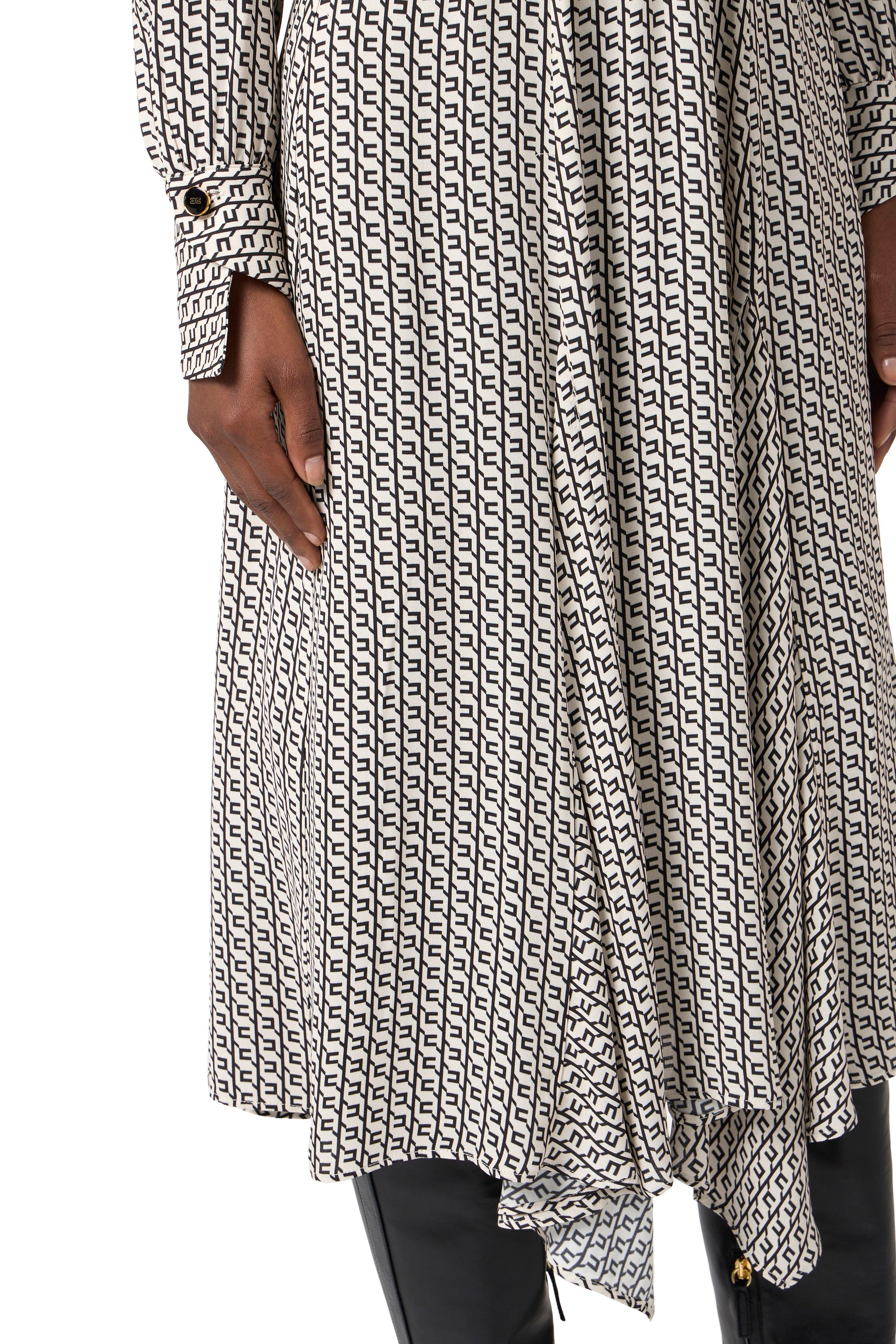 Shirt-dress in georgette fabric with slim fit. The dress has a shirt collar with a crossover V-neck, sleeves with asymmetrical cuffs, and a skirt with pleats to enhance the flared line. The detachable tubular logo necklace and geometric print give light and movement.