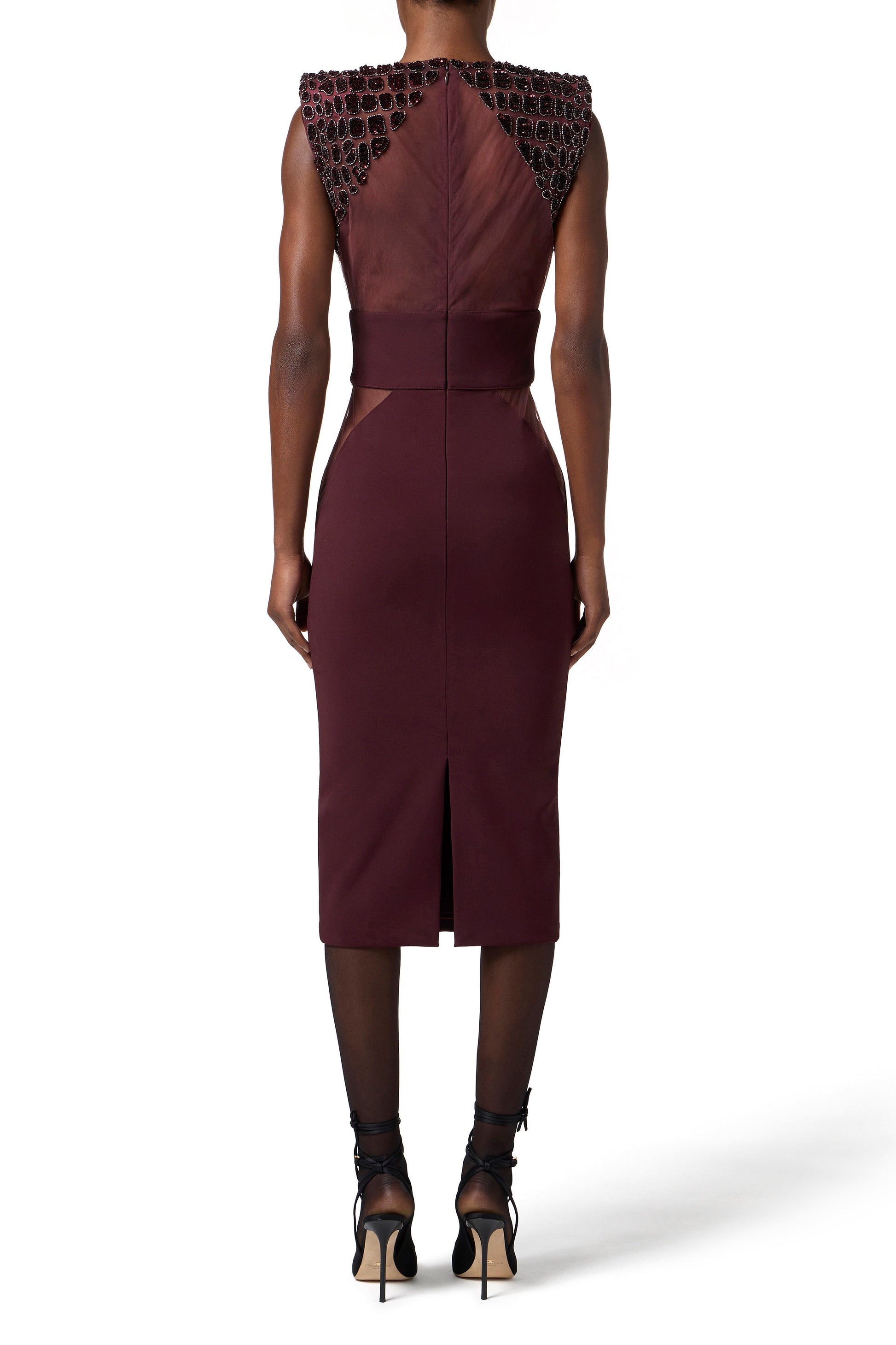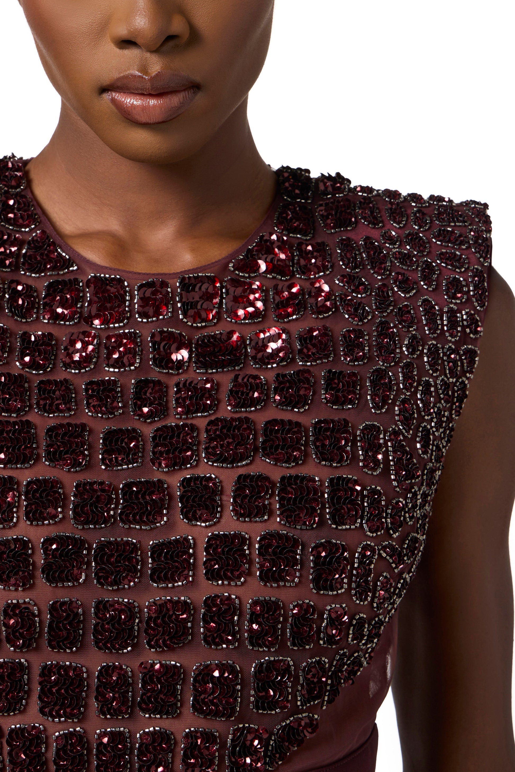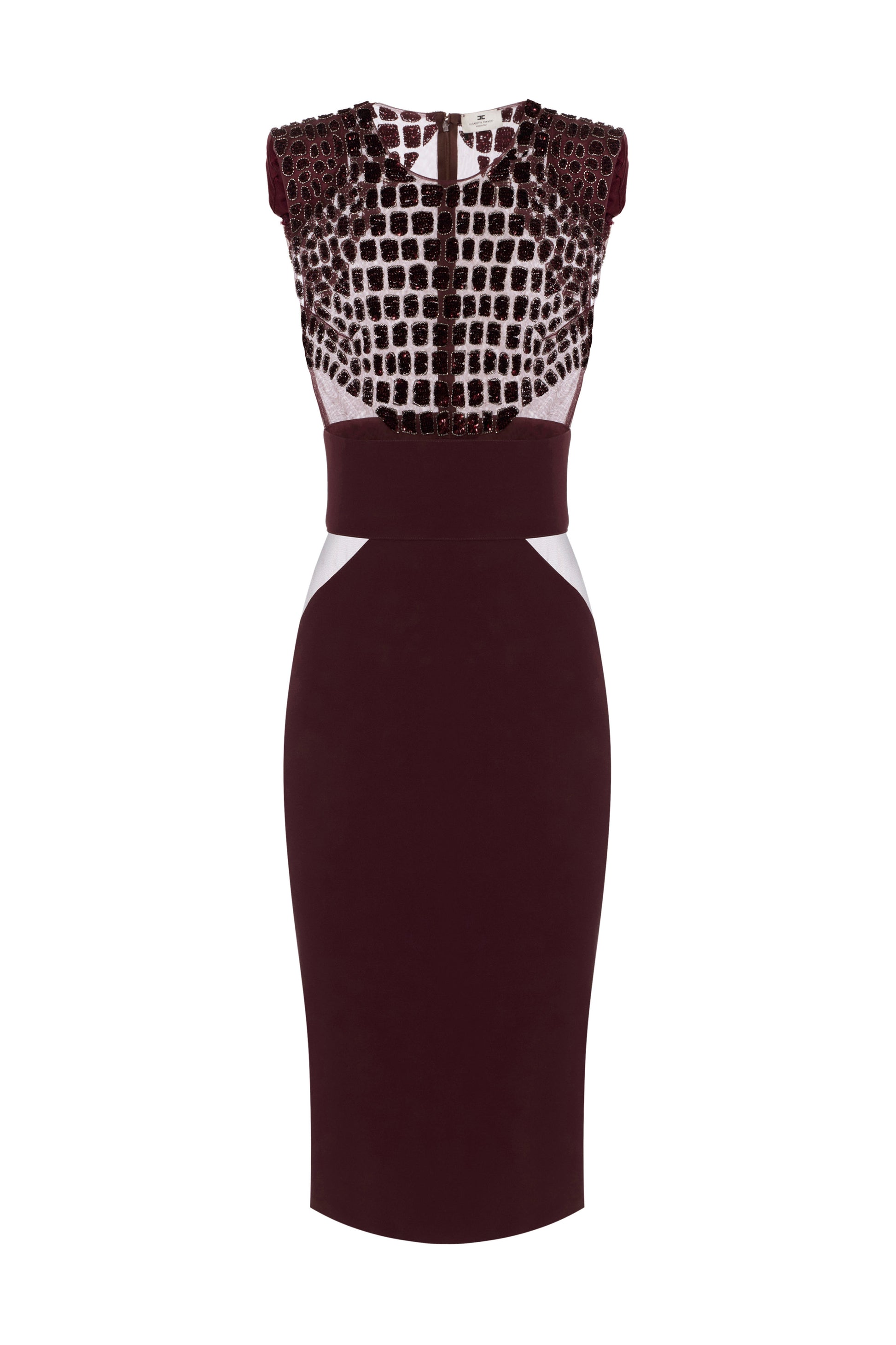 Midi dress in lightweight crêpe fabric with slim fit. The dress has structured shoulders and is characterised by a top embellished with bright embroideries with crocodile-effect design, giving light and three-dimensional texture. Cut-outs with tulle inserts enhance the bold line of the garment and draw a geometric silhouette.