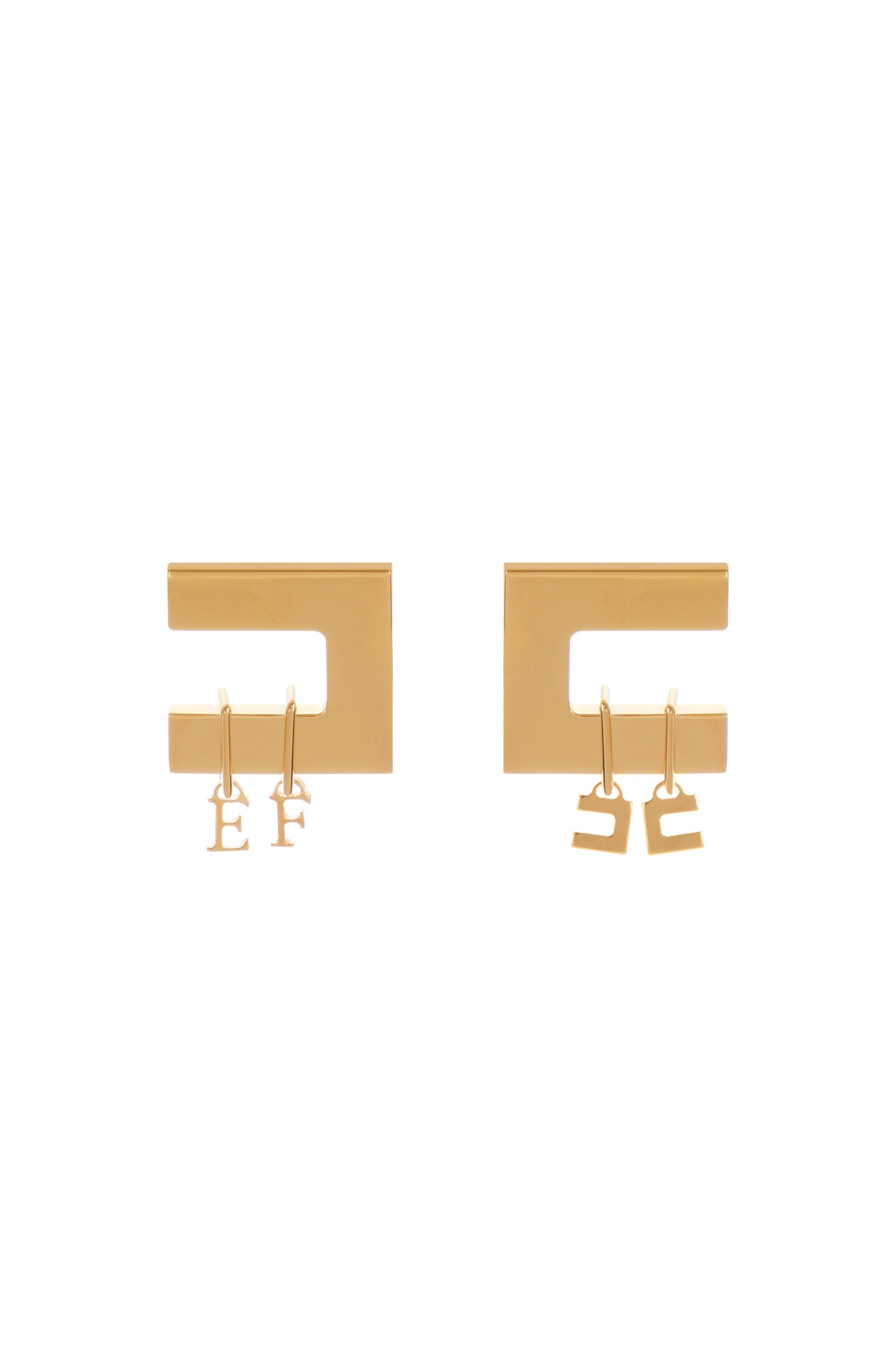 Metal earrings with golden finish featuring the double logo in dangling charms, held by small rings on the bottom of the accessory. Clip closure.