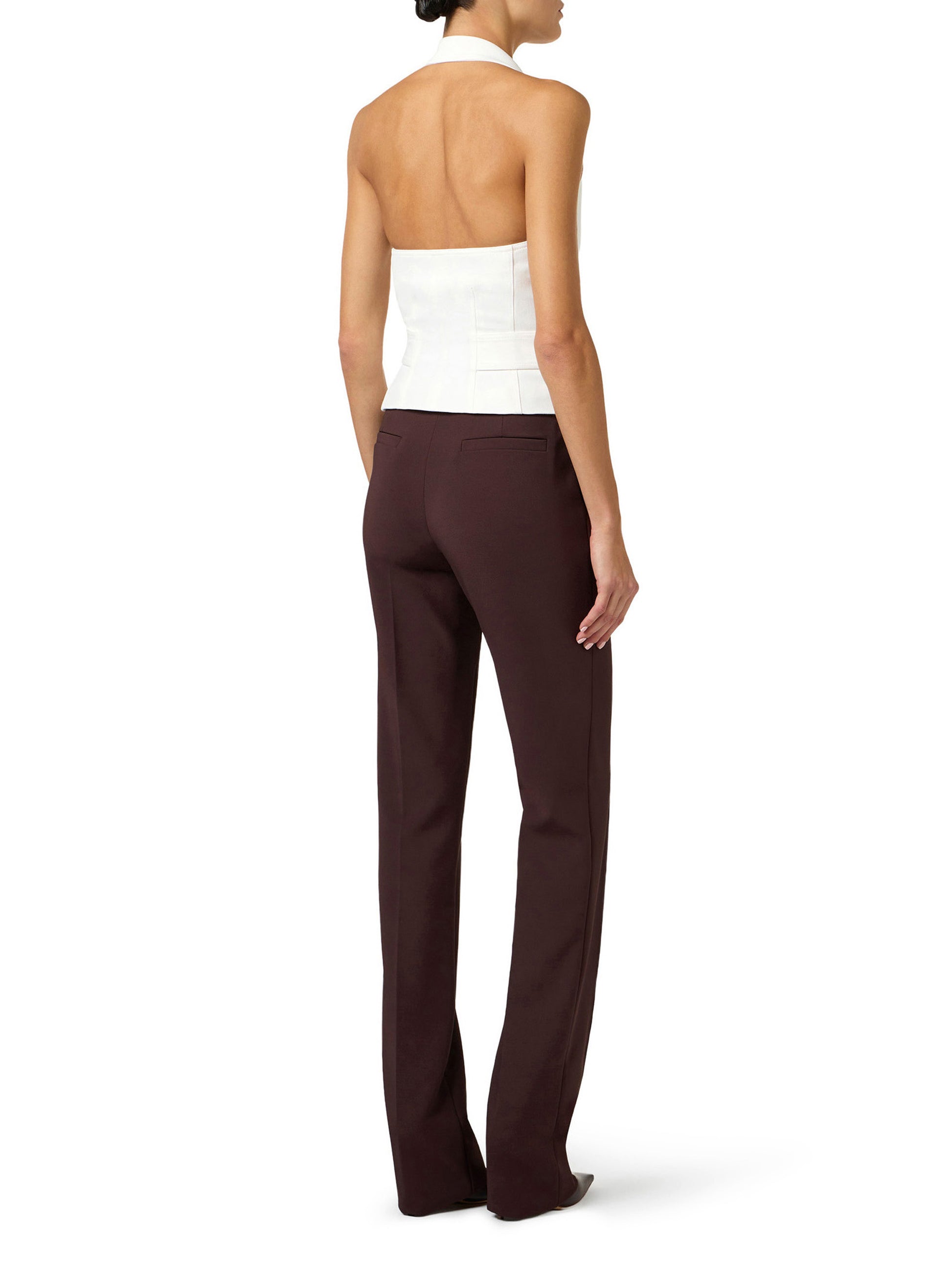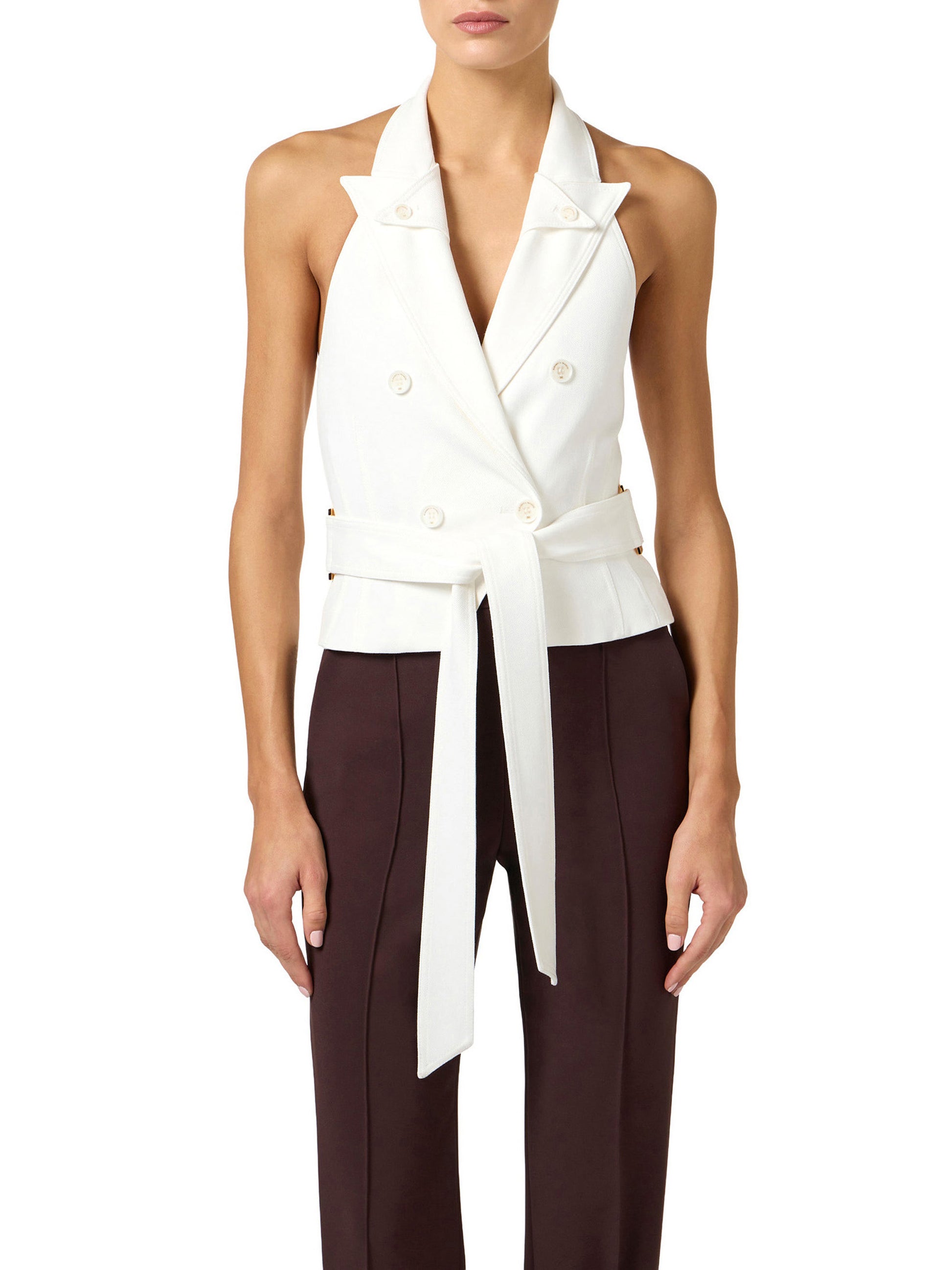 Gabardine waistcoat with halter neck and double lapel. Inspired by the iconic trench coat, it features a double-breasted fastening and a sash belt to be tied at the waist, decorated with golden metal rings. Slim fit.