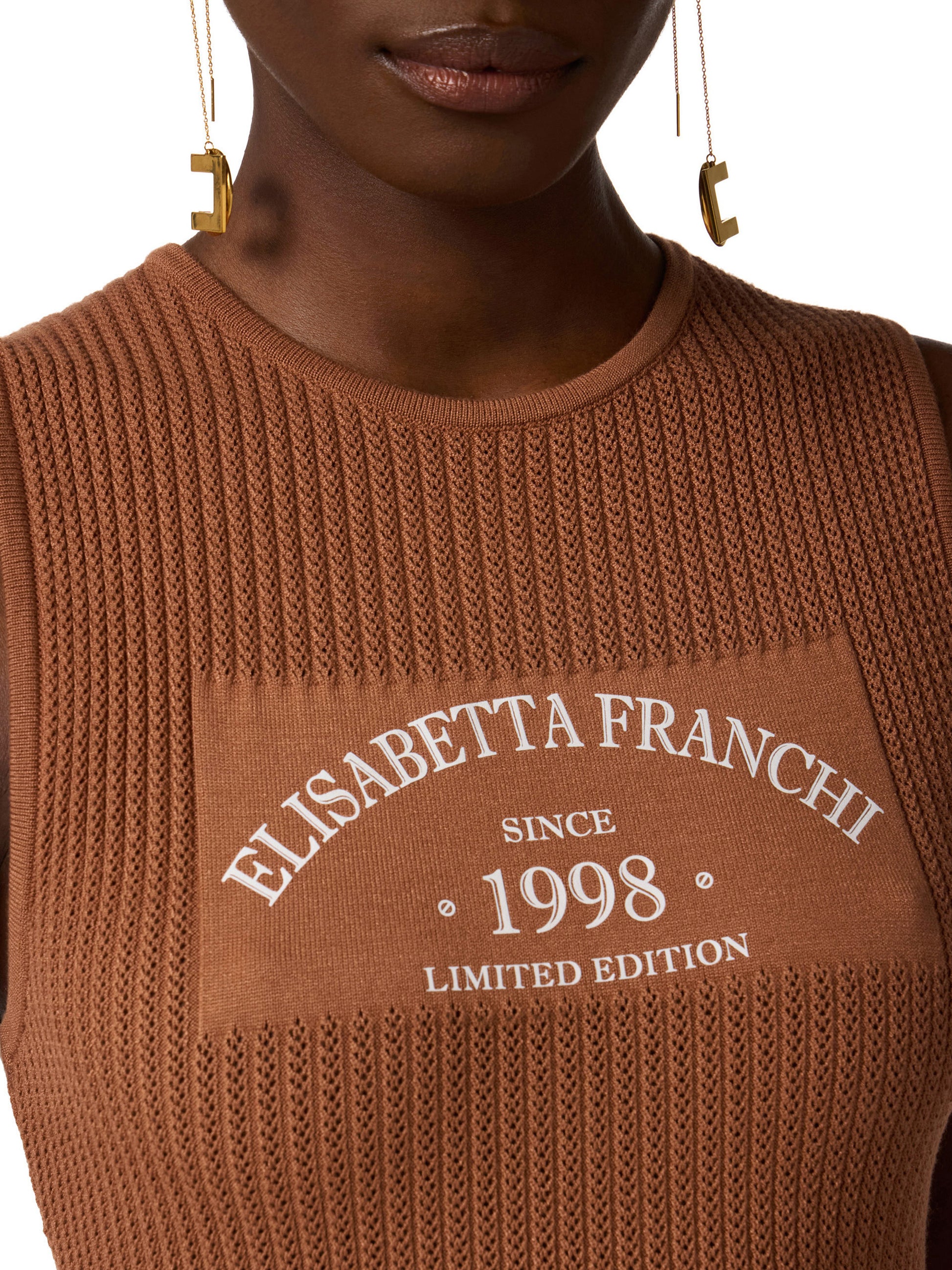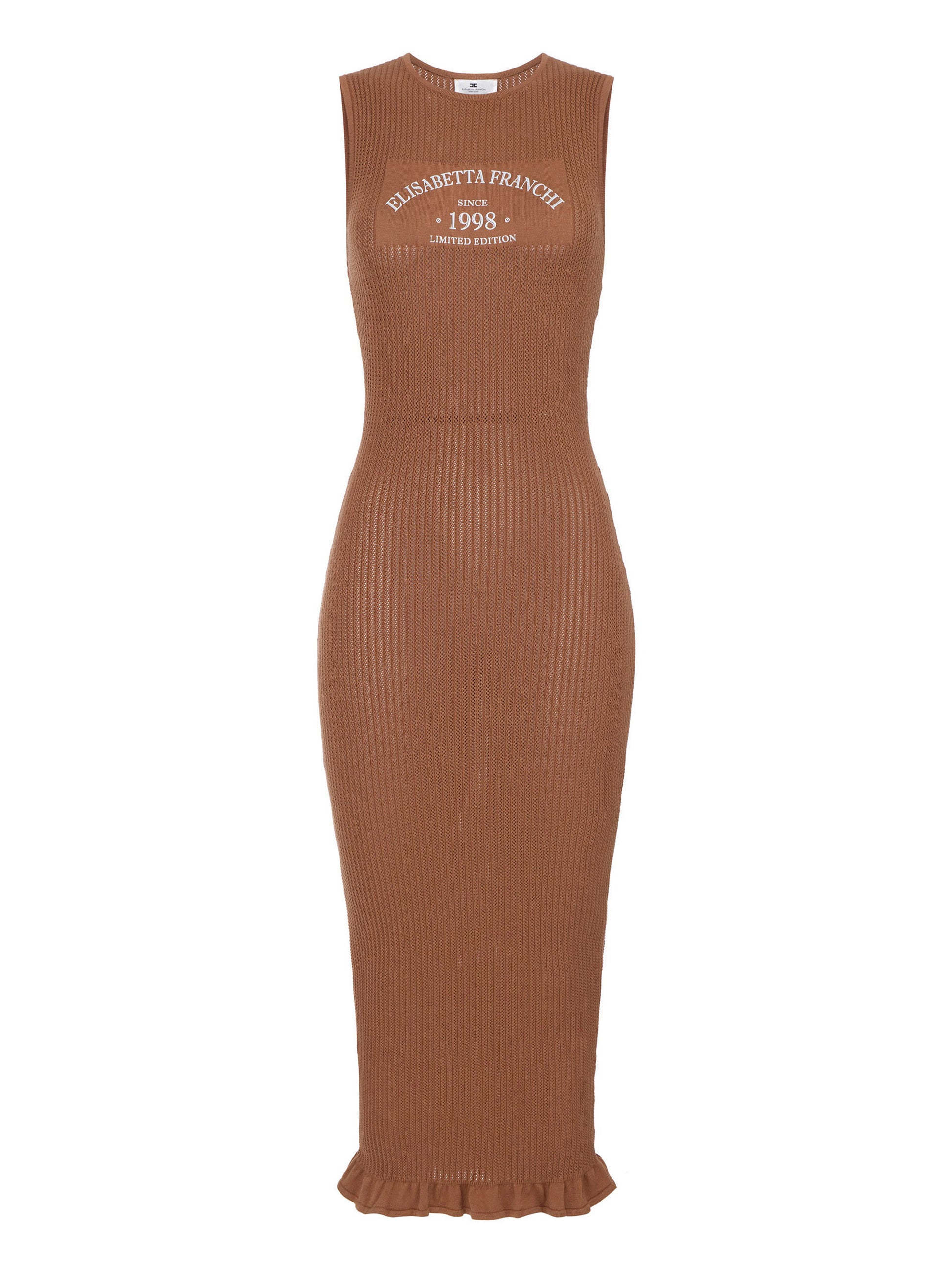 Knit dress with a slim fit. The dress is sleeveless with crew neck and a skirt with flounce at the bottom. It stands out for its ribbed texture and openwork pattern. The focus is on the logo print, in contrasting colours and on smooth fabric for greater definition.