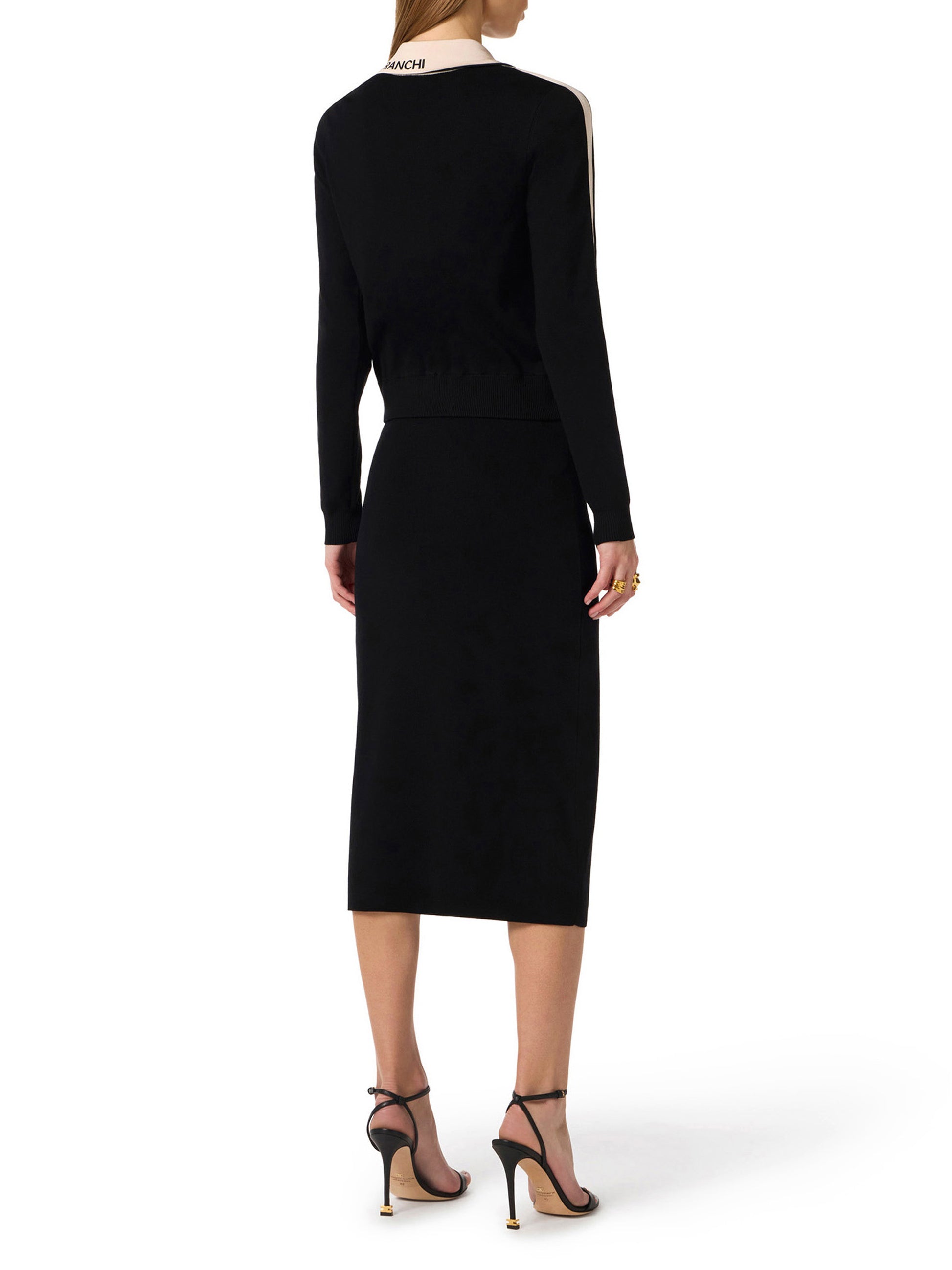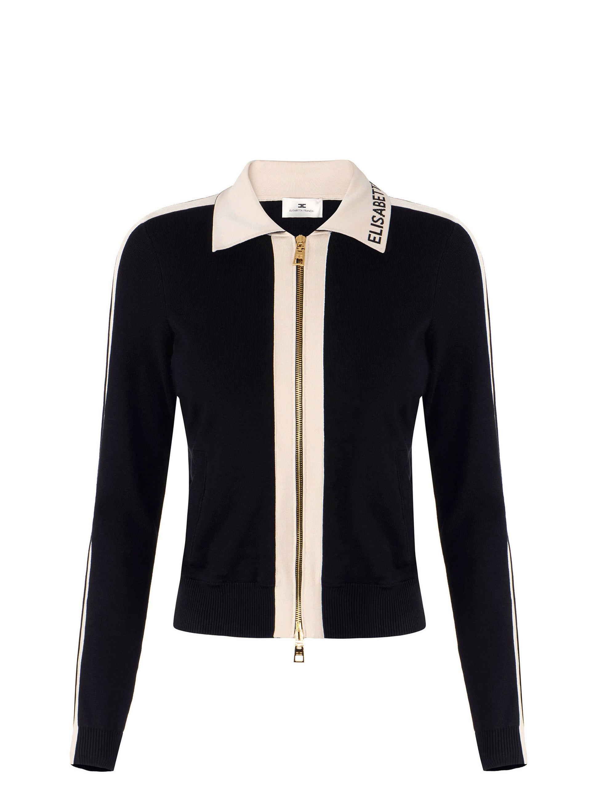 Long-sleeved knit jacket. It is characterised by shiny viscose bands and jacquard fabric applied to the logo on the collar. The contrasting colours emphasise the garment graphic design. The closure with golden metal zip adds a touch of light. Regular fit.