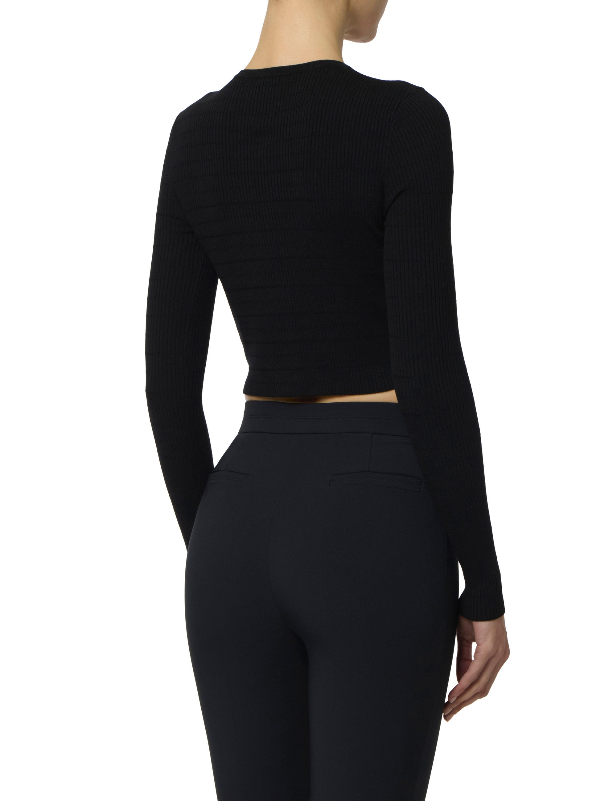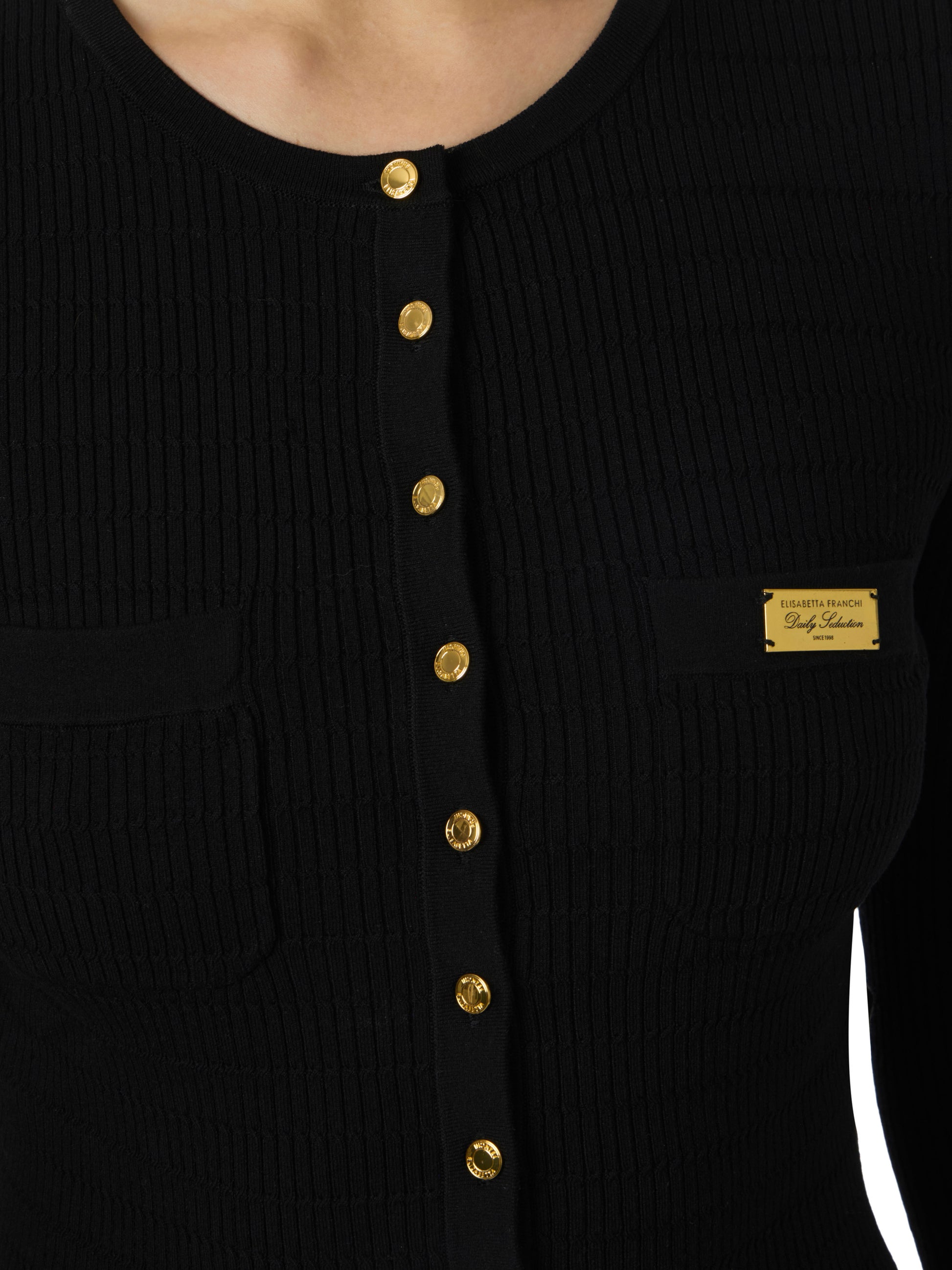Long-sleeved knit cardigan. It features elaborate workmanship, with the weave enlivened by micro-braided ribs along its entire length, creating a dynamic tactile pattern. The golden metal buttons and the plaque with logo and lettering on one of the breast pockets brightens up the garment with a luminous stylish detail. Slim fit.