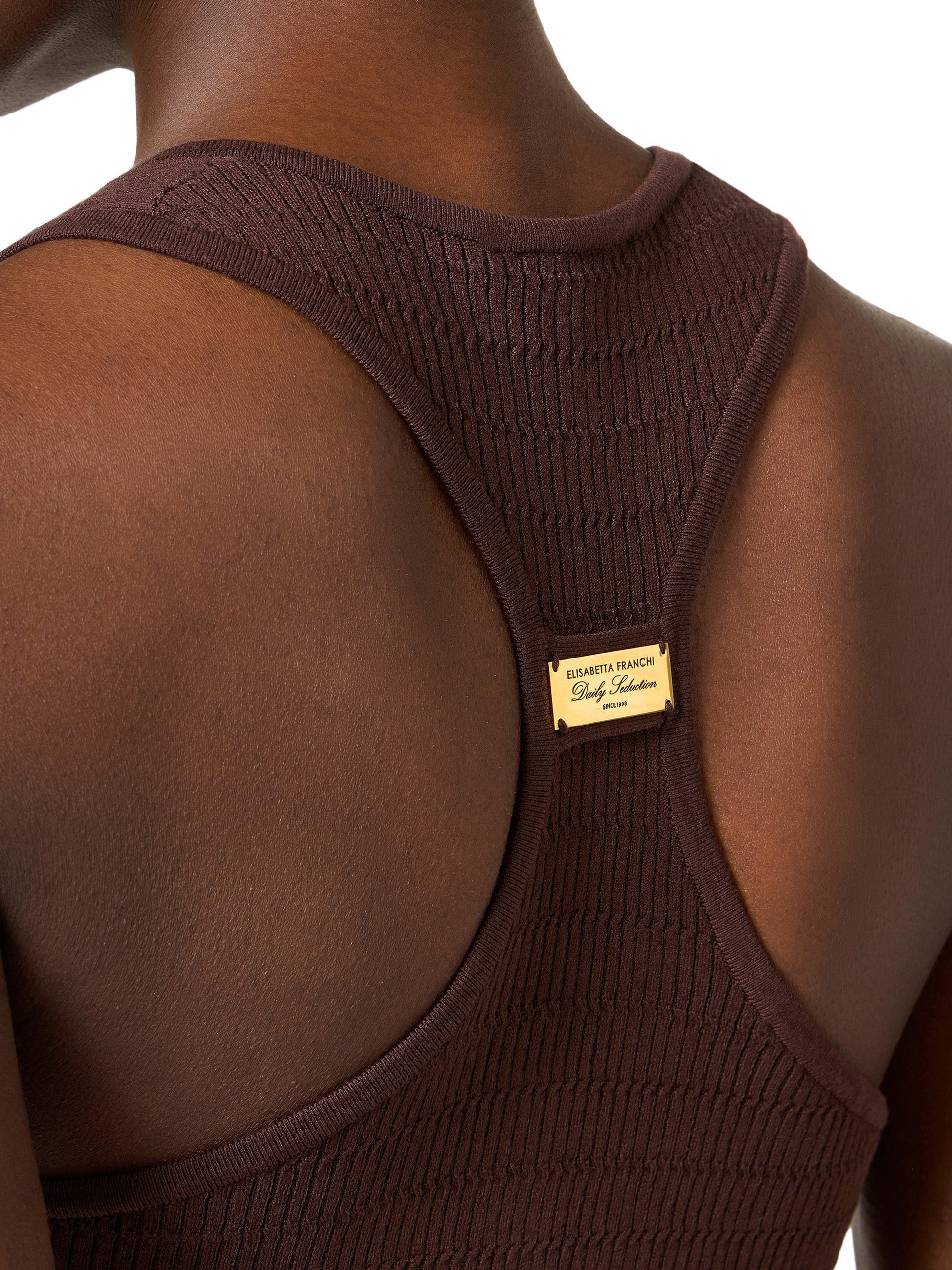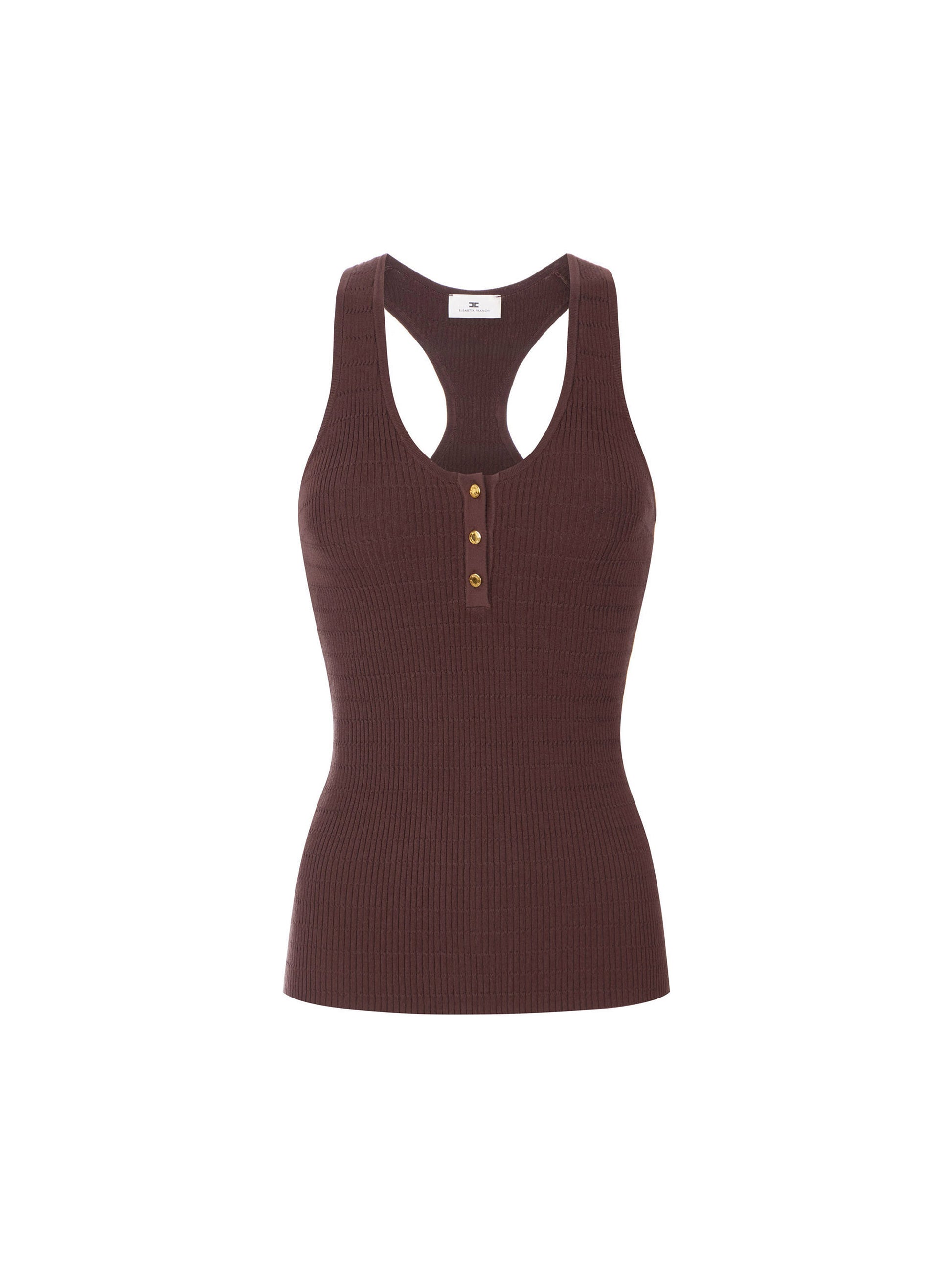 Sleeveless knit top with racerback neckline. The weave is enlivened by micro-braided ribs for a dynamic texture. The golden metal buttons add bright accents at the front, while a logo plaque with lettering shines at the back. Slim fit.