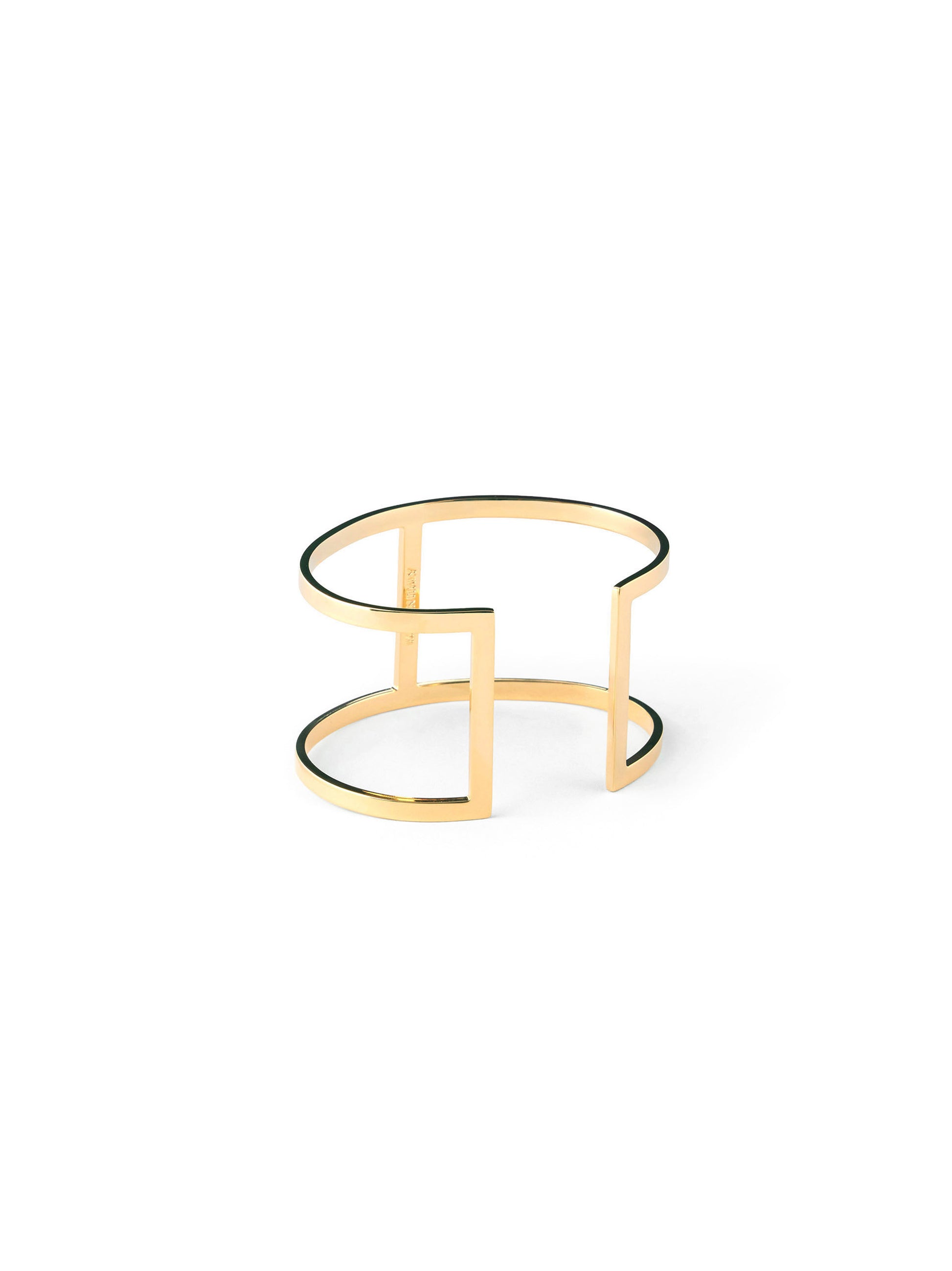 Pair of bracelets made of metal with a golden finish. With their minimalist design, they trace the shape of the logo, elegantly embracing the wrist.
